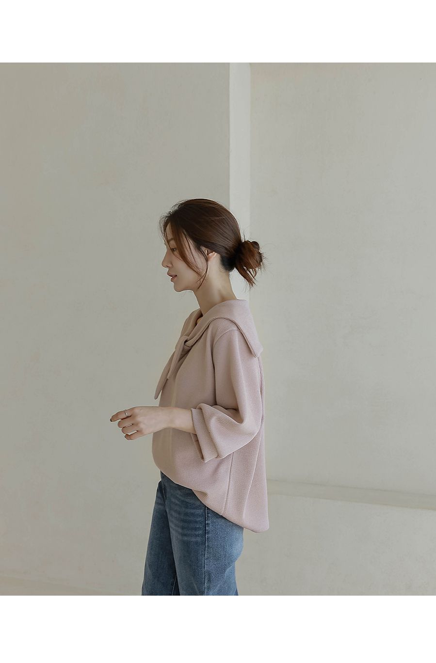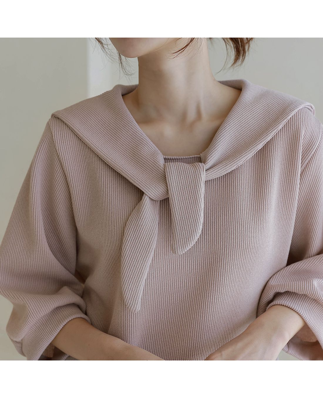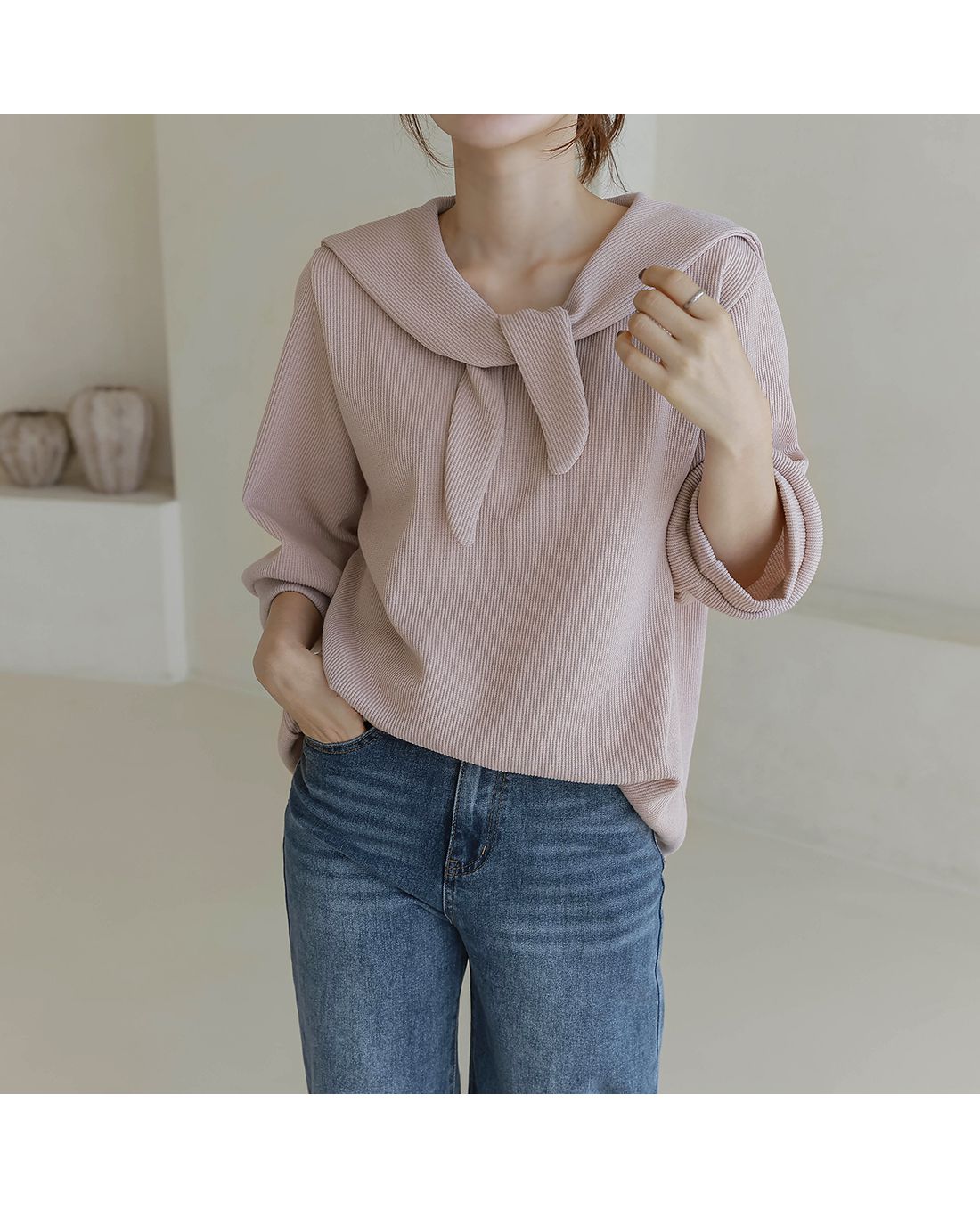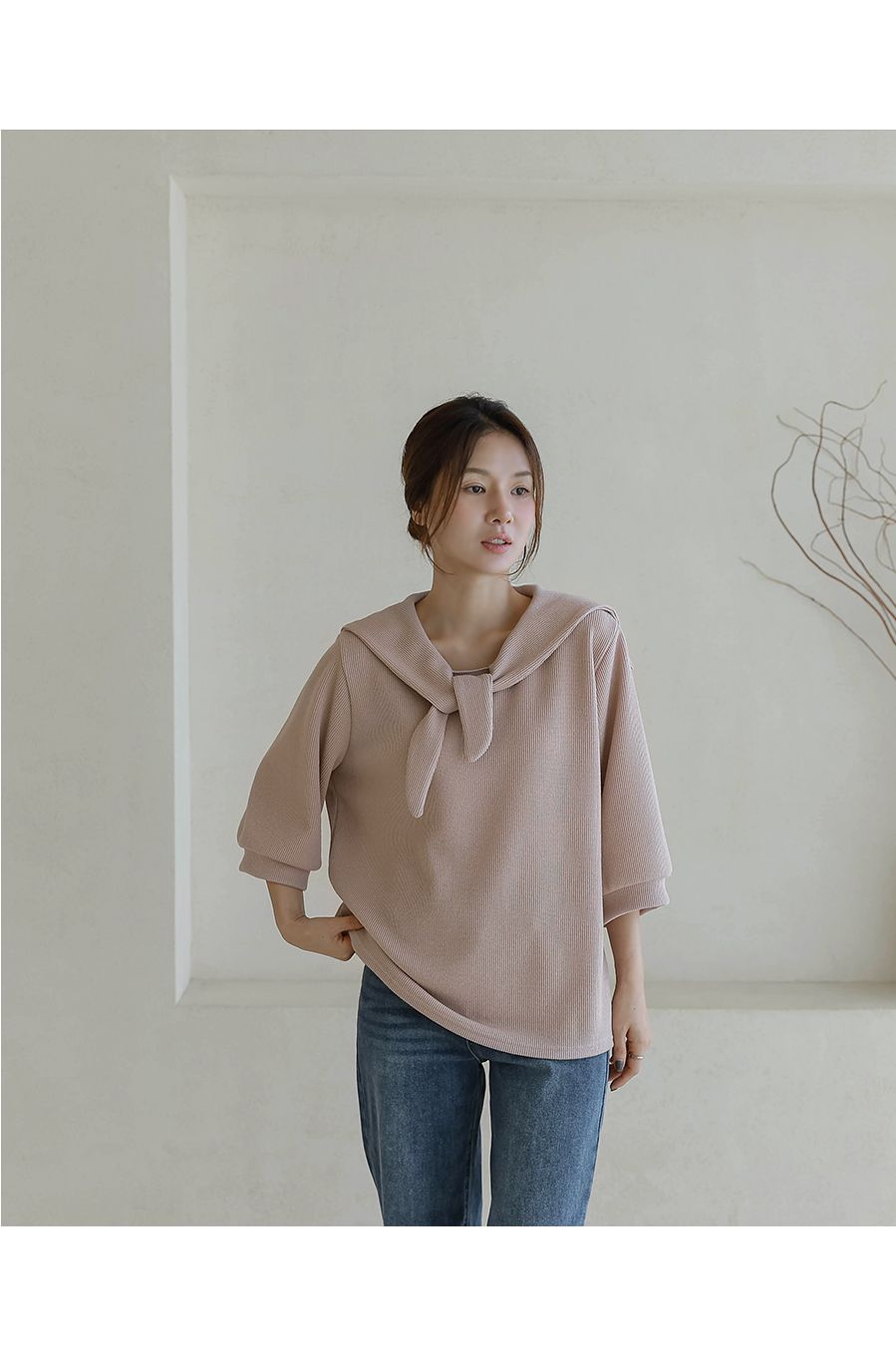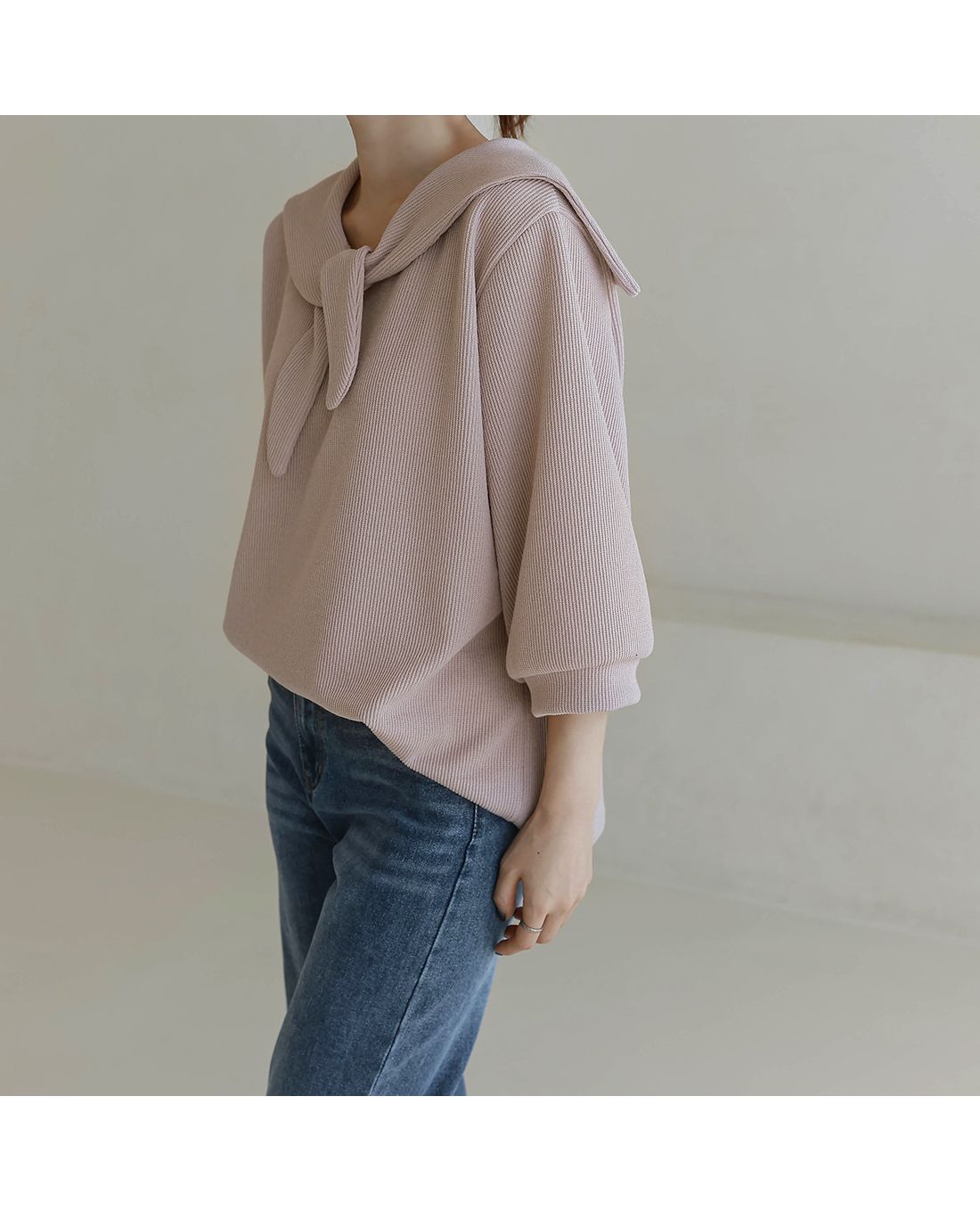 【C55608】韓國BLG 綁結水手領上衣-坑條素面好氣色V領七分袖寬袖★★