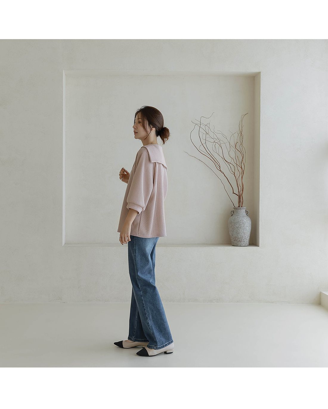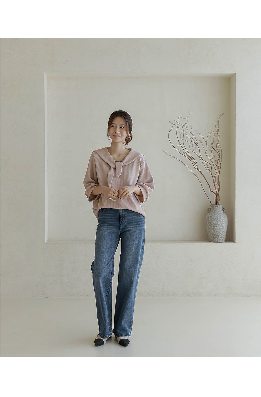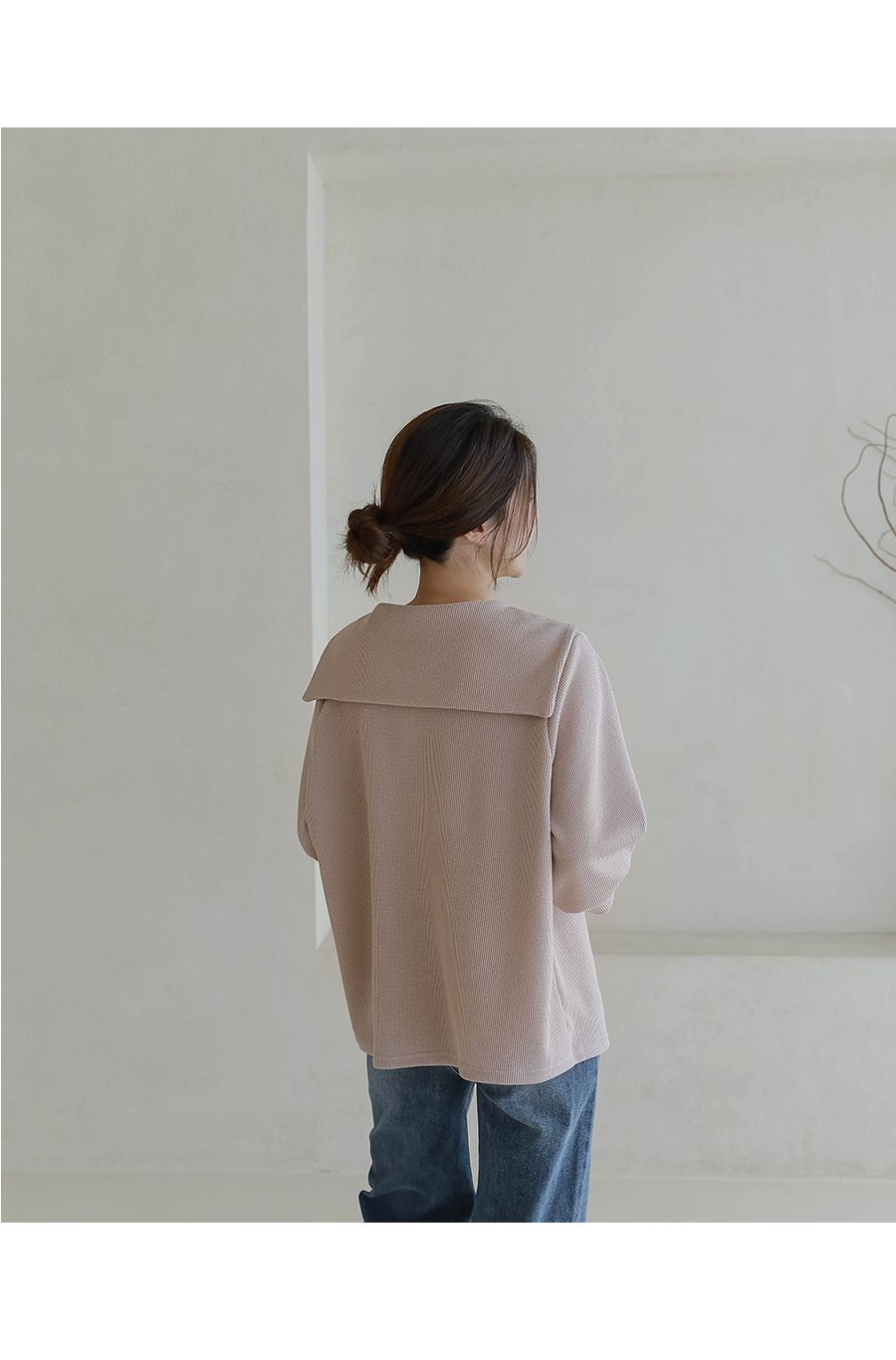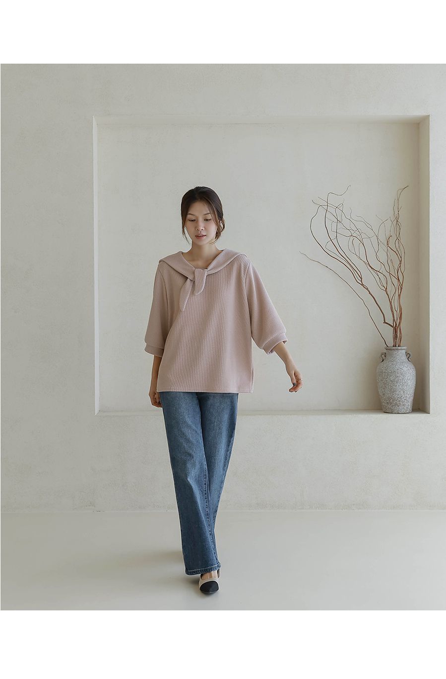 【C55608】韓國BLG 綁結水手領上衣-坑條素面好氣色V領七分袖寬袖★★