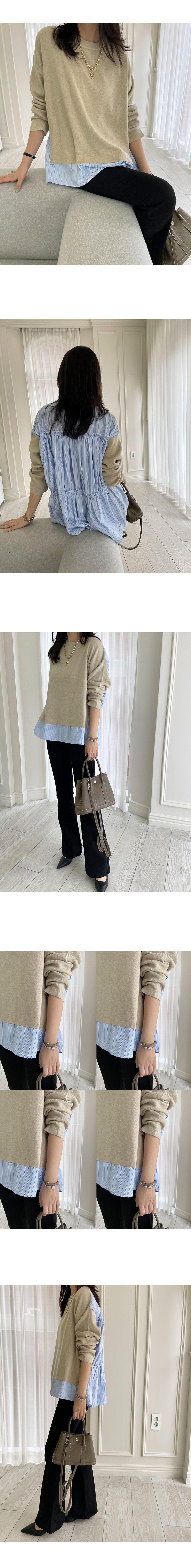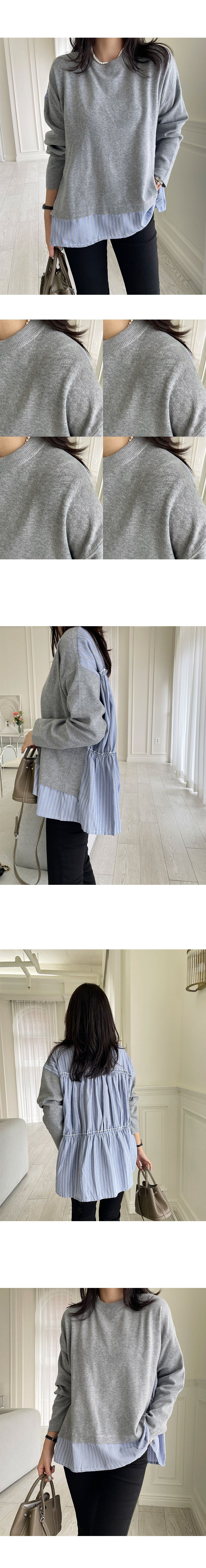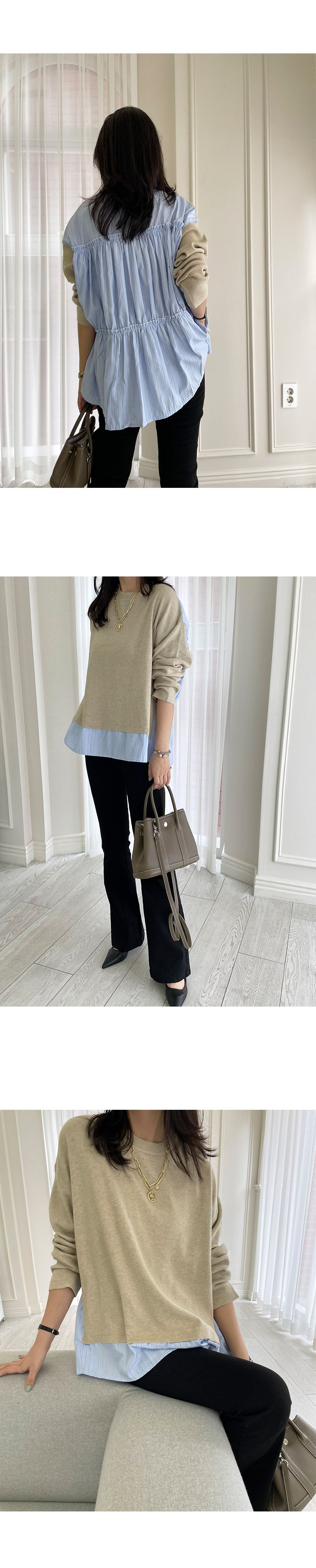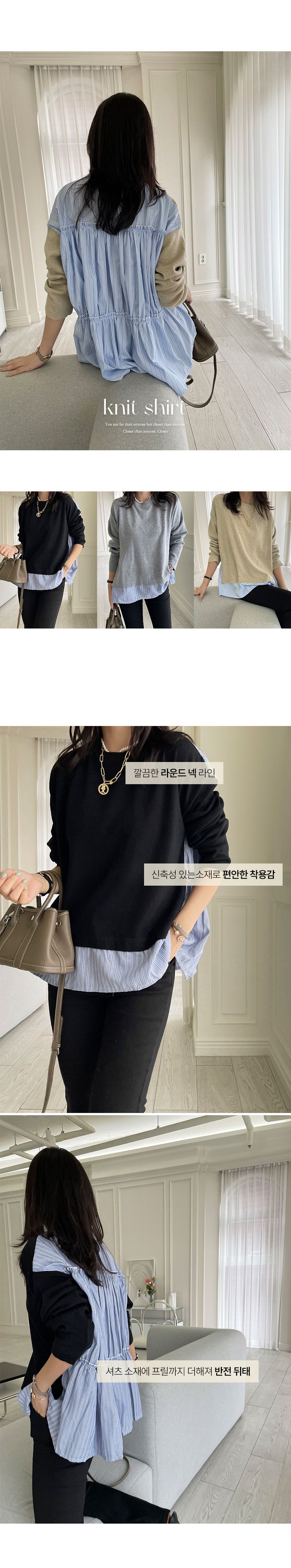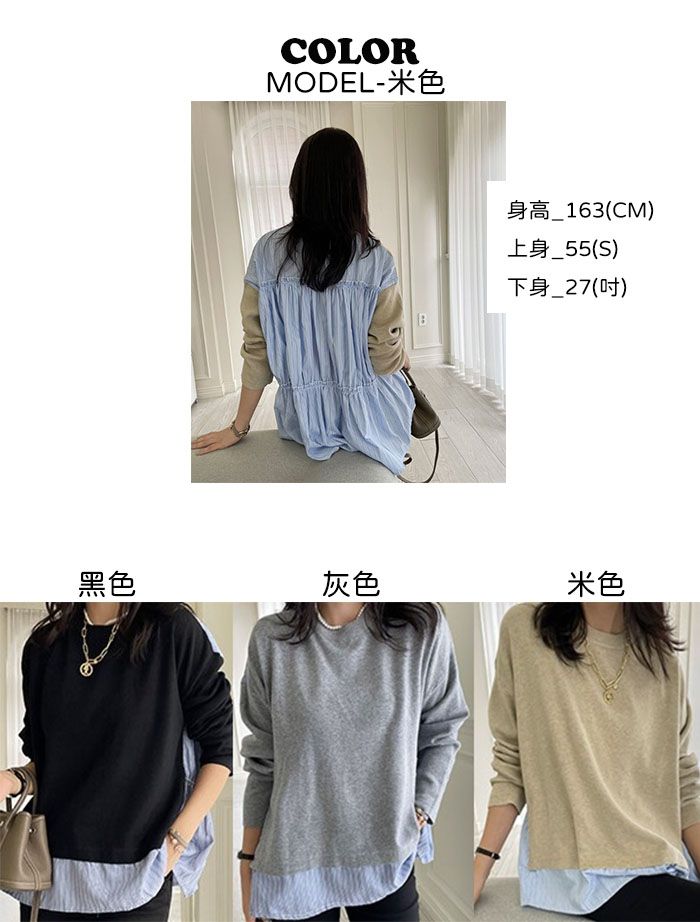 【C55614】韓國MNR 假兩件針織衫-條紋寬鬆拼接OL圓領襯衫長袖上衣