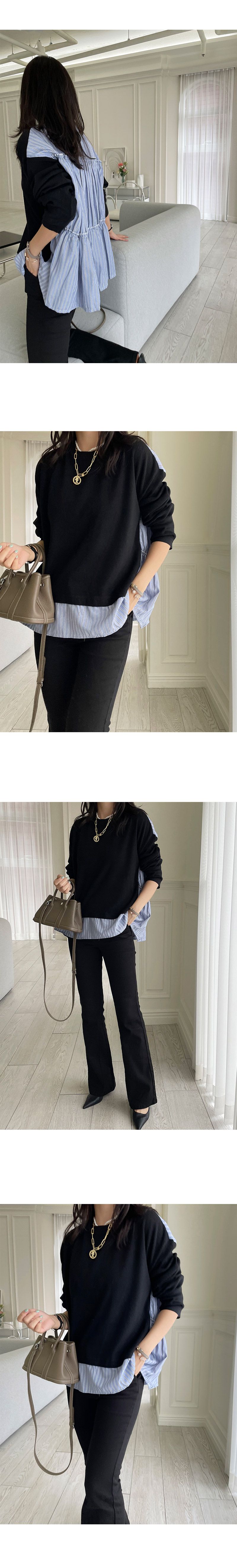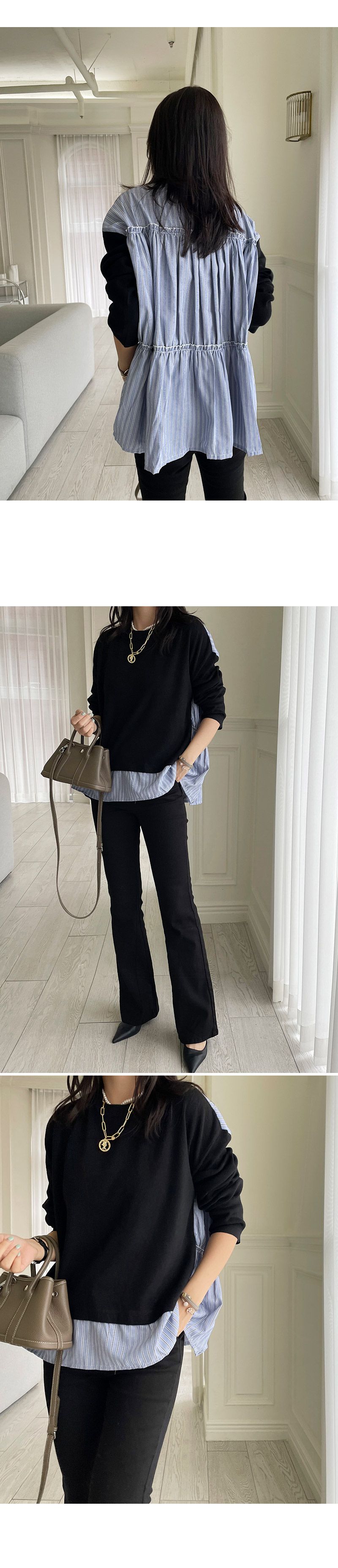 層次感拼接更吸睛/獨特不撞衫/可休閒可正式/高級設計質感-休閒居家簡約百搭假兩件圓領條紋寬鬆壓褶抓皺拼接OL襯衫長袖上衣針織衫黑色灰色米色