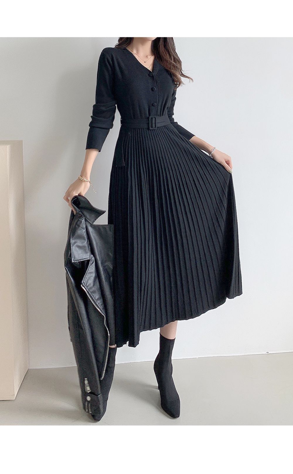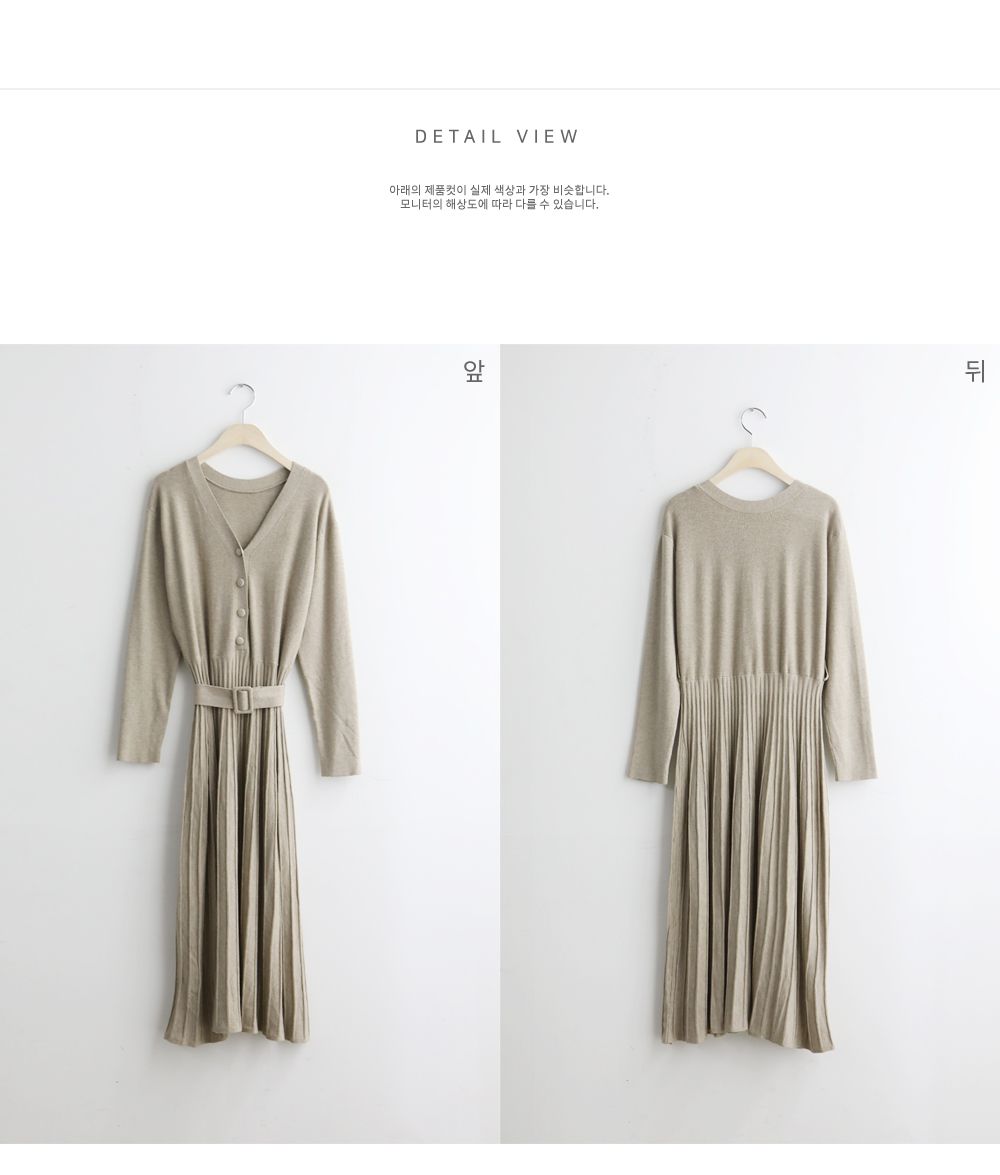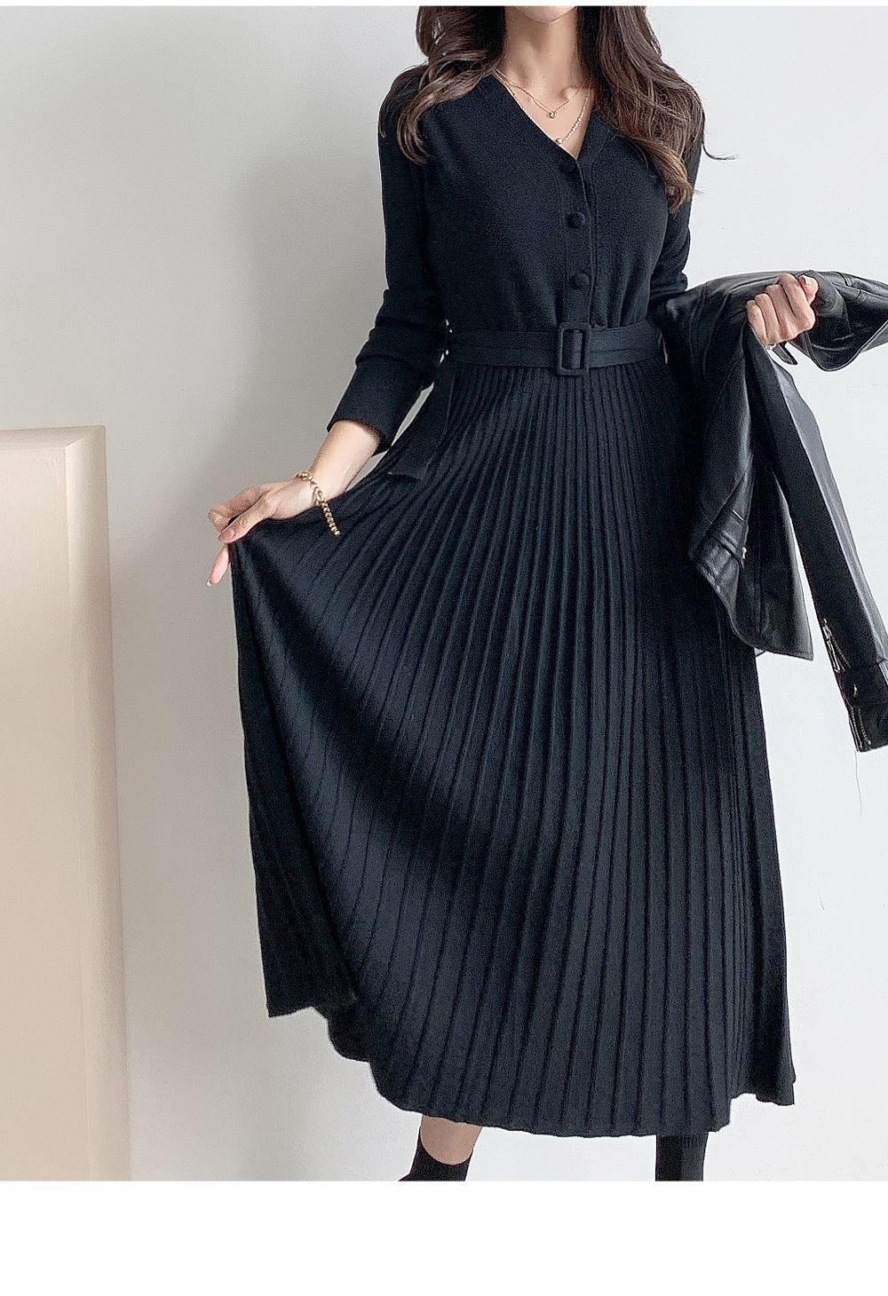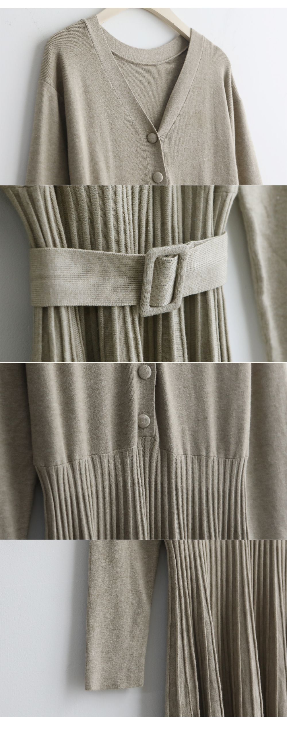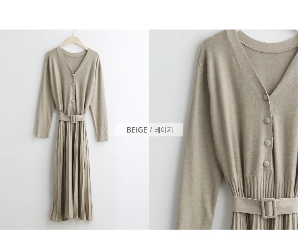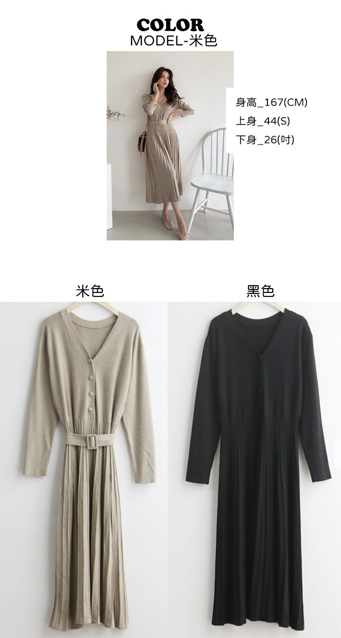 可正式可休閒/附有腰帶超划算/收腰更顯瘦/傘狀造型修飾下半身-休閒居家簡約百搭針織V領半開襟立體坑條素面皮帶長袖連身裙洋裝米色黑色