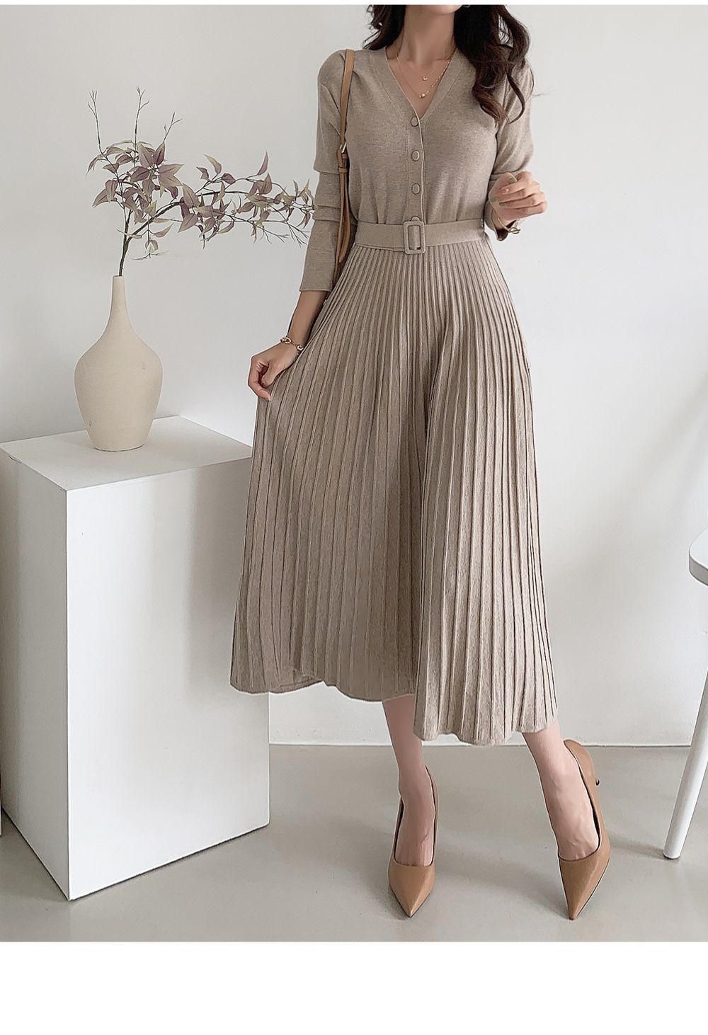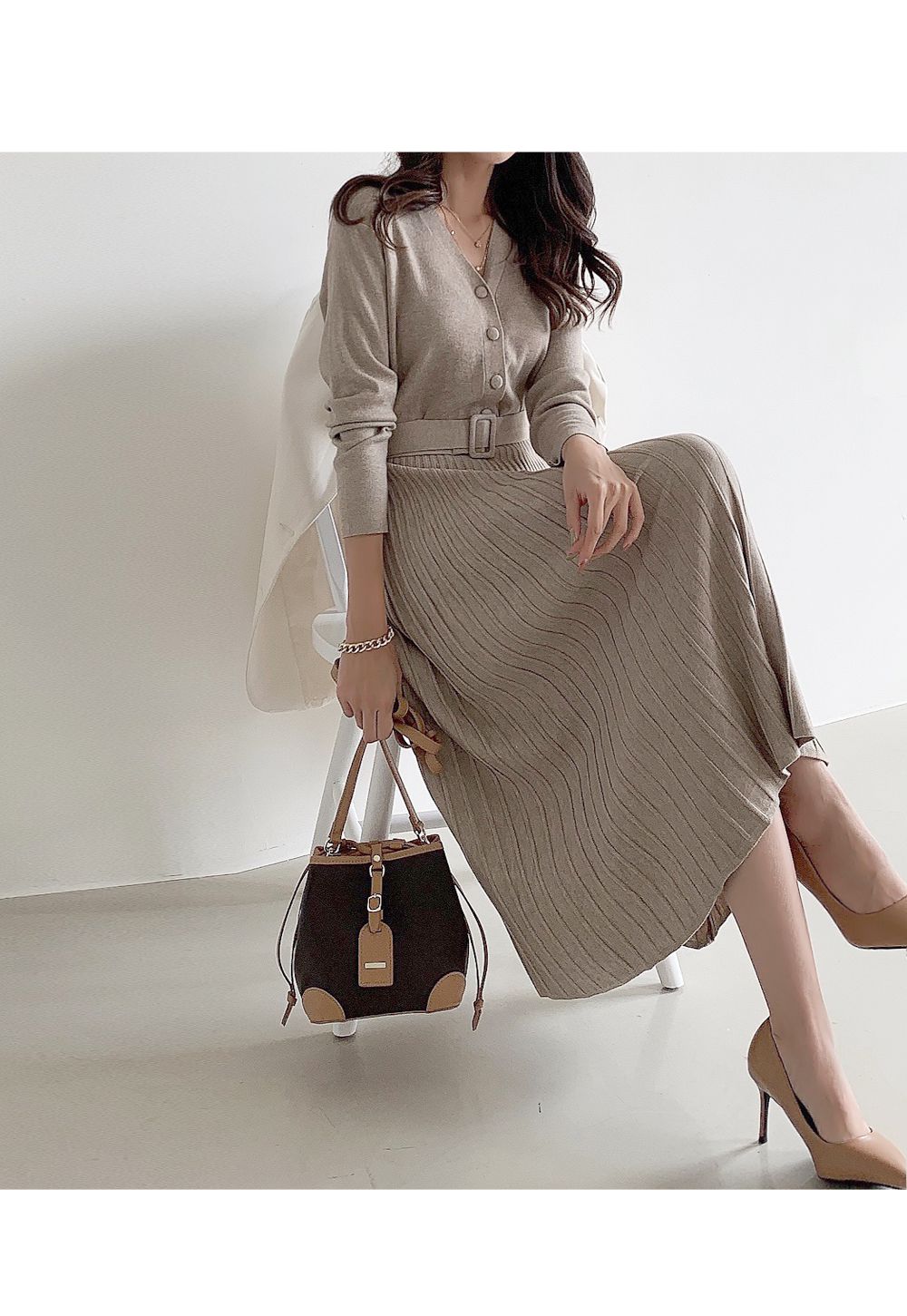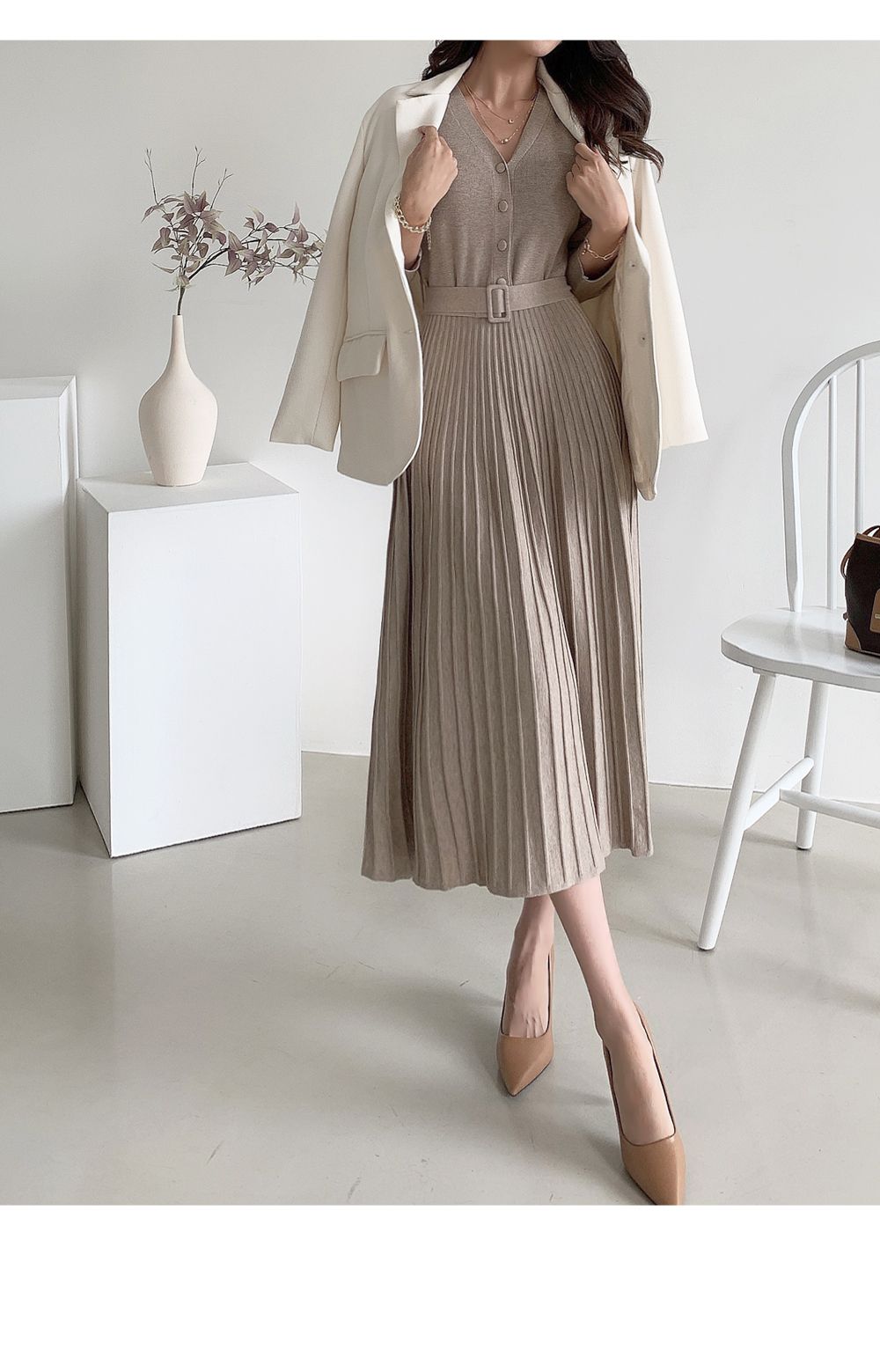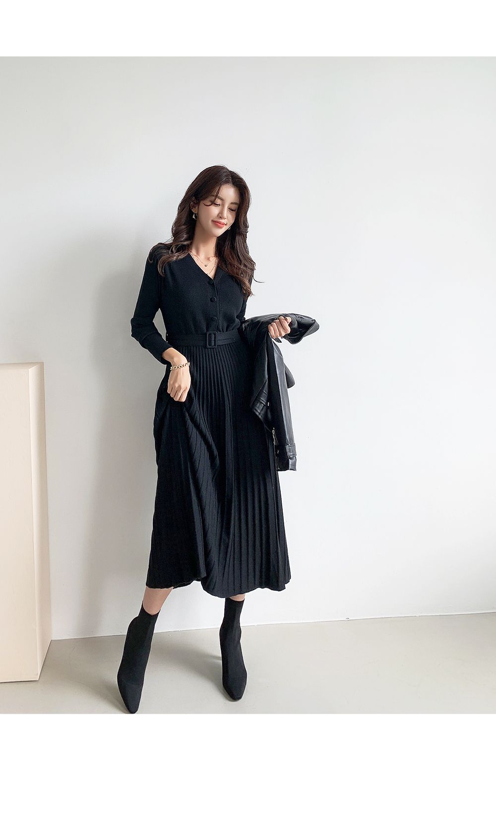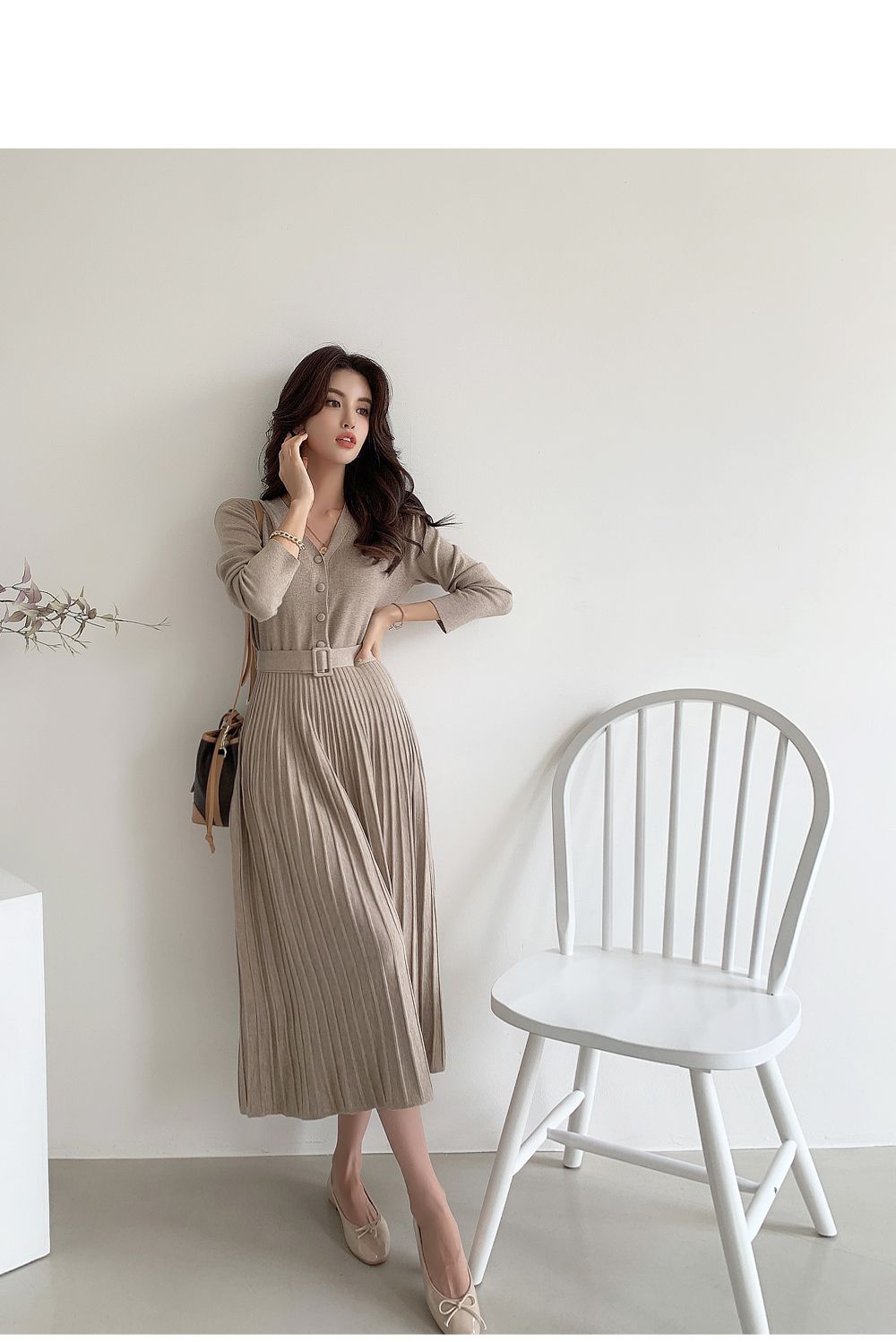可正式可休閒/附有腰帶超划算/收腰更顯瘦/傘狀造型修飾下半身-休閒居家簡約百搭針織V領半開襟立體坑條素面皮帶長袖連身裙洋裝米色黑色