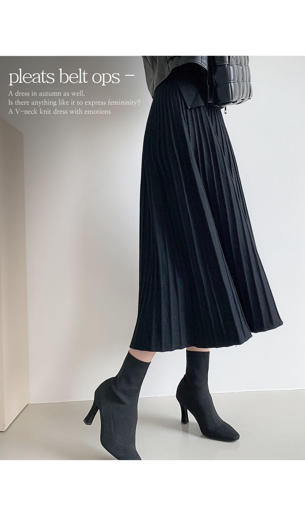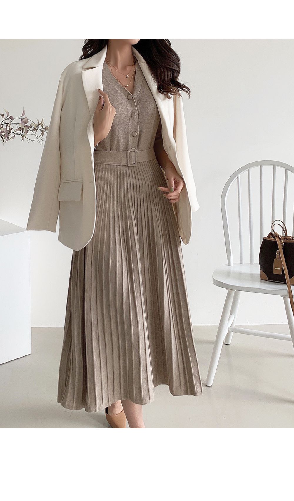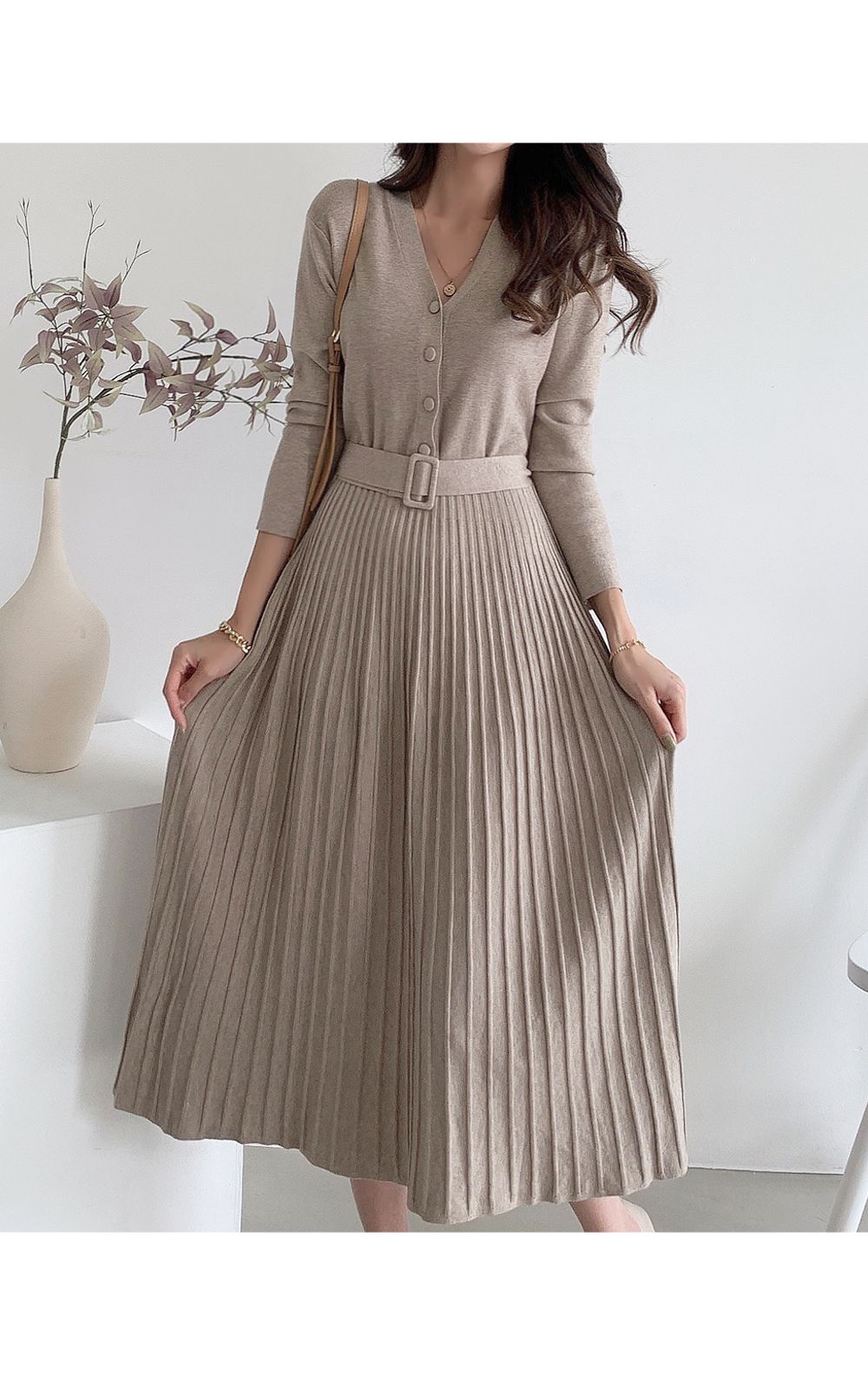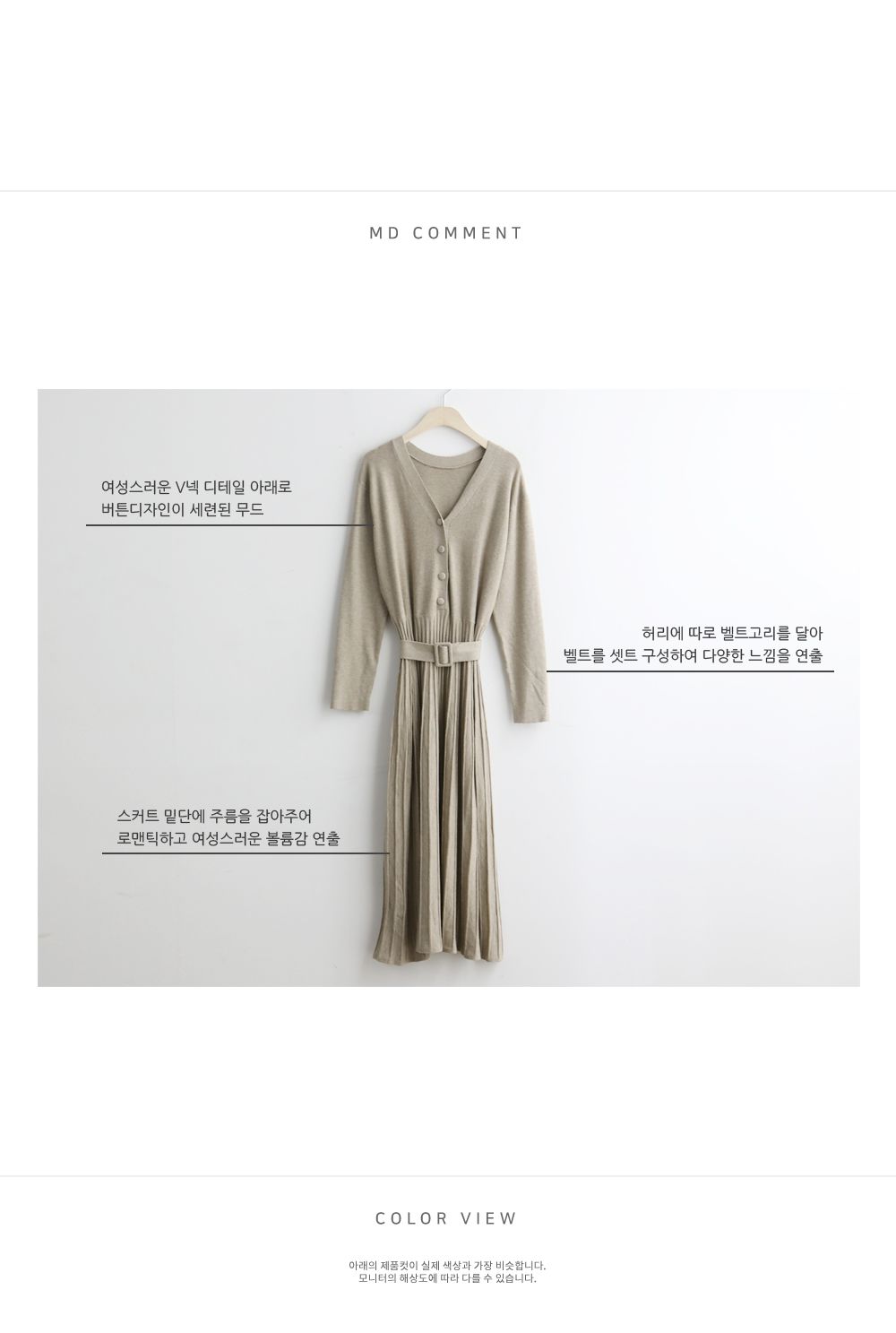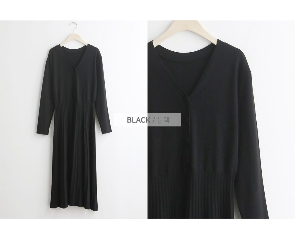 可正式可休閒/附有腰帶超划算/收腰更顯瘦/傘狀造型修飾下半身-休閒居家簡約百搭針織V領半開襟立體坑條素面皮帶長袖連身裙洋裝米色黑色