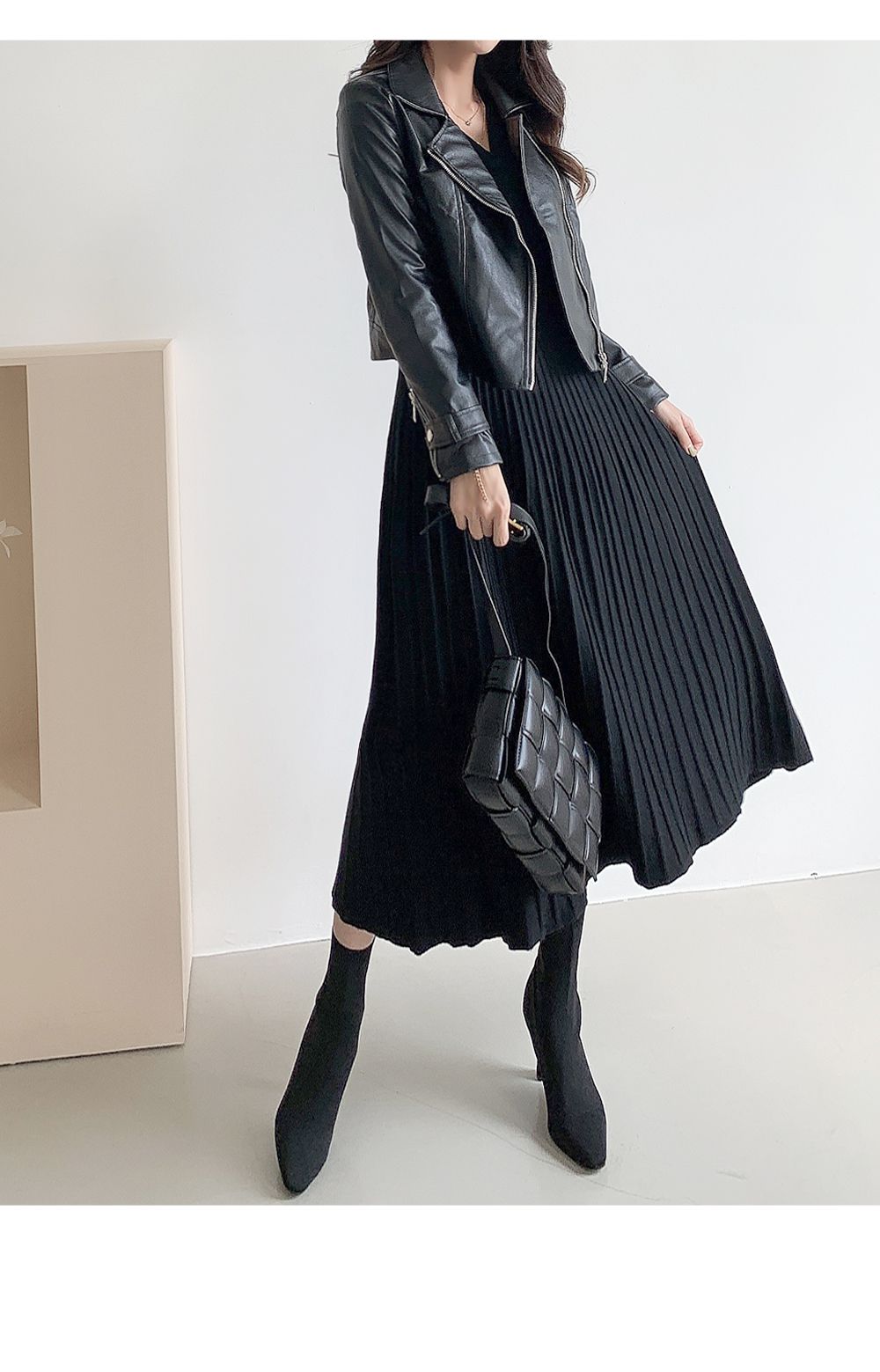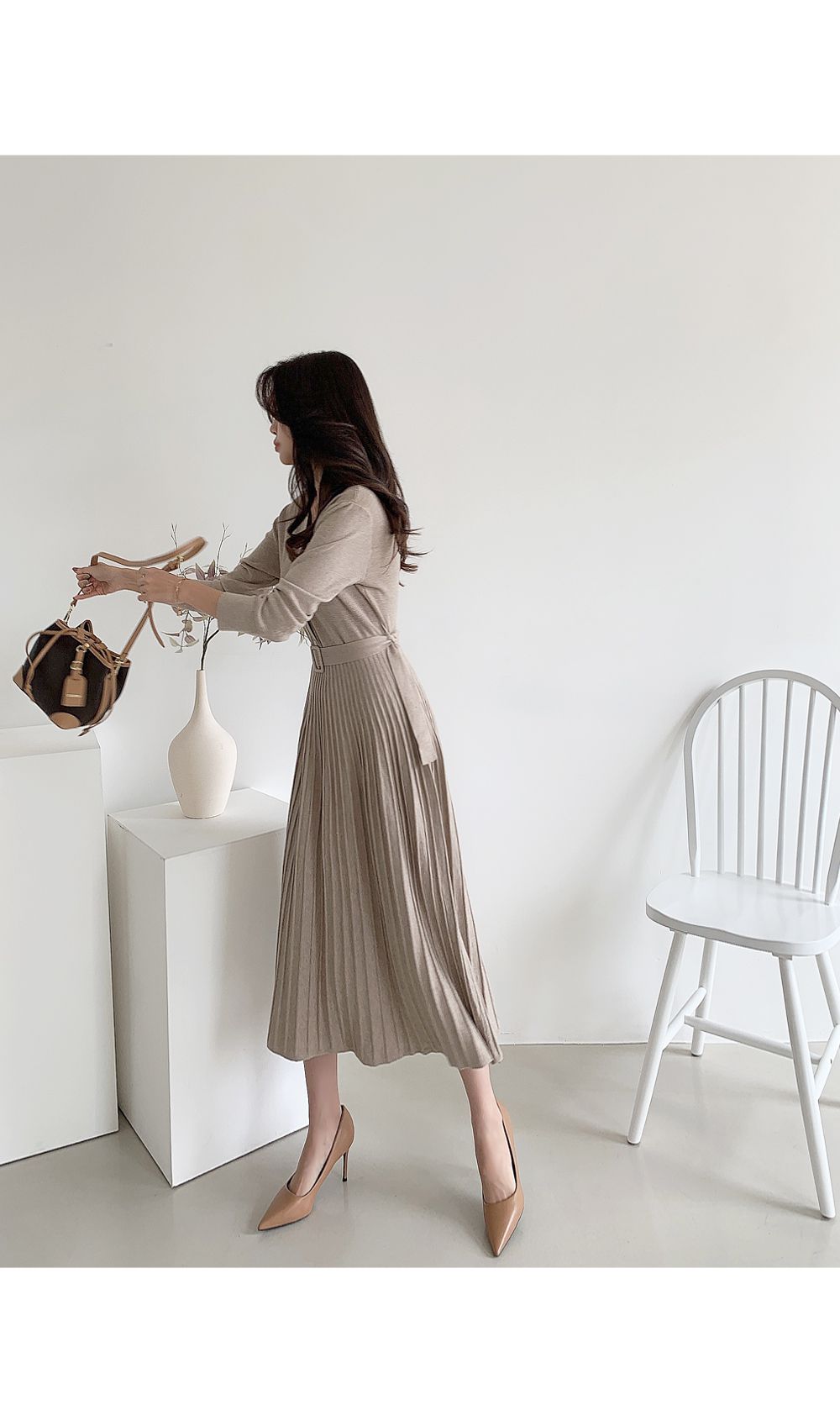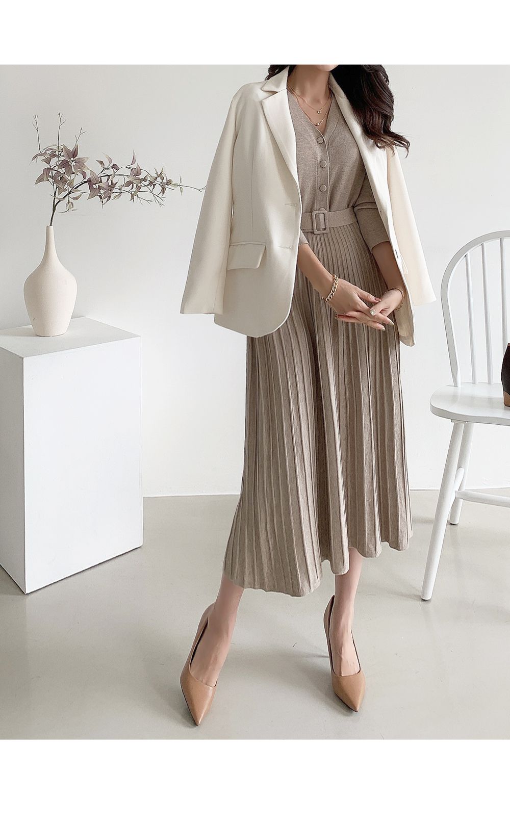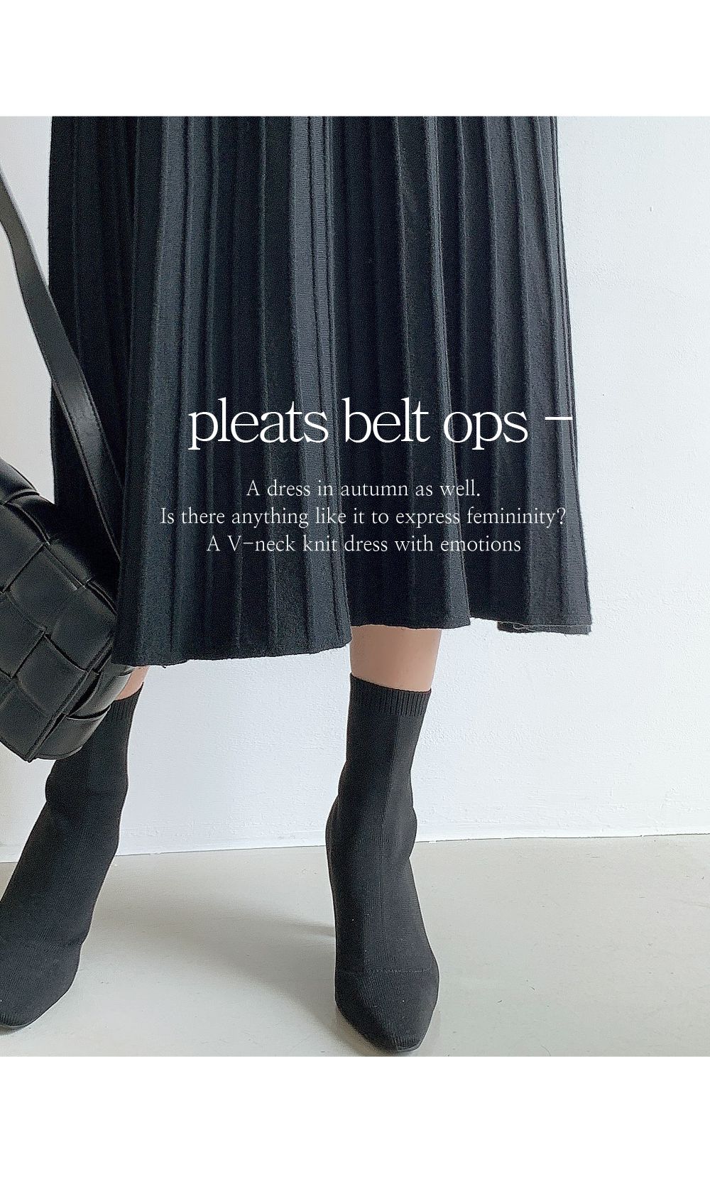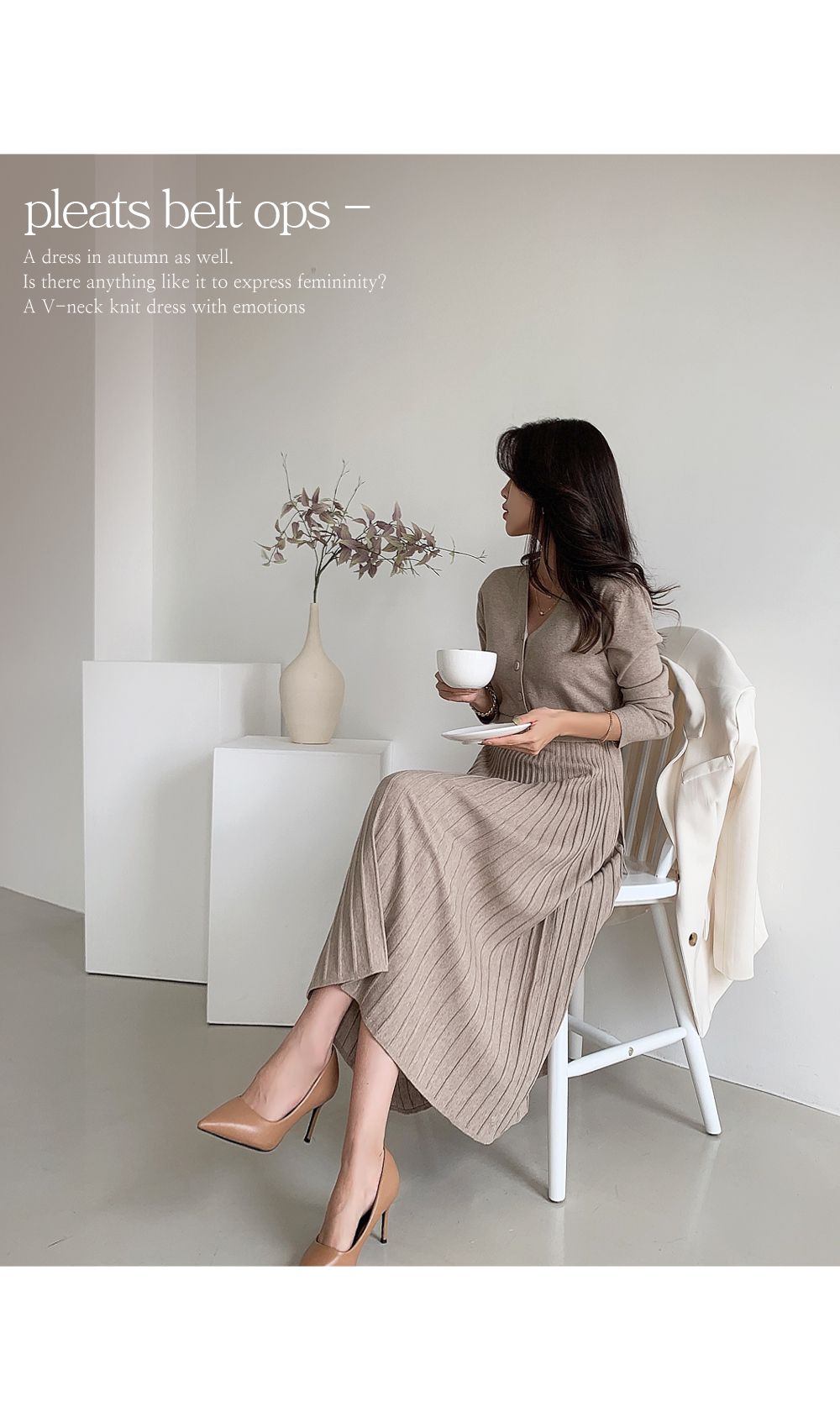 可正式可休閒/附有腰帶超划算/收腰更顯瘦/傘狀造型修飾下半身-休閒居家簡約百搭針織V領半開襟立體坑條素面皮帶長袖連身裙洋裝米色黑色