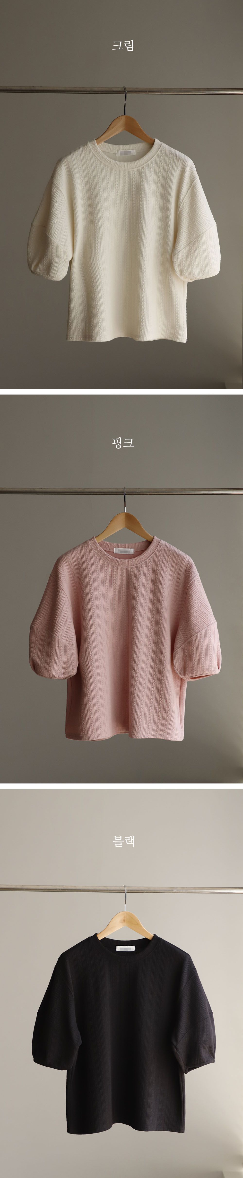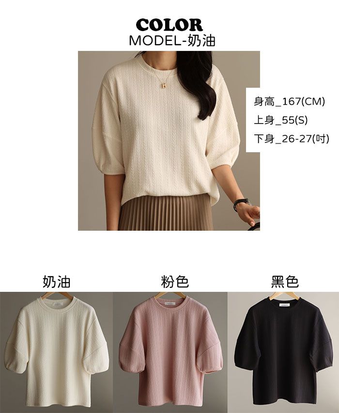 溫柔氣質小姐姐穿搭/寬袖修飾肉肉手臂/立體雕花獨特不撞衫-休閒居家簡約百搭立體雕花圓領素面麻花針織造型澎澎袖五分袖上衣奶油色粉色黑色