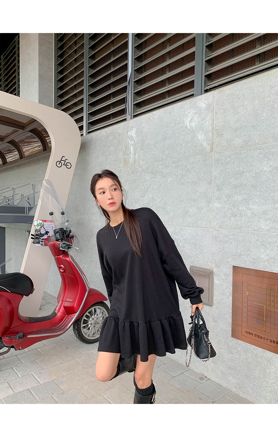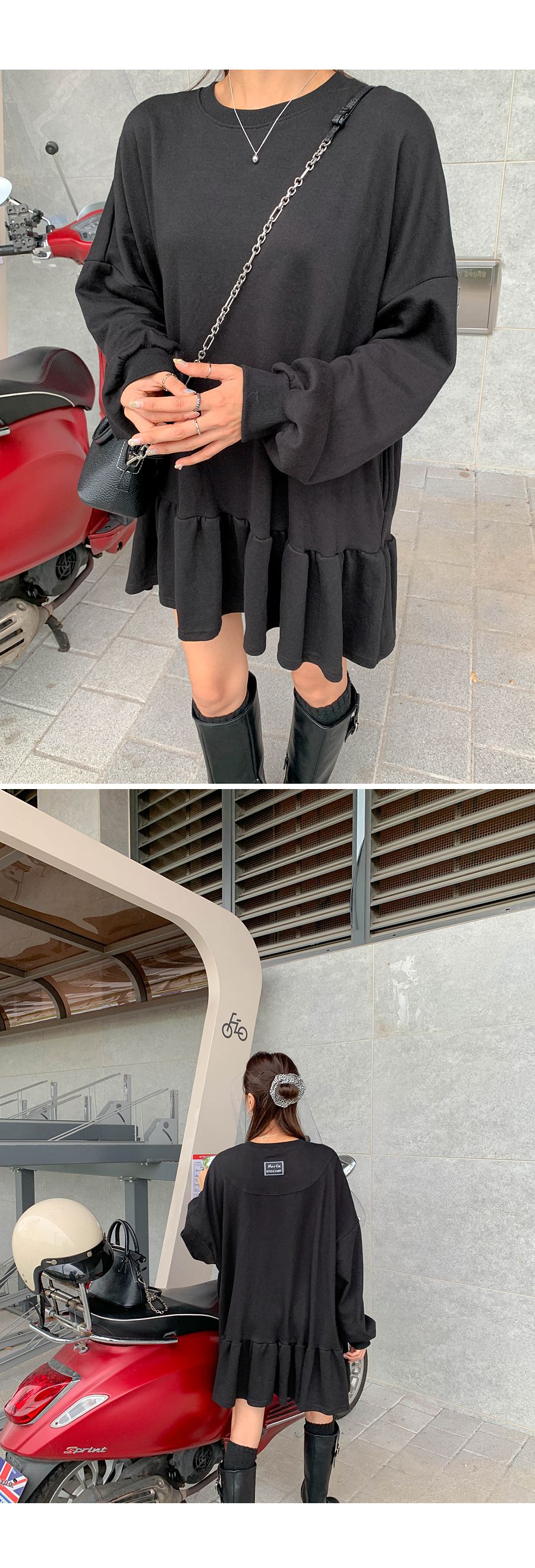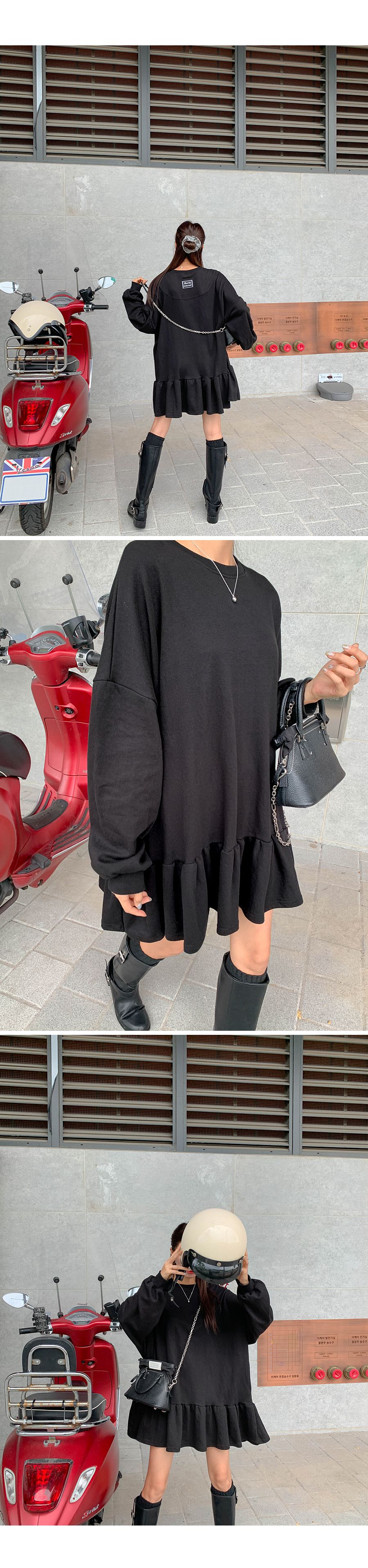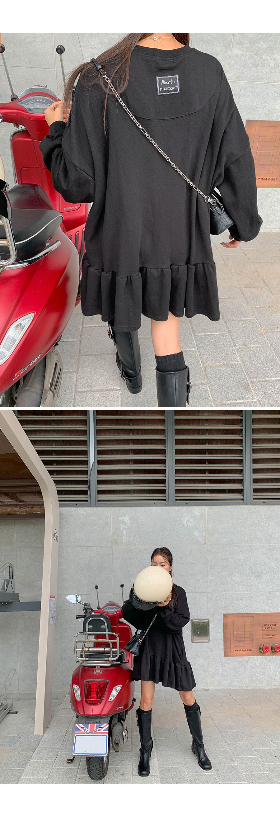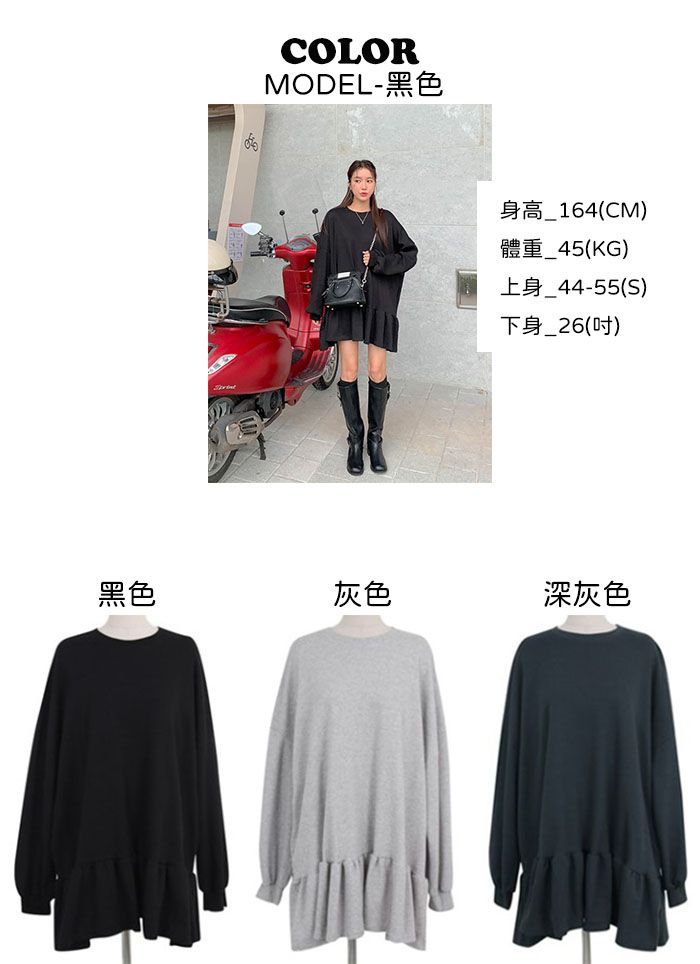 【C55631】韓國LLN 花邊裙襬短洋裝-寬鬆圓領後背字母布標長袖連身裙