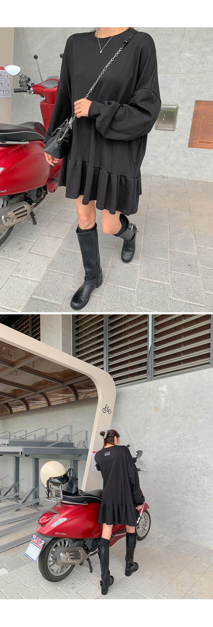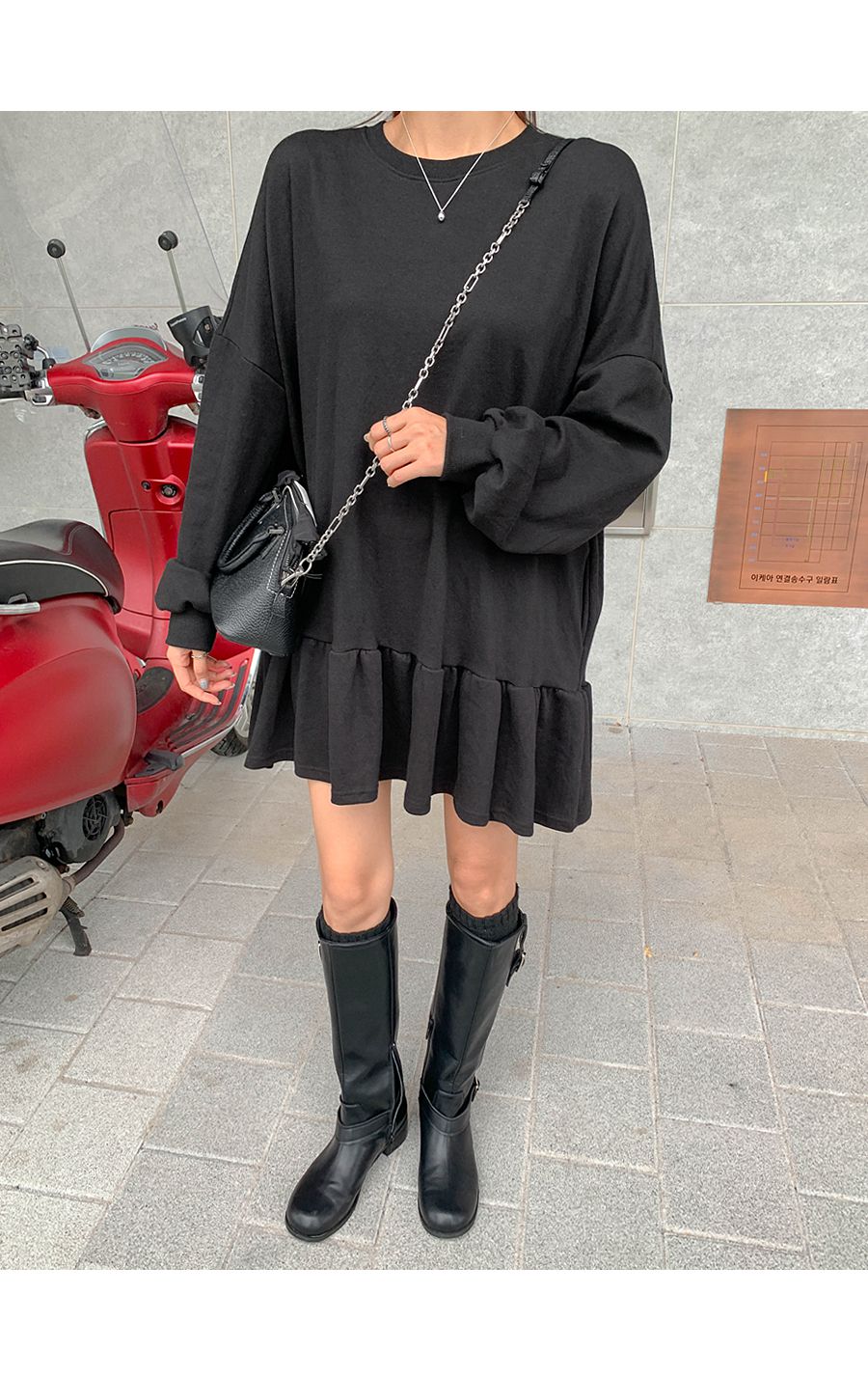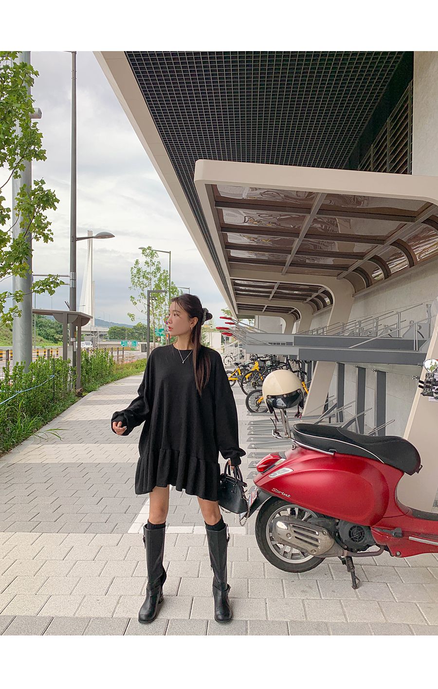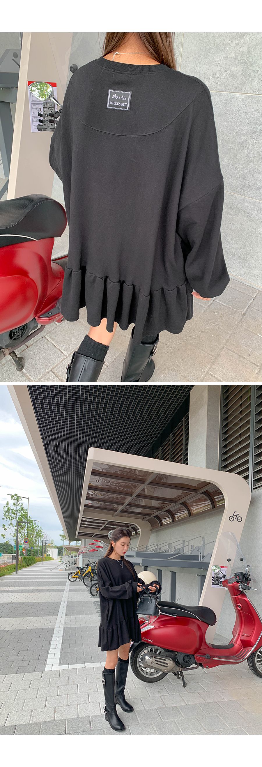 【C55631】韓國LLN 花邊裙襬短洋裝-寬鬆圓領後背字母布標長袖連身裙