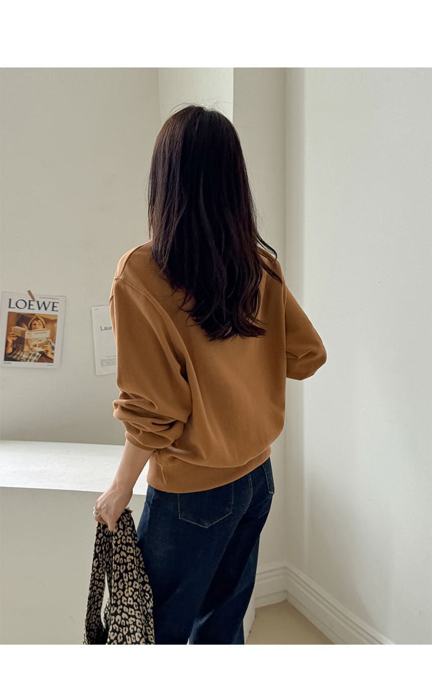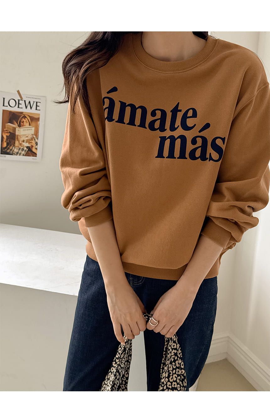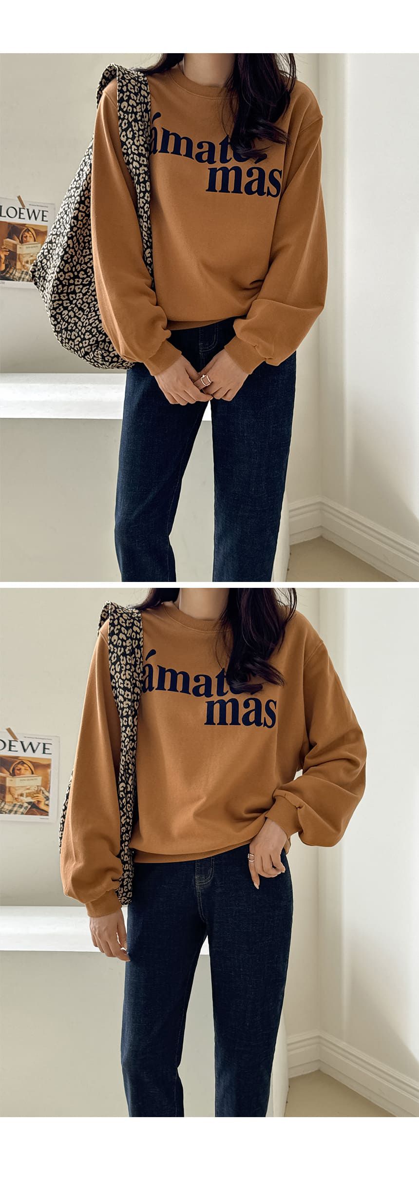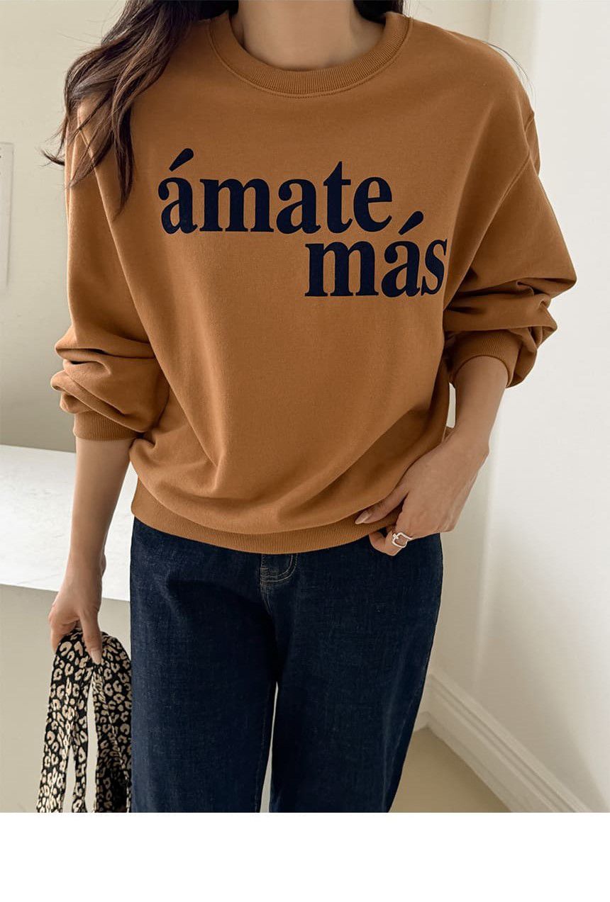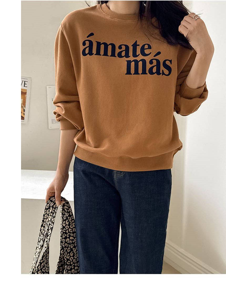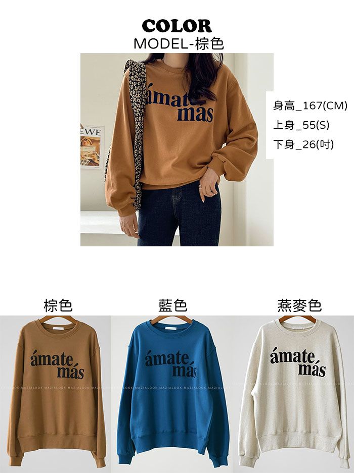 燙印絨布字母/圓領/內裏毛圈棉 - 休閒居家英文字母上衣字母T恤絨布字母大學T基礎款英文T恤長袖上衣棕色藍色燕麥色