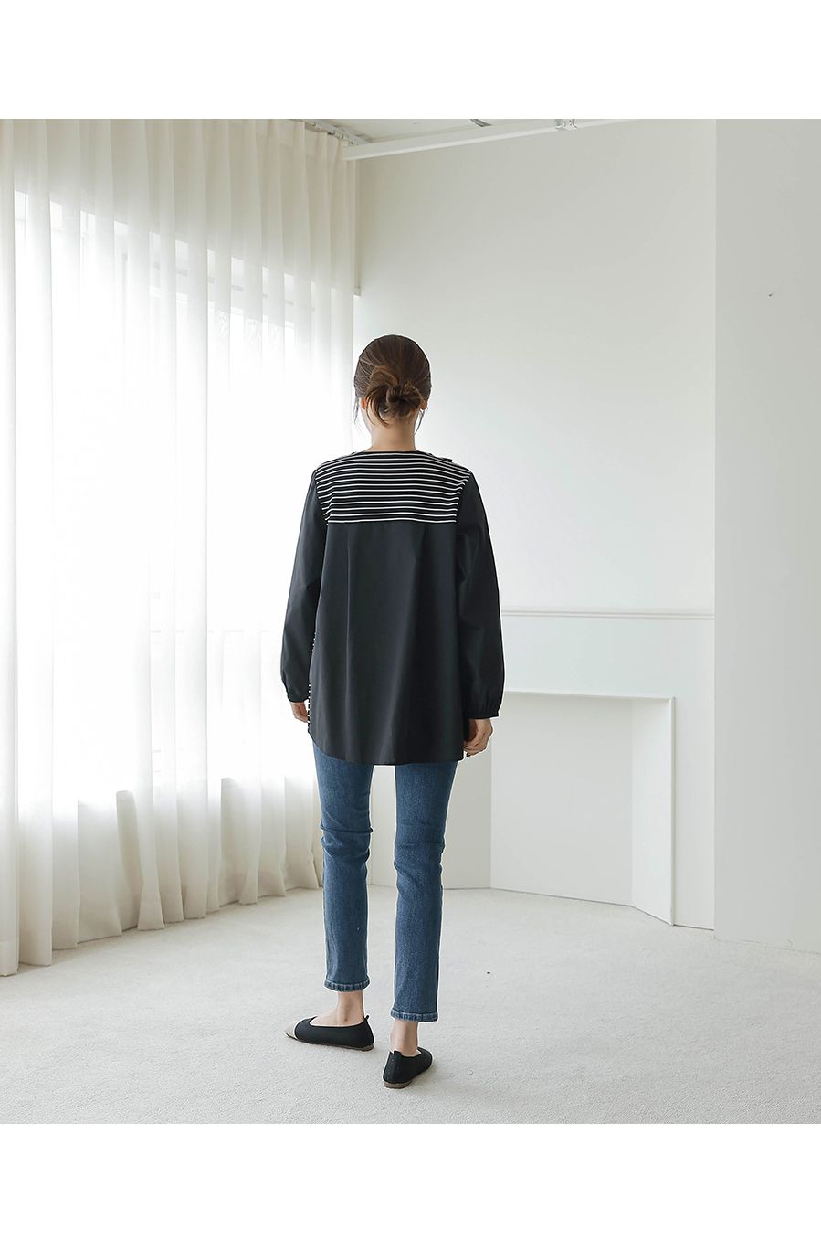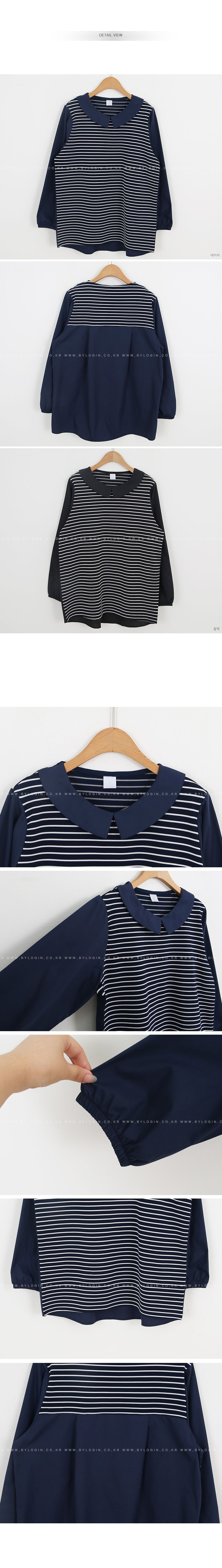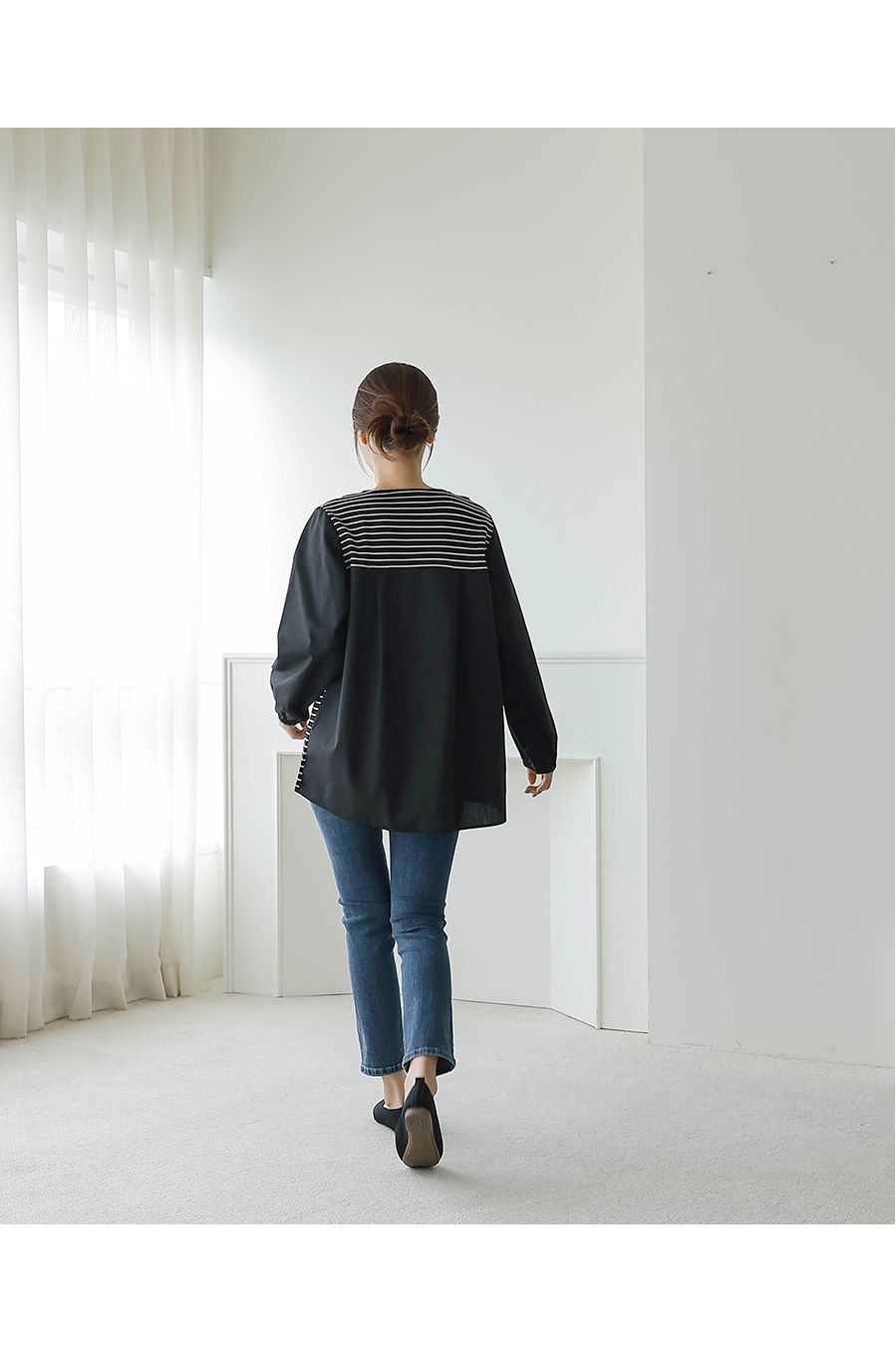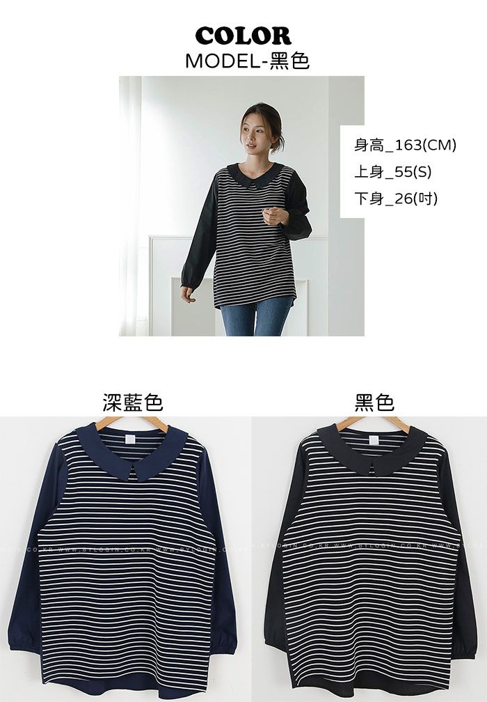 三種尺寸/假兩件拼接/前短後長/寬鬆傘狀/V領/圓弧領片/A字/束口長袖 - 休閒居家配色條紋上衣條紋傘狀上衣雙材質拼接寬鬆大尺碼上衣長版上衣領片上衣長袖上衣多尺寸LXL2XL深藍色黑色