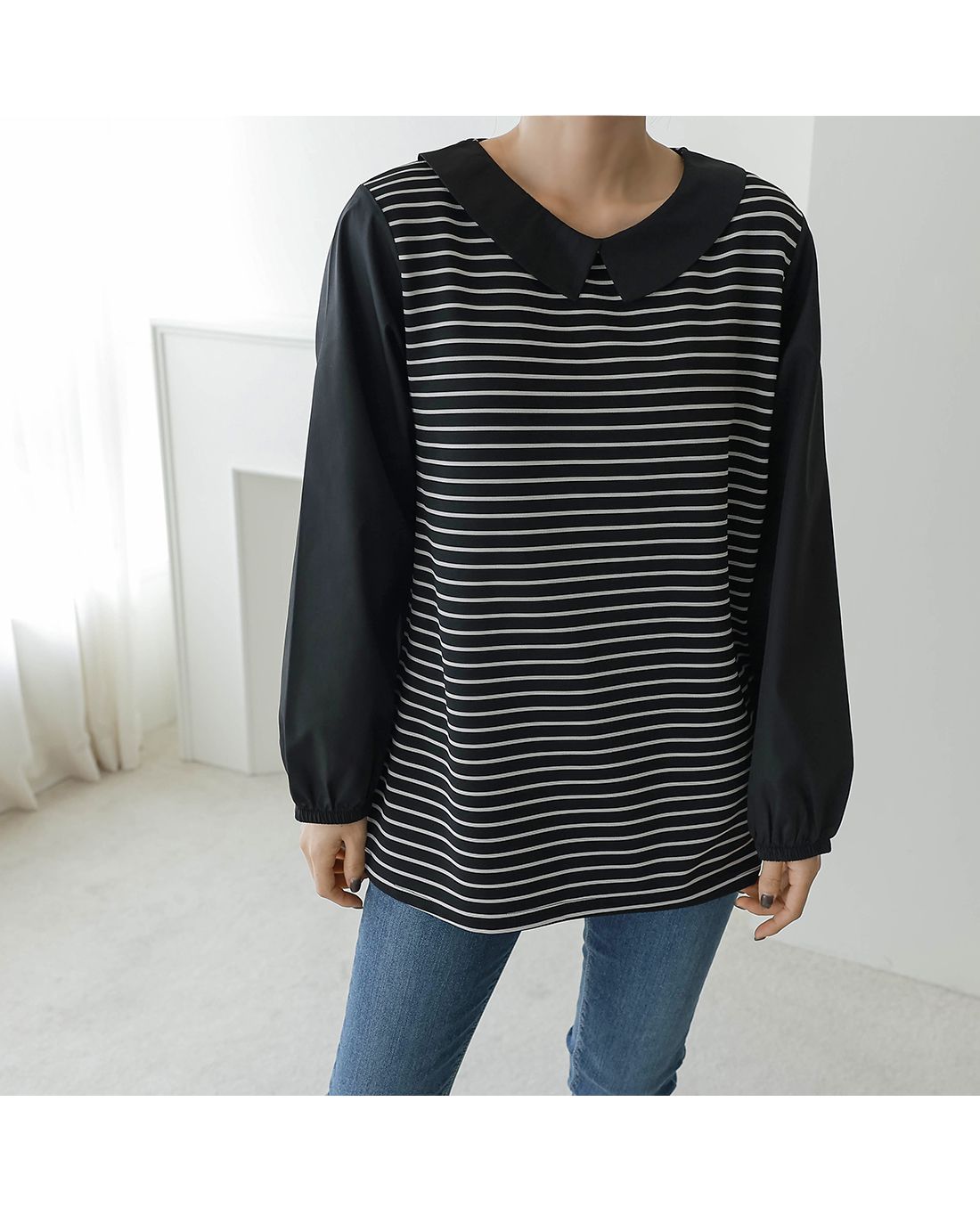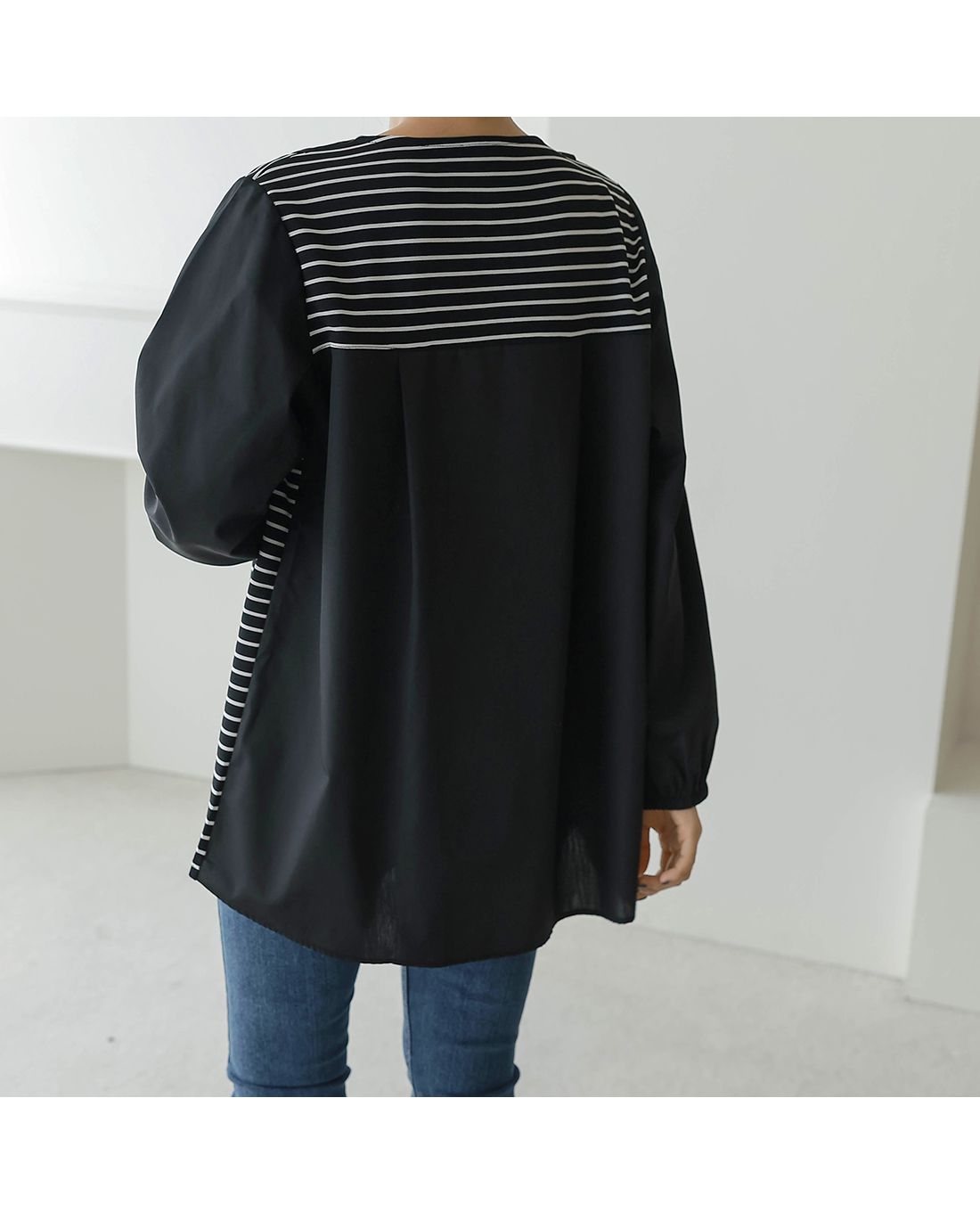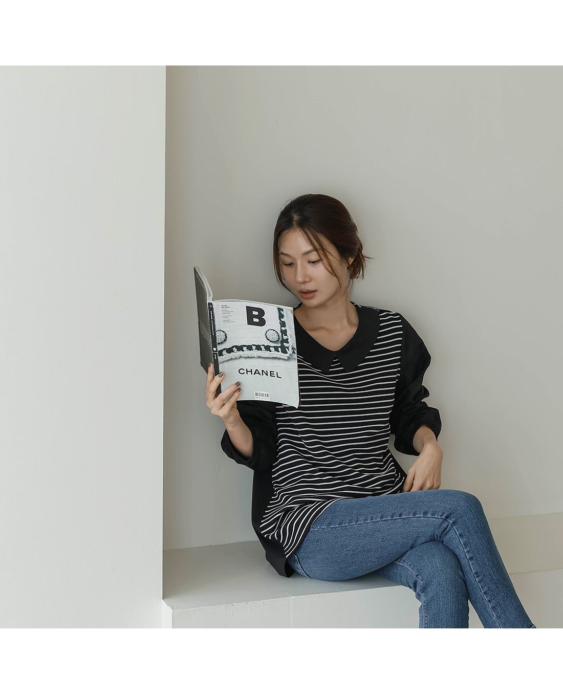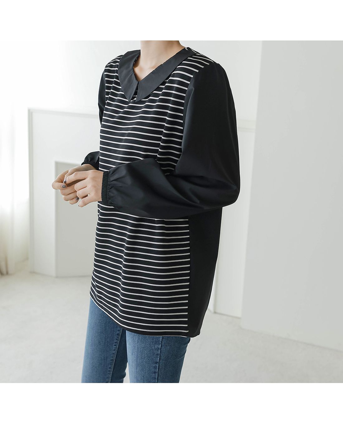 【C55650】韓國BLG 條紋傘狀上衣-雙材質拼接V領寬鬆長版領片長袖★★