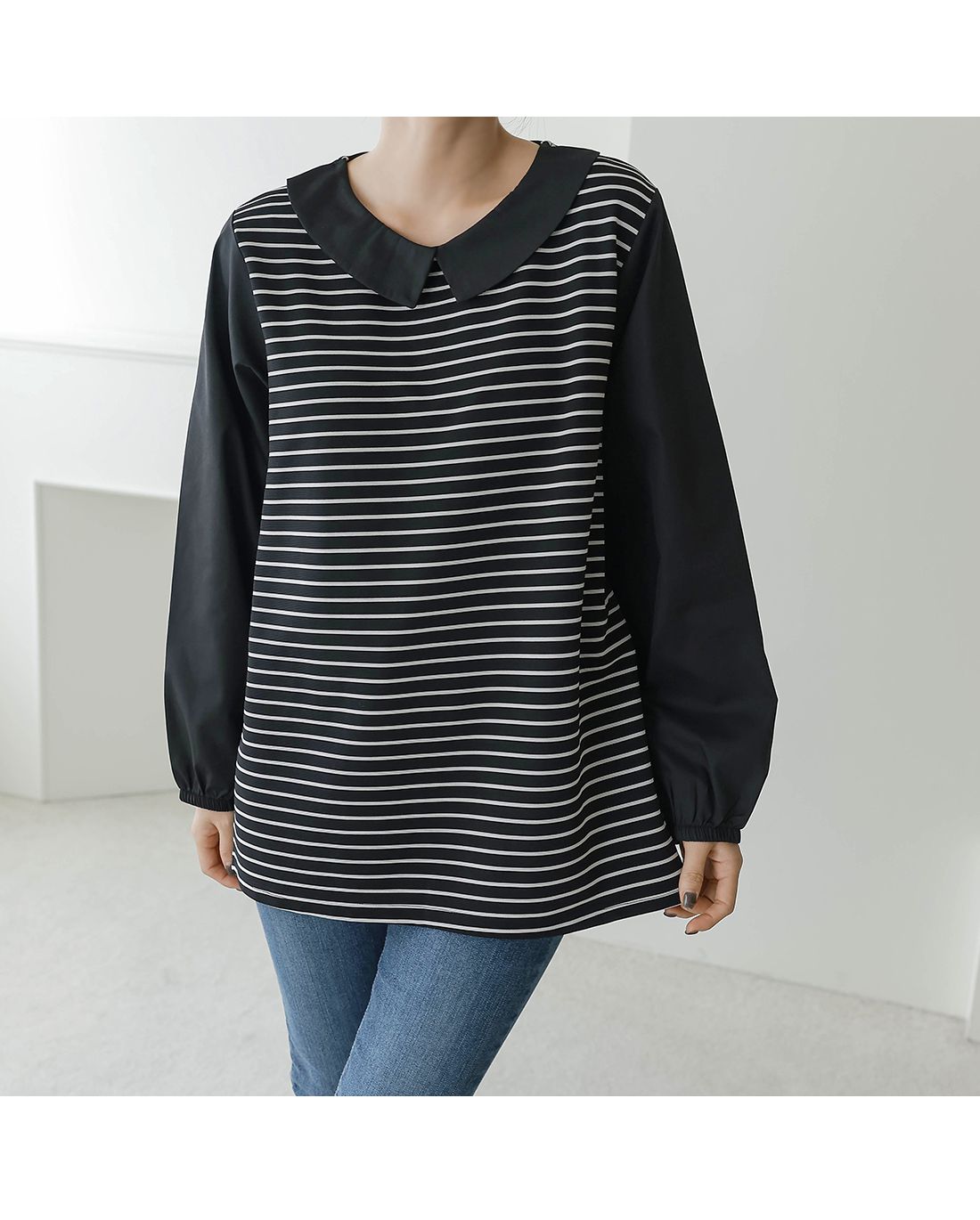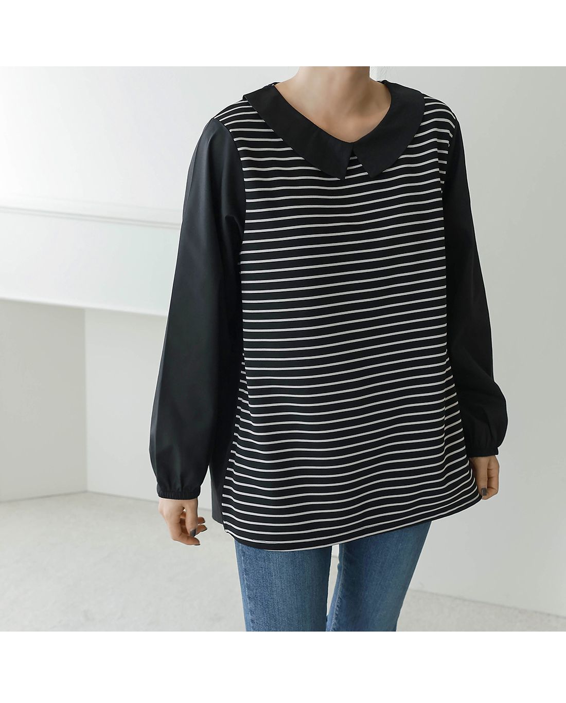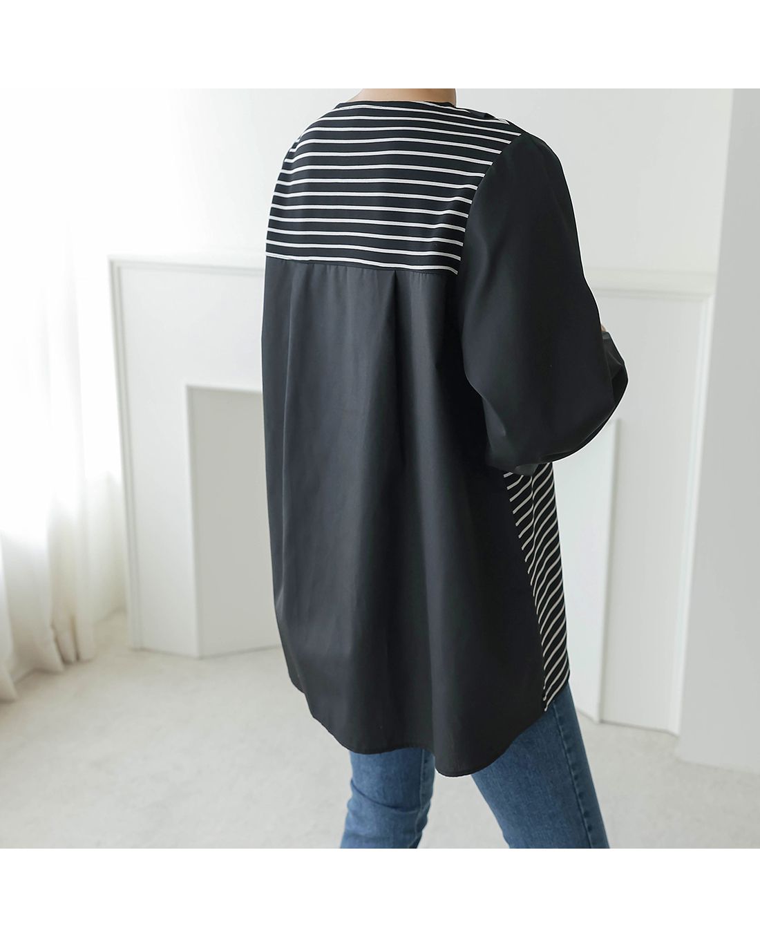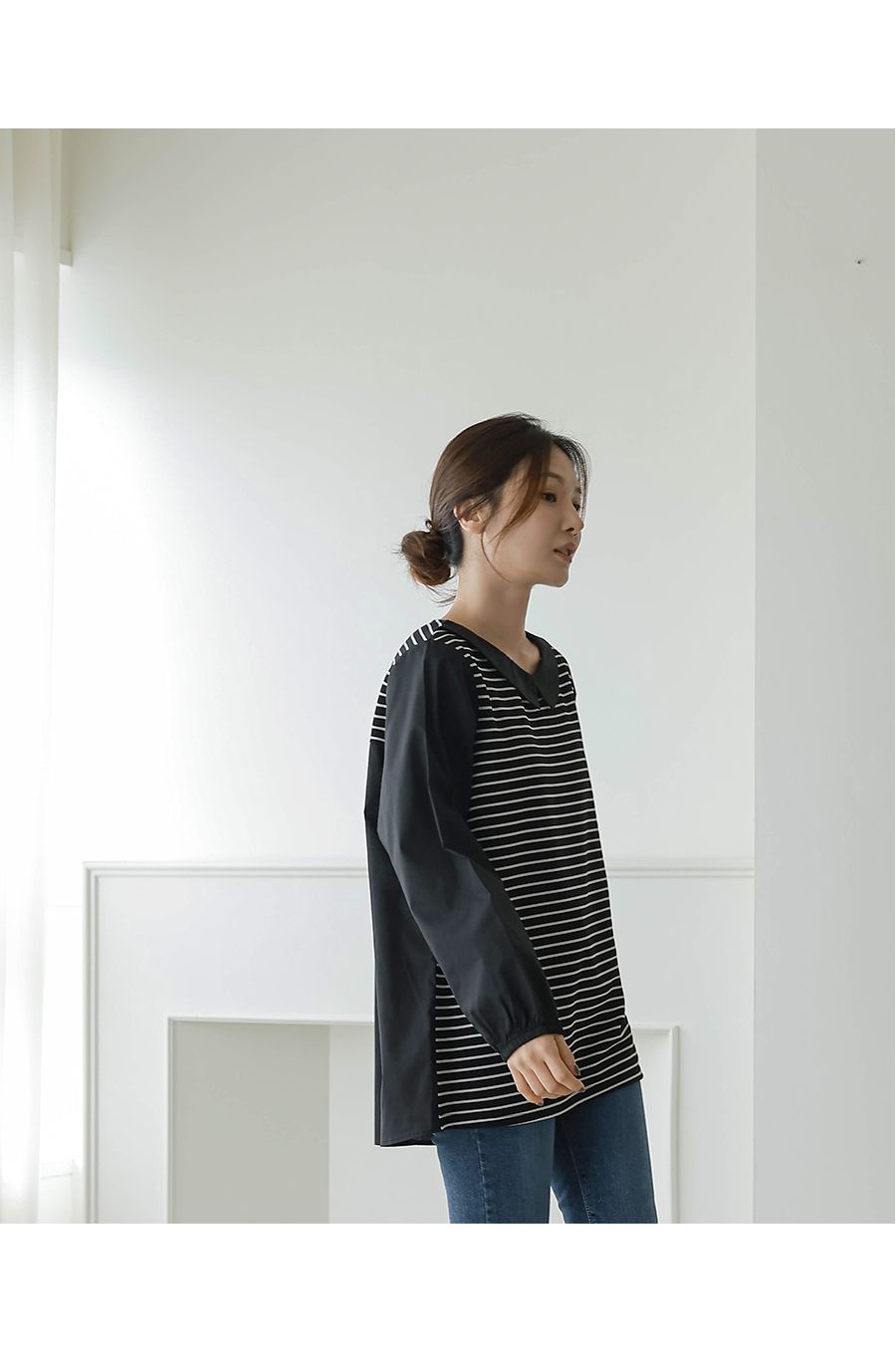【C55650】韓國BLG 條紋傘狀上衣-雙材質拼接V領寬鬆長版領片長袖★★