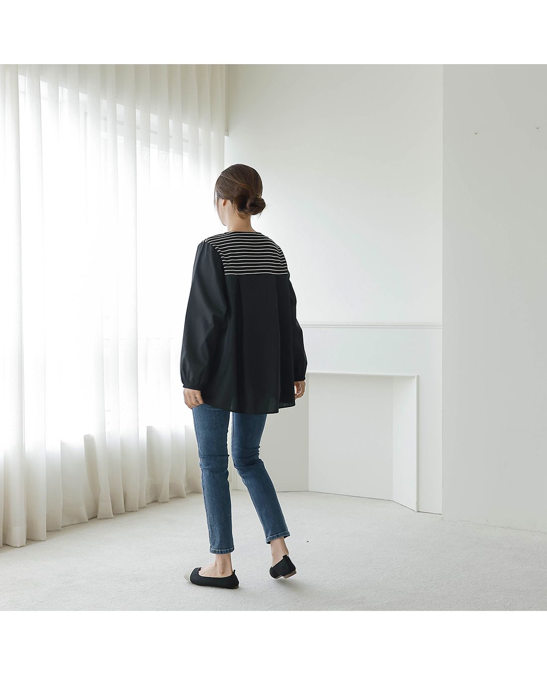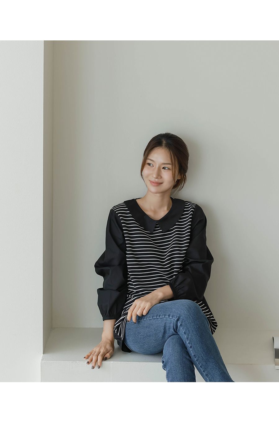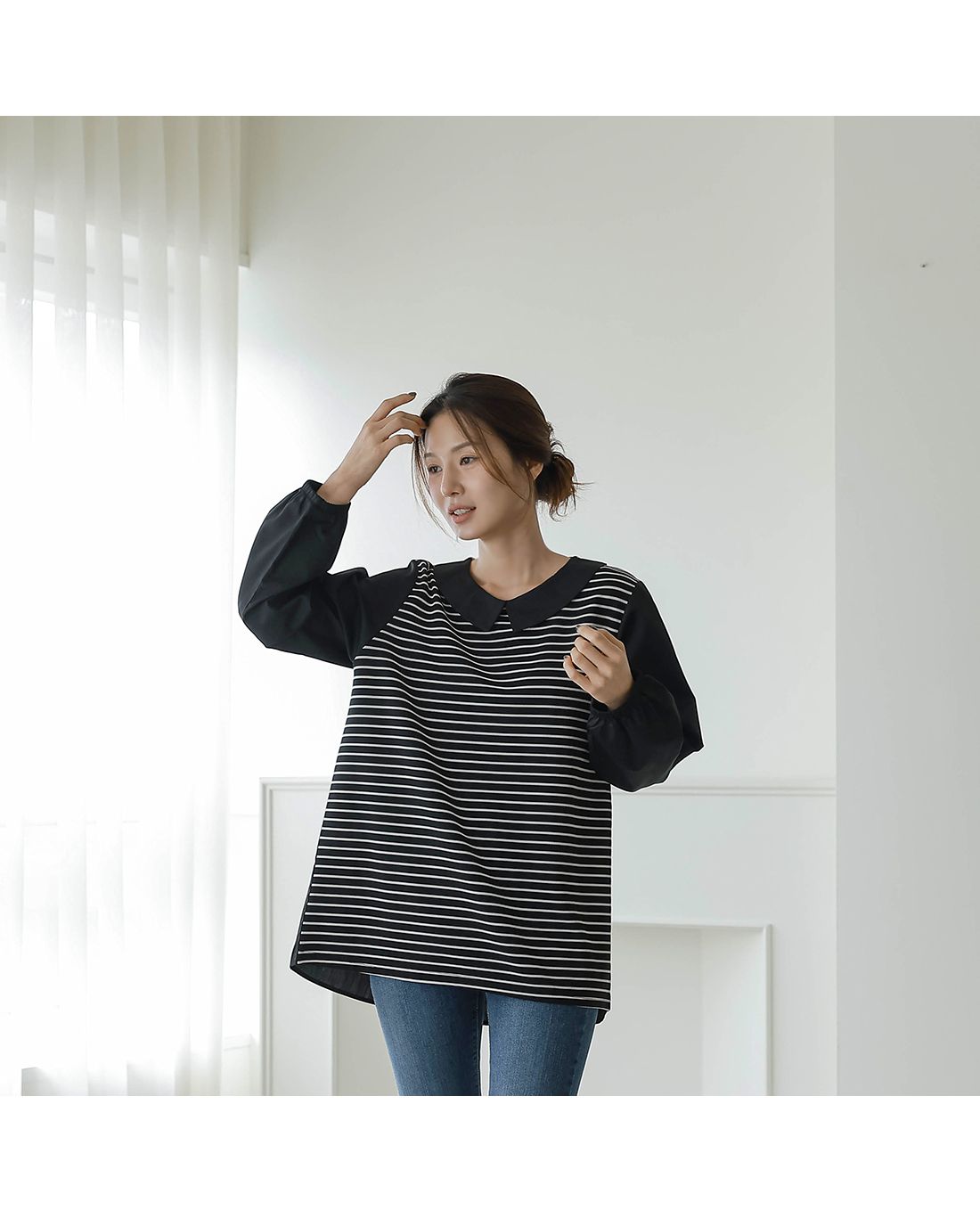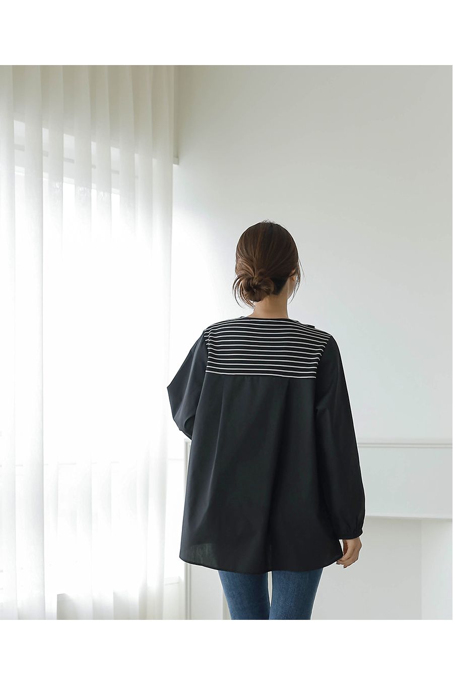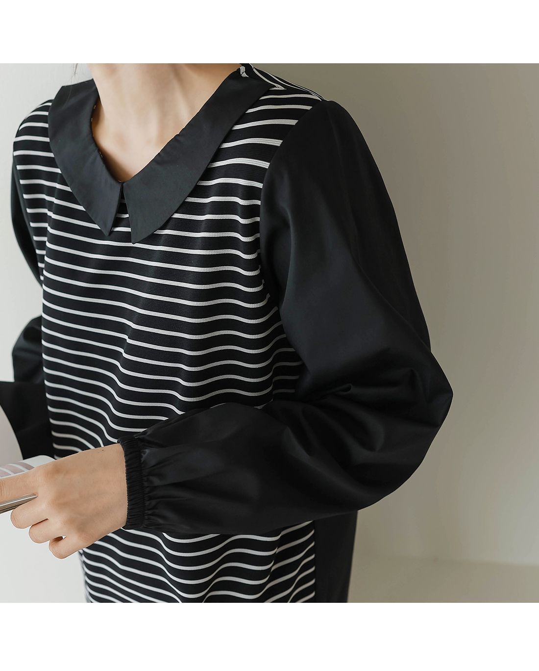 【C55650】韓國BLG 條紋傘狀上衣-雙材質拼接V領寬鬆長版領片長袖★★
