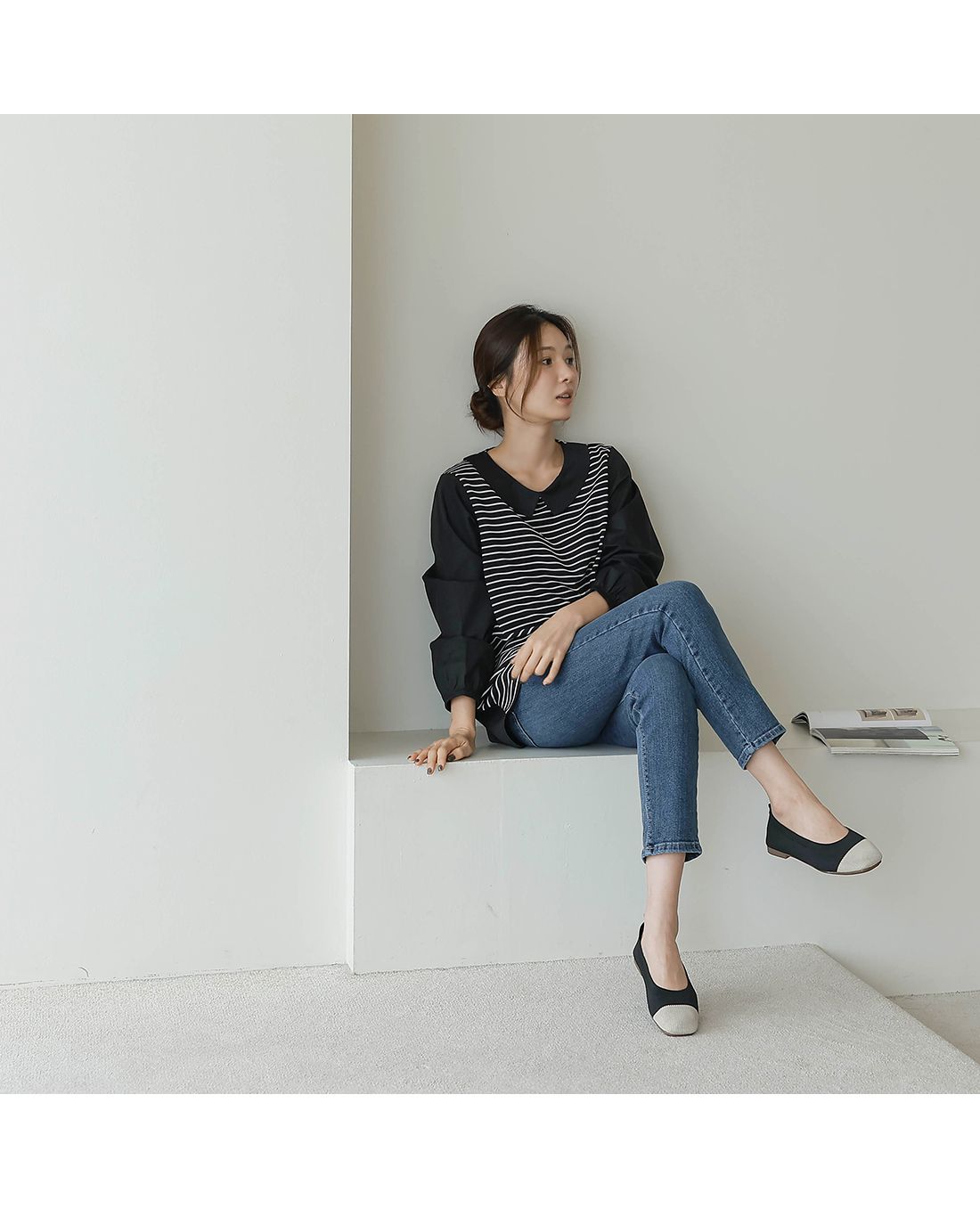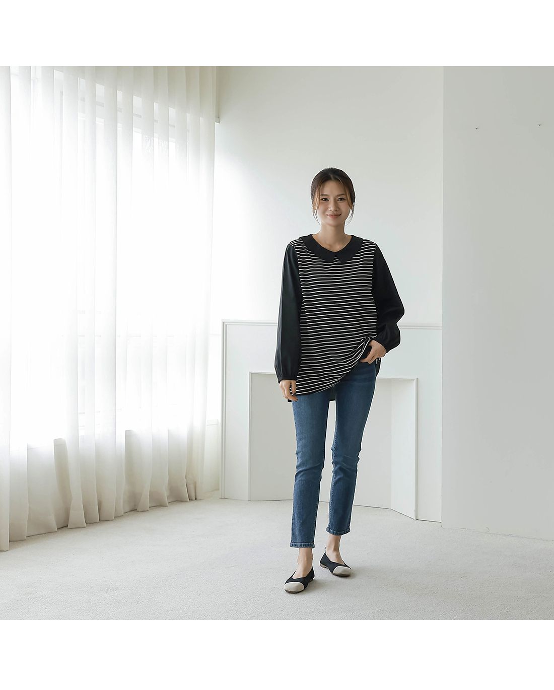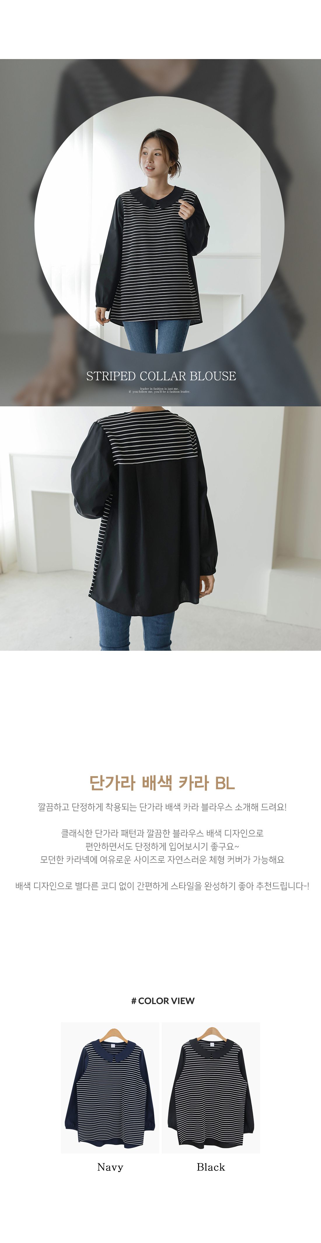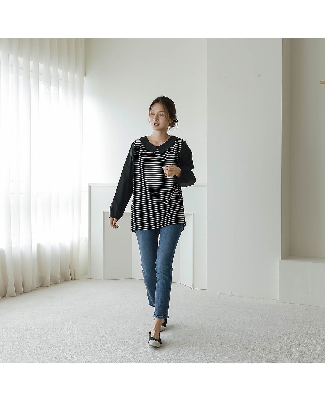 【C55650】韓國BLG 條紋傘狀上衣-雙材質拼接V領寬鬆長版領片長袖★★