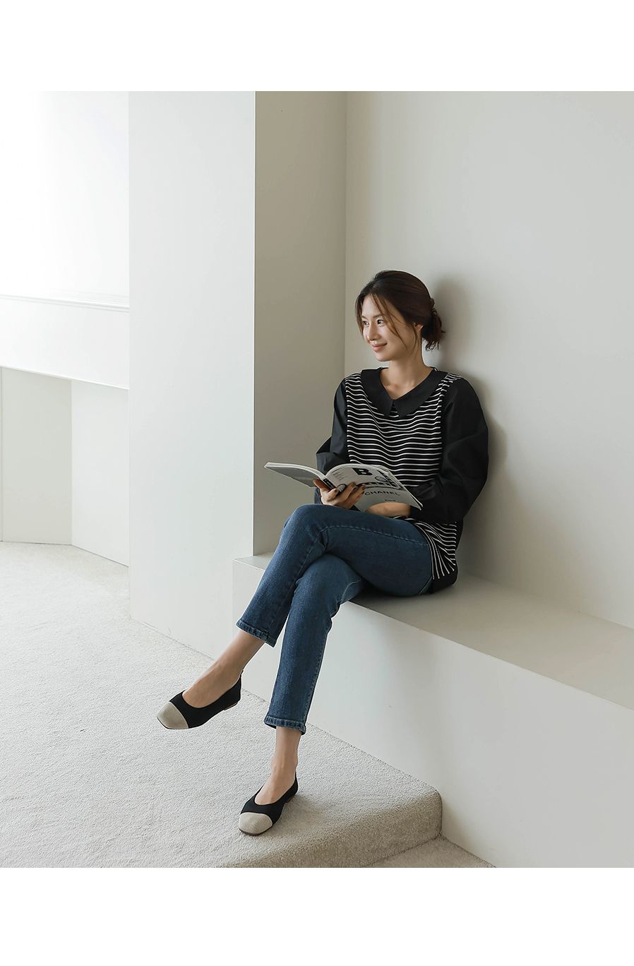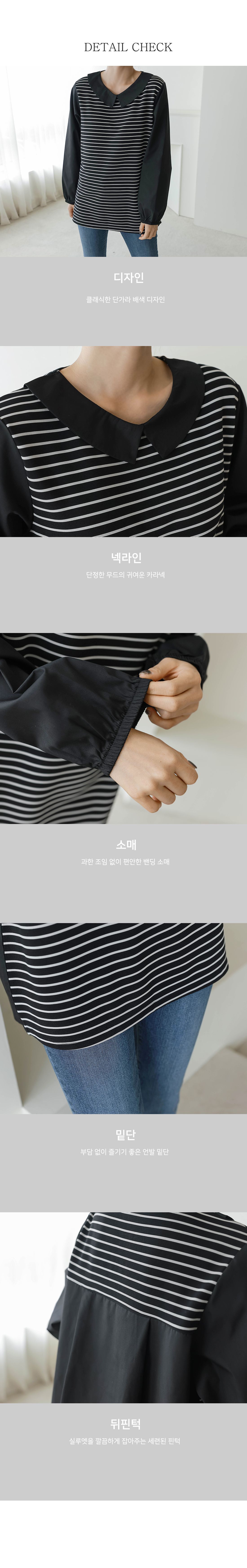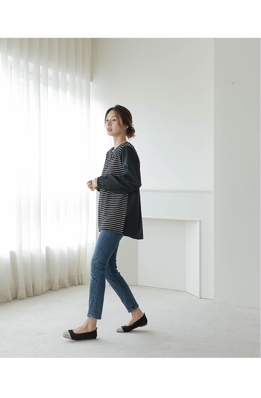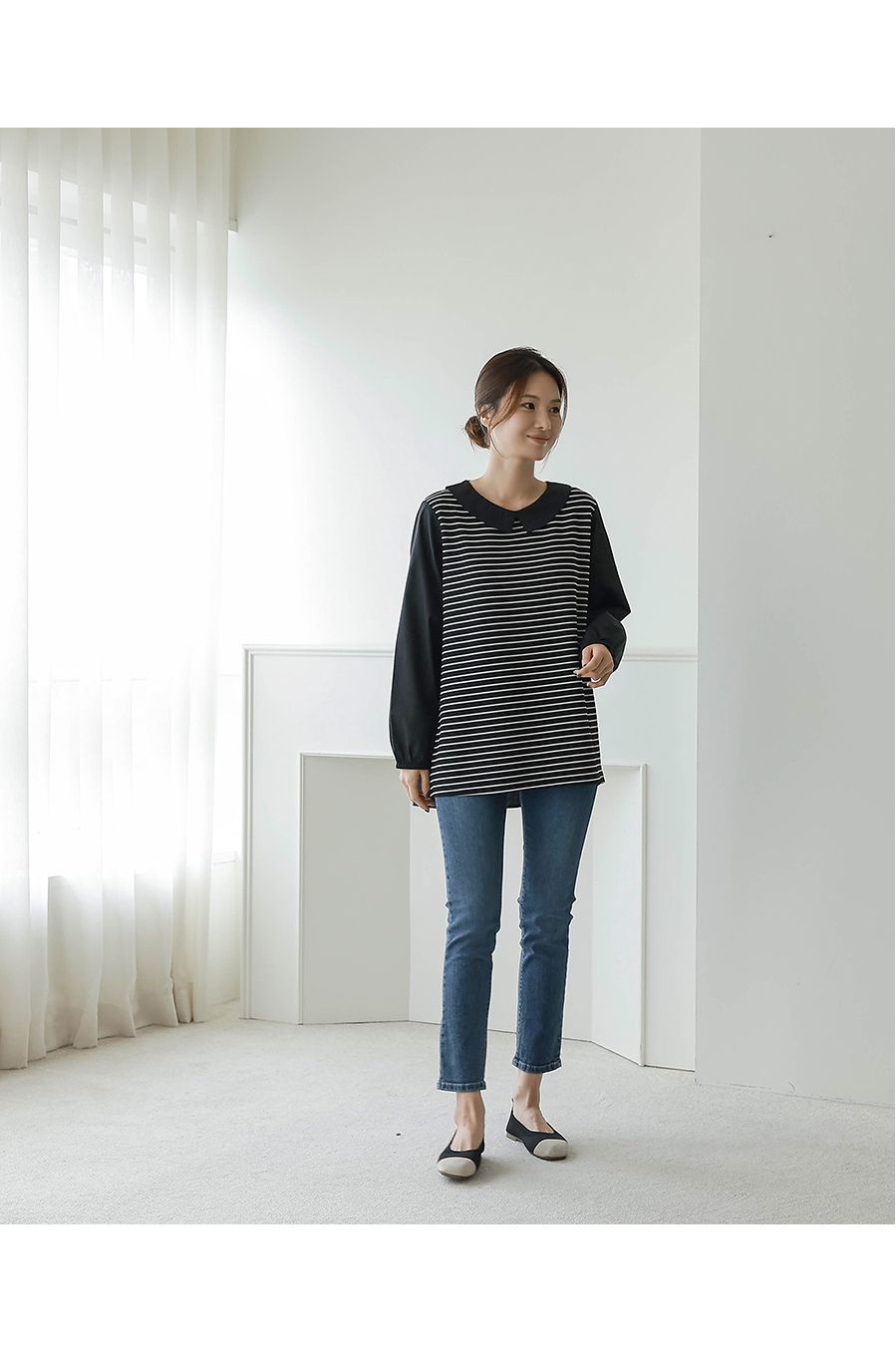 【C55650】韓國BLG 條紋傘狀上衣-雙材質拼接V領寬鬆長版領片長袖★★