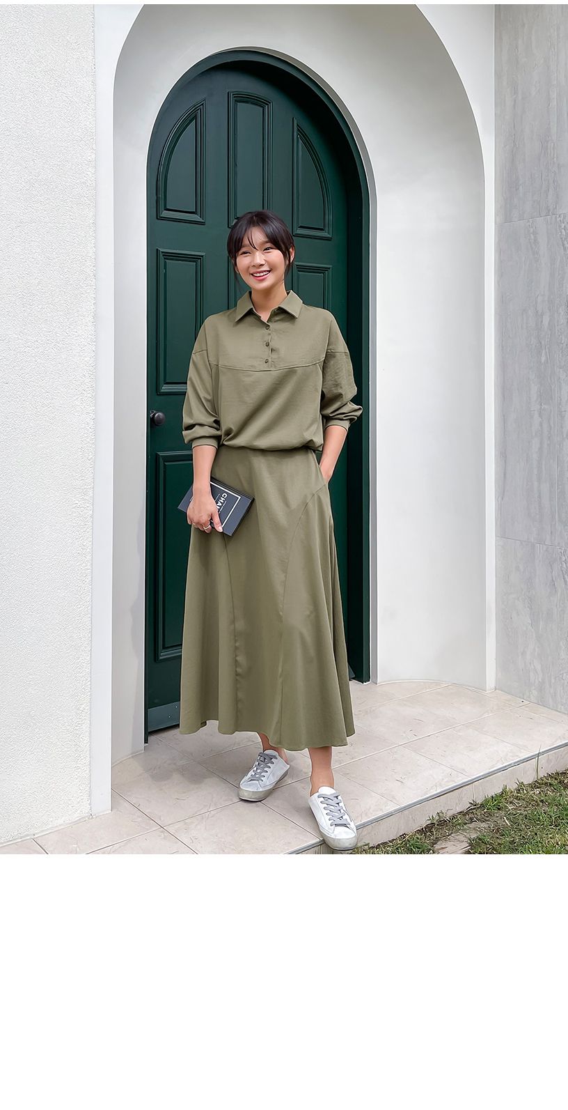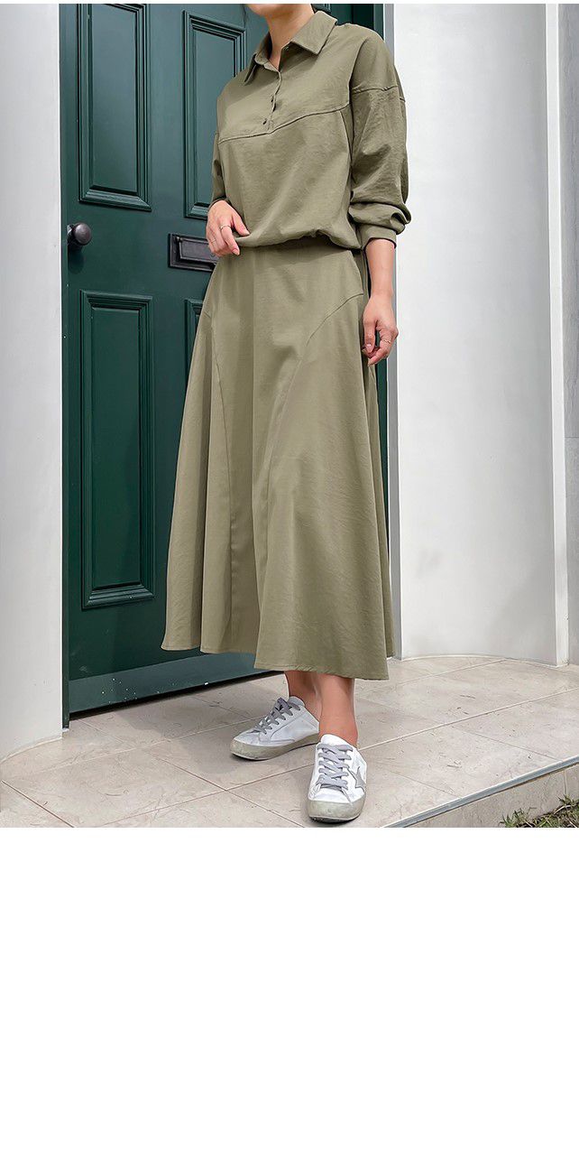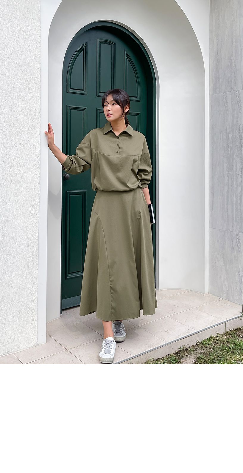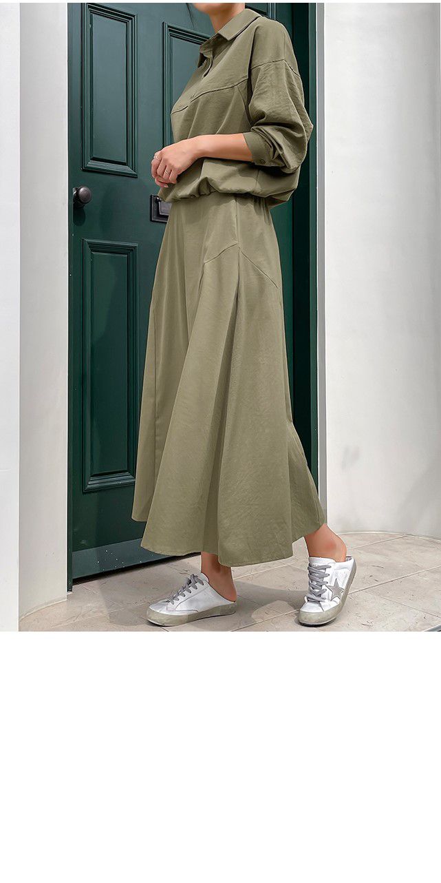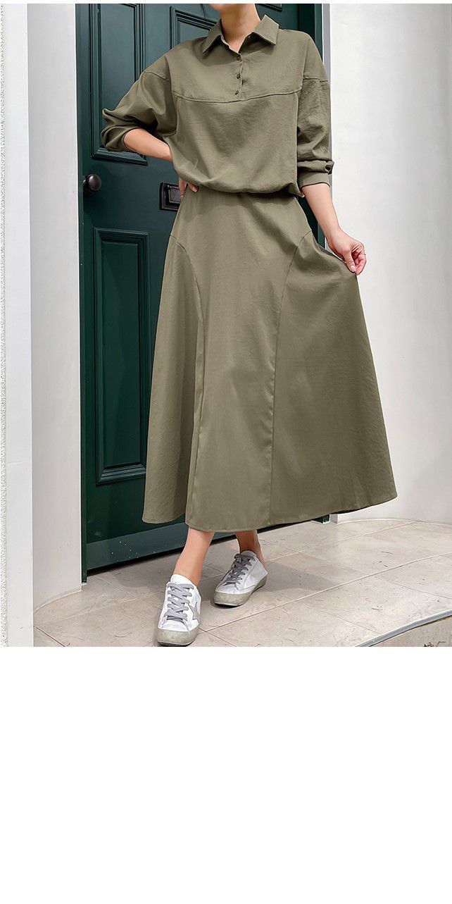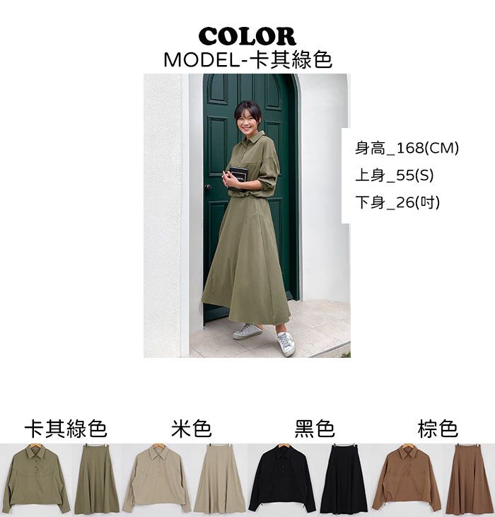 【C55657】韓國PSS 襯衫傘裙套裝-收腰長袖上衣+素面後腰鬆緊長裙