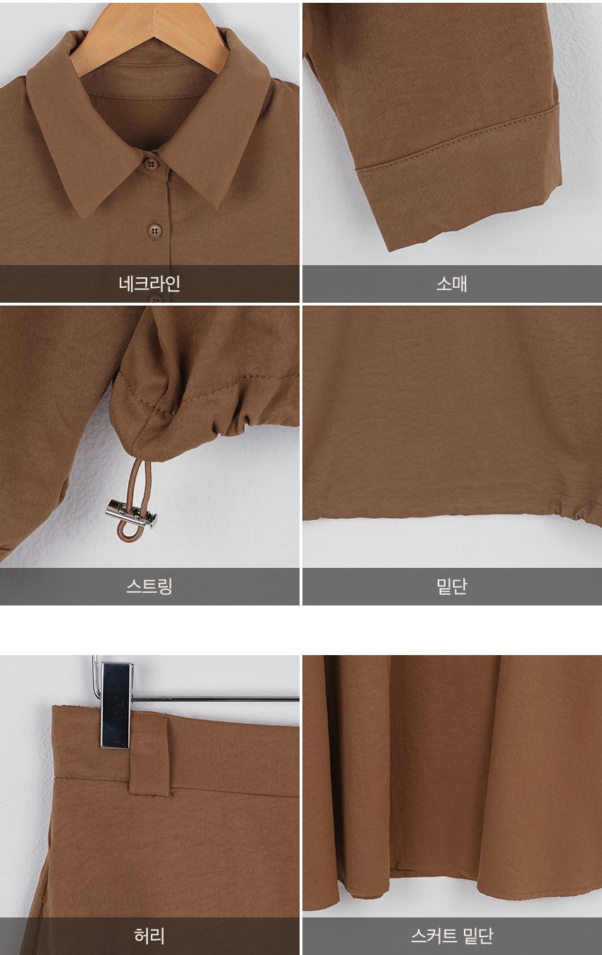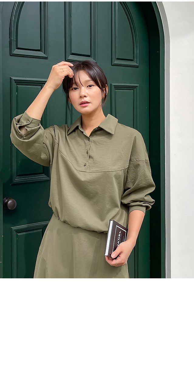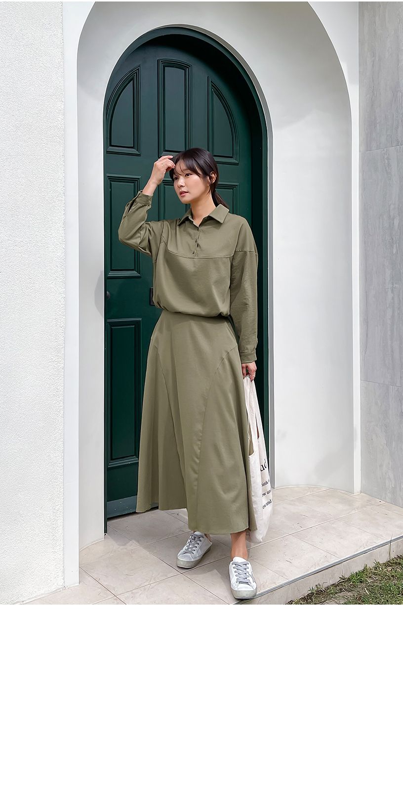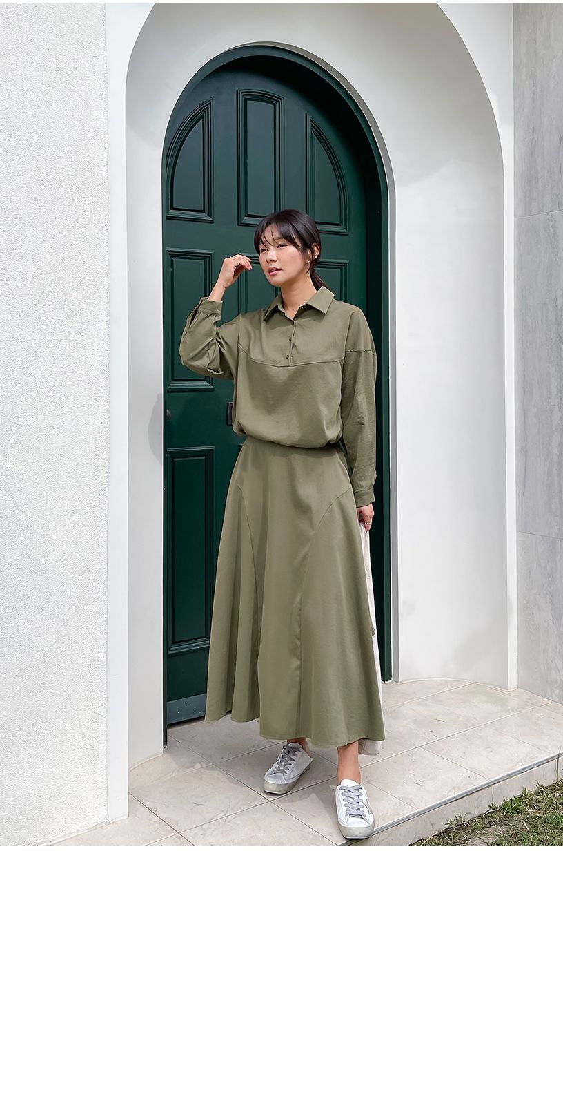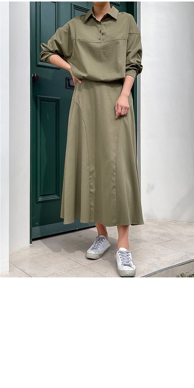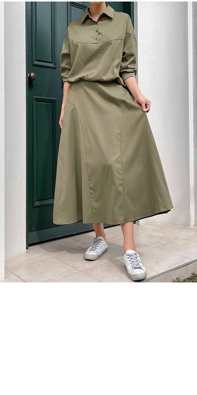 超值兩件組/半開襟襯衫/弧形切割/抽繩收腰/下襬抽繩/後腰鬆緊/皮帶環/無口袋/A字傘裙 - 休閒居家婚禮OL上班族簡約百搭素面兩件式套裝襯衫套裝襯衫傘裙套裝收腰長袖上衣後腰鬆緊長裙棕色米色黑色卡其綠色