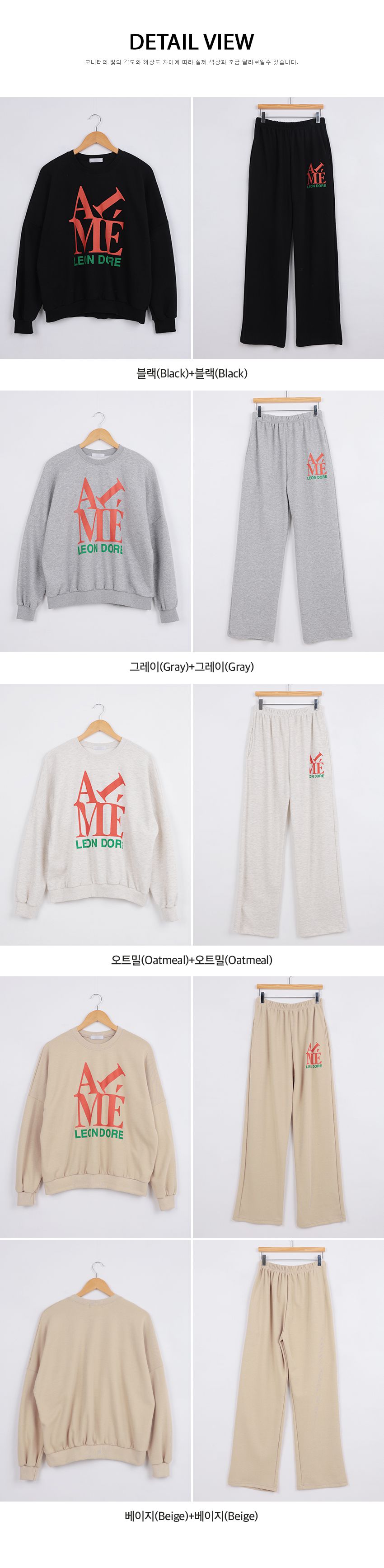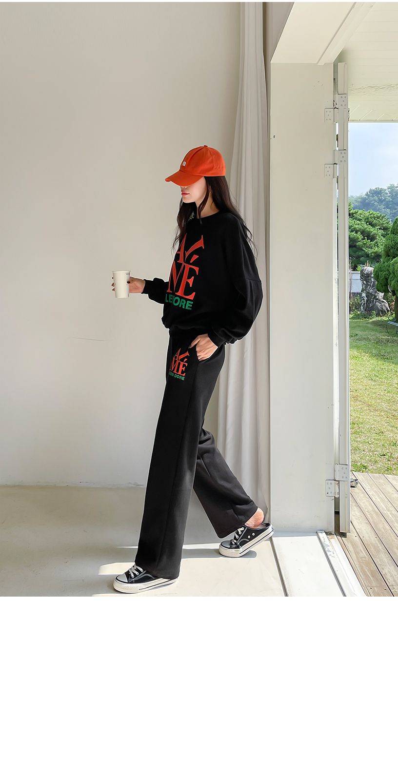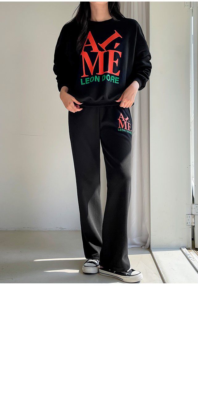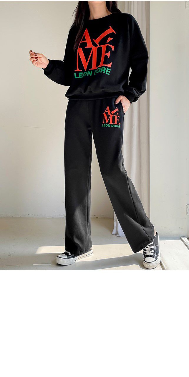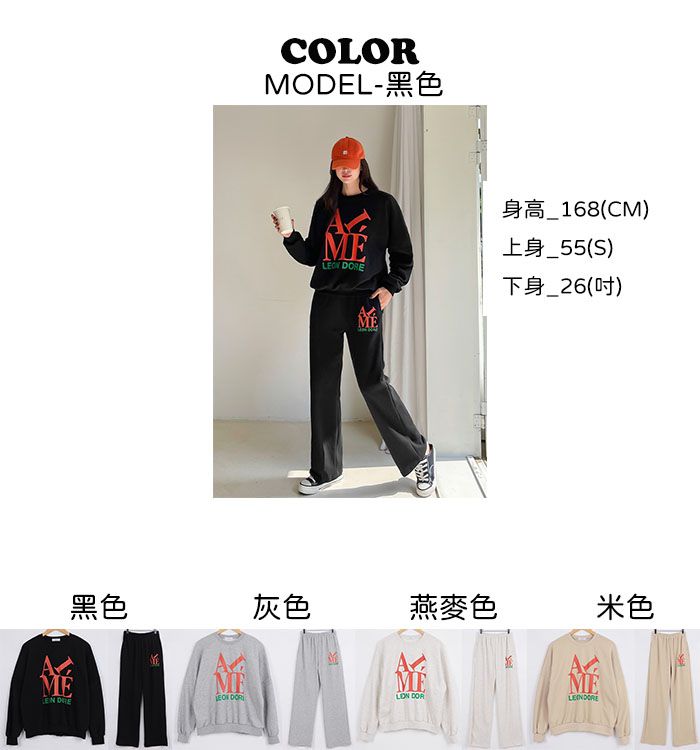 超值兩件組/膠印字母/撞色字母/跳色字母/圓領/全腰鬆緊/雙口袋/直筒褲 - 休閒居家英文字母套裝運動套裝兩件式套裝螢光字母套裝長袖上衣直筒長褲黑色灰色燕麥色米色