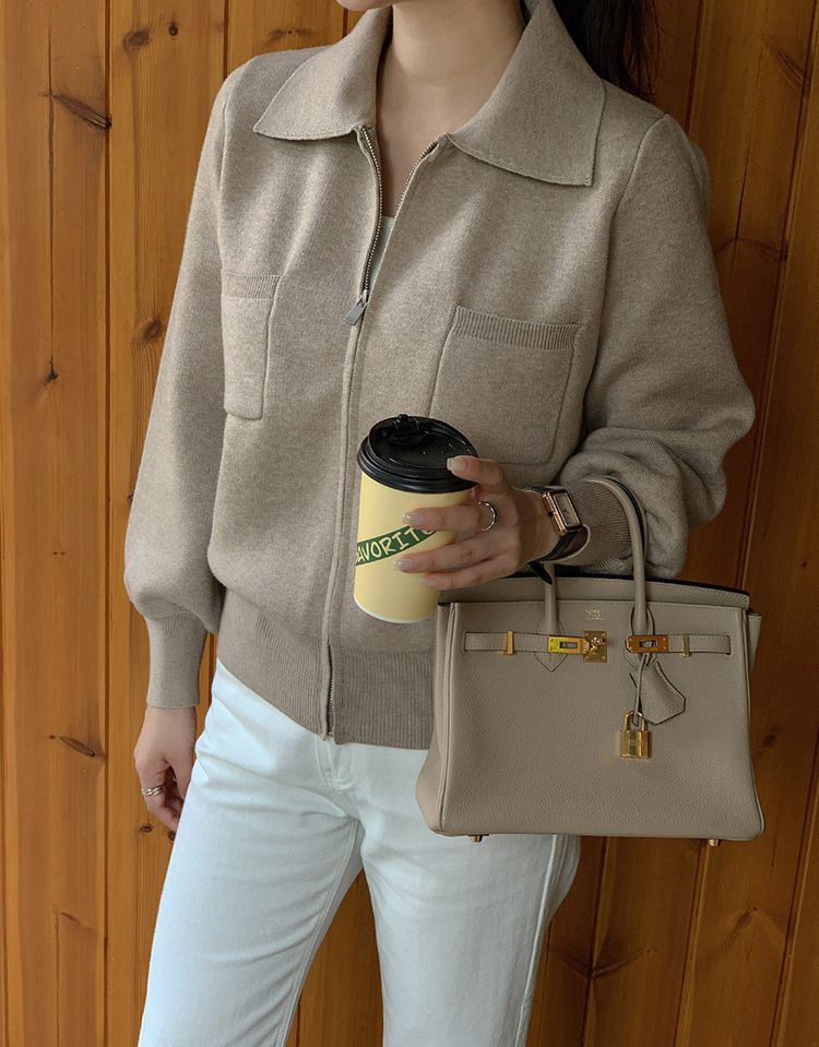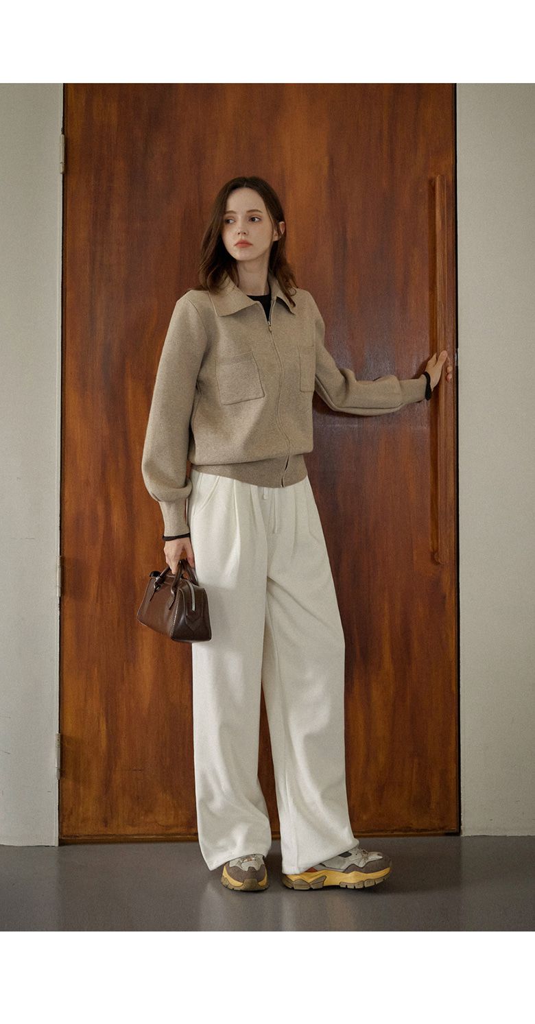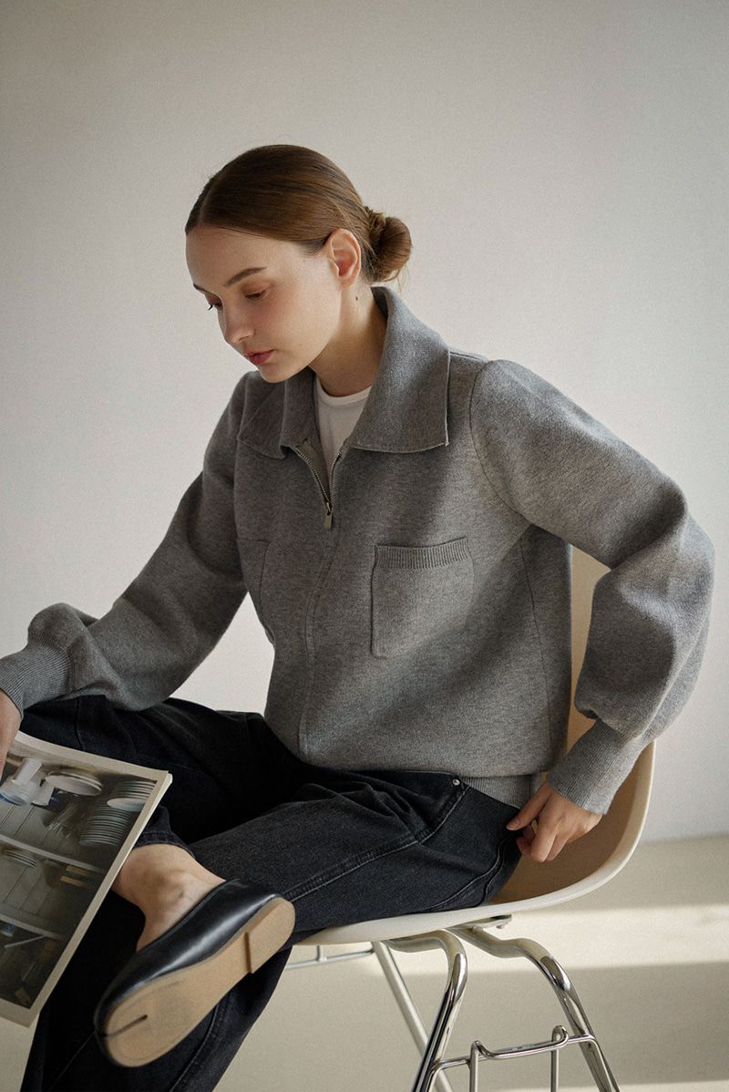 縝密針織/厚實面料/雙口袋/拉鍊外套/翻領 - 休閒居家簡約百搭素面厚實針織外套長袖外套拉鍊外套灰色奶油色米色黑色
