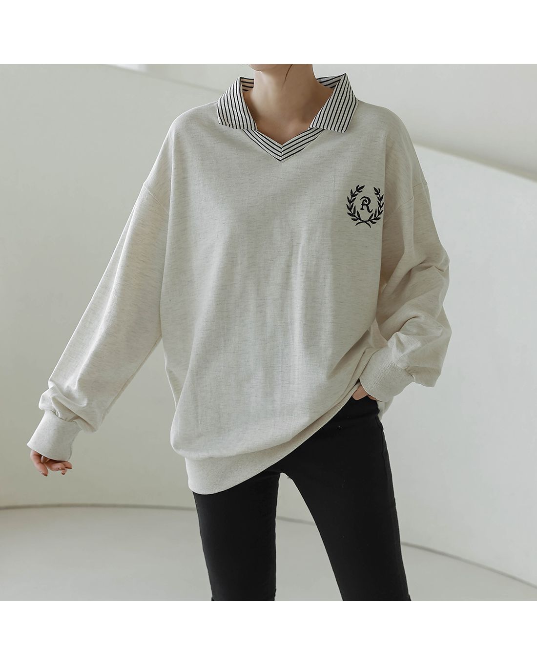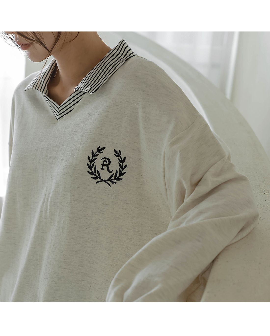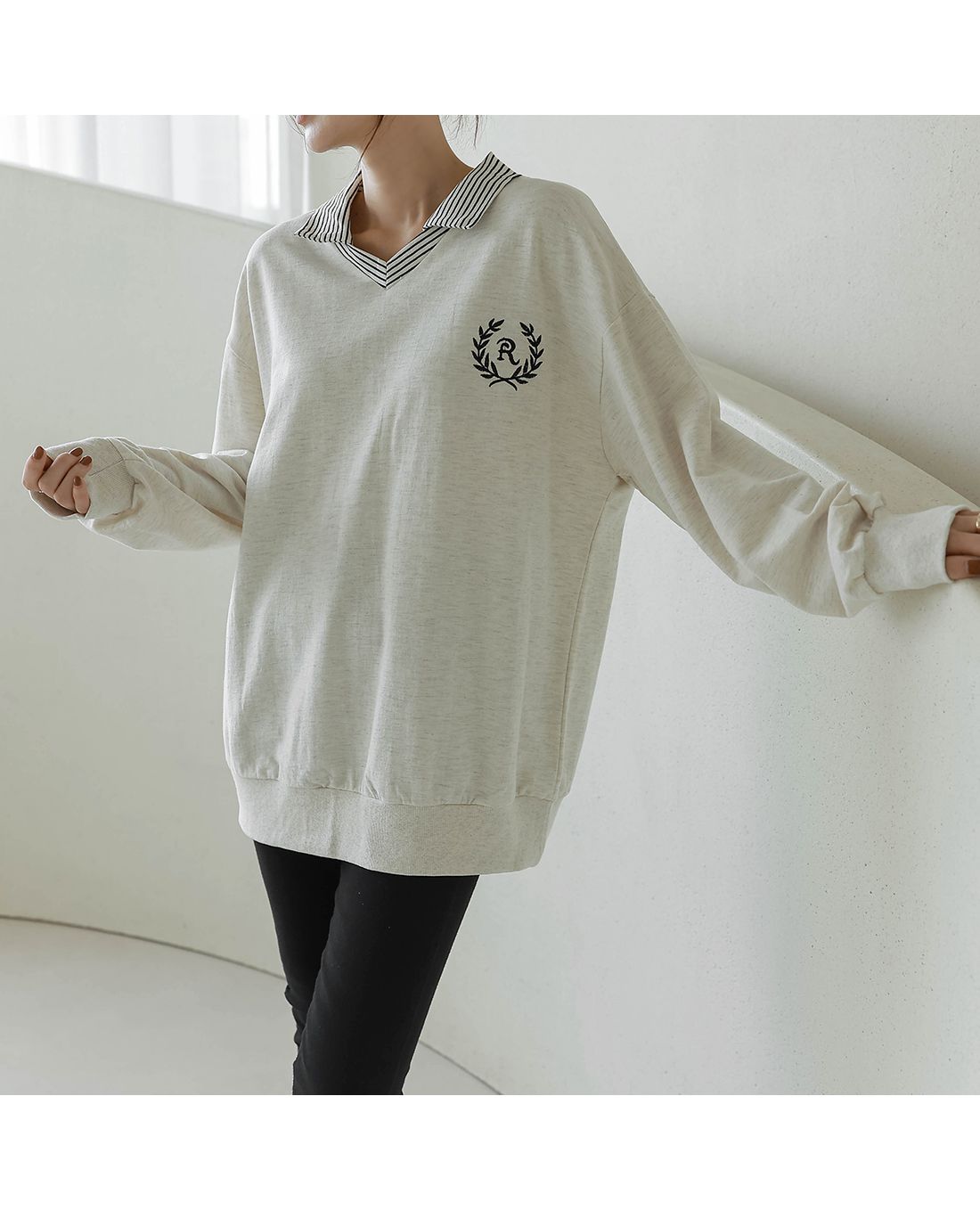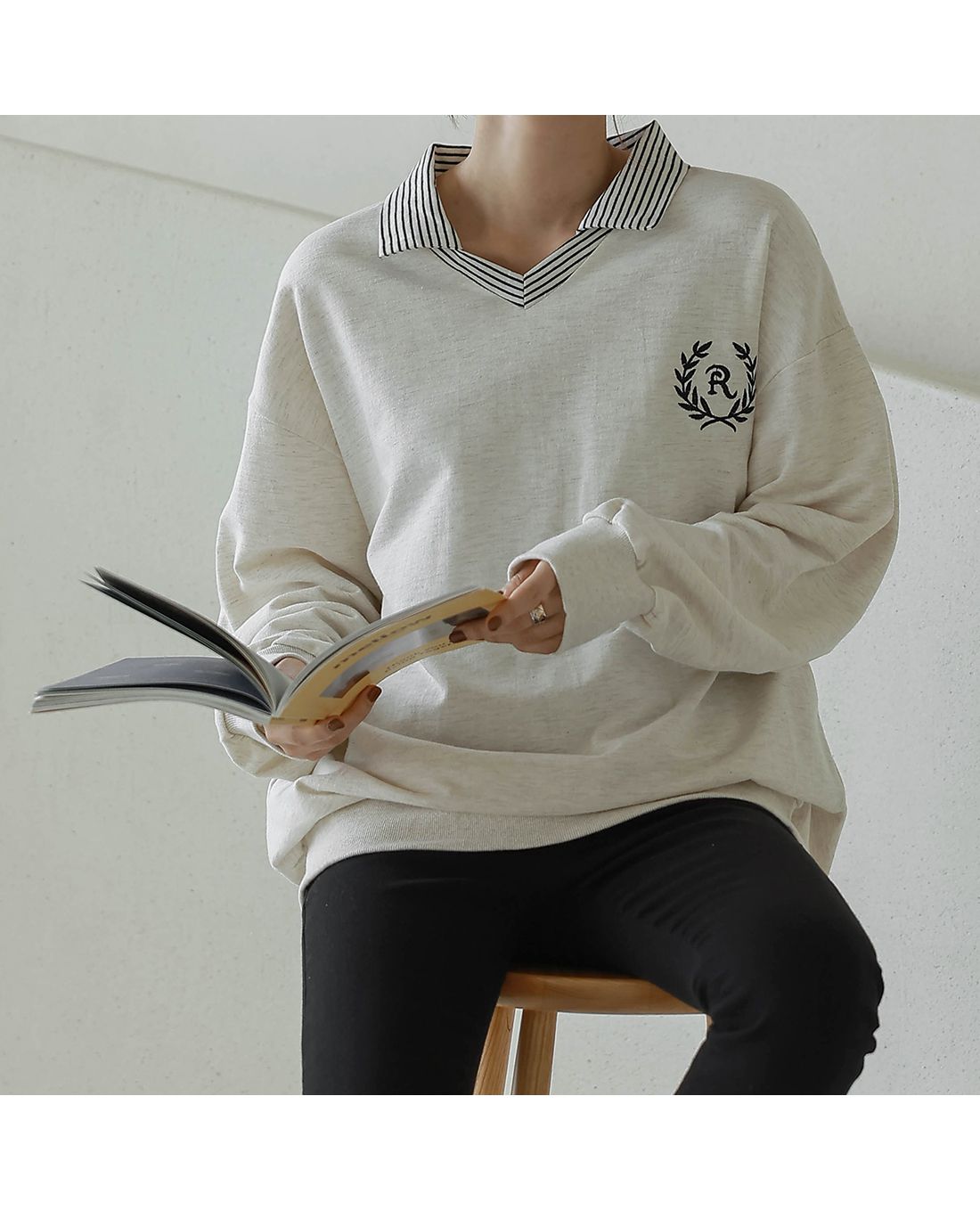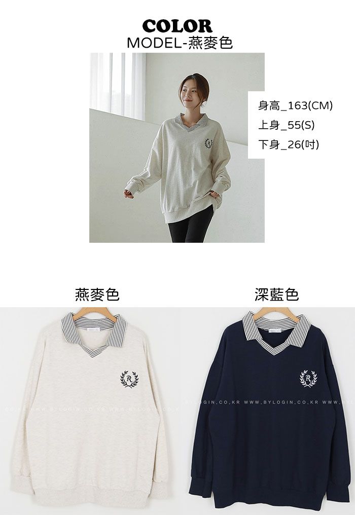 兩種尺寸/校徽LOGO/刺繡字母/R字母/V領/翻領/假兩件拼接/條紋襯衫領/寬鬆長版 - 休閒居家英文字母上衣字母T恤刺繡大學T寬鬆大尺碼上衣長版上衣長袖上衣多尺寸LXL燕麥色深藍色