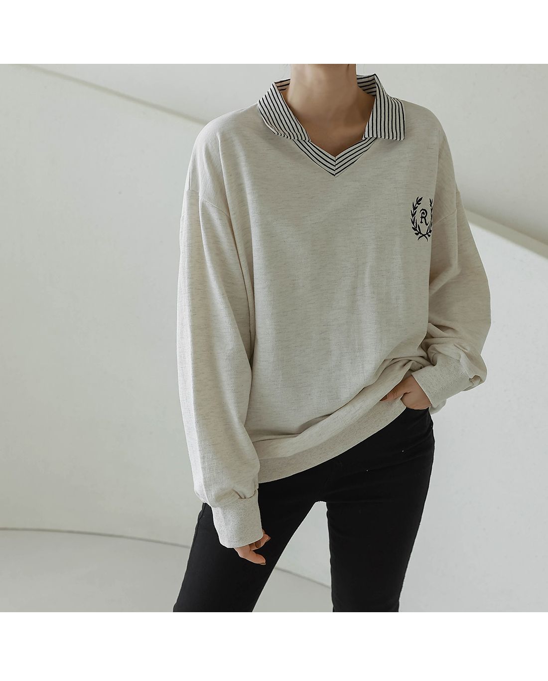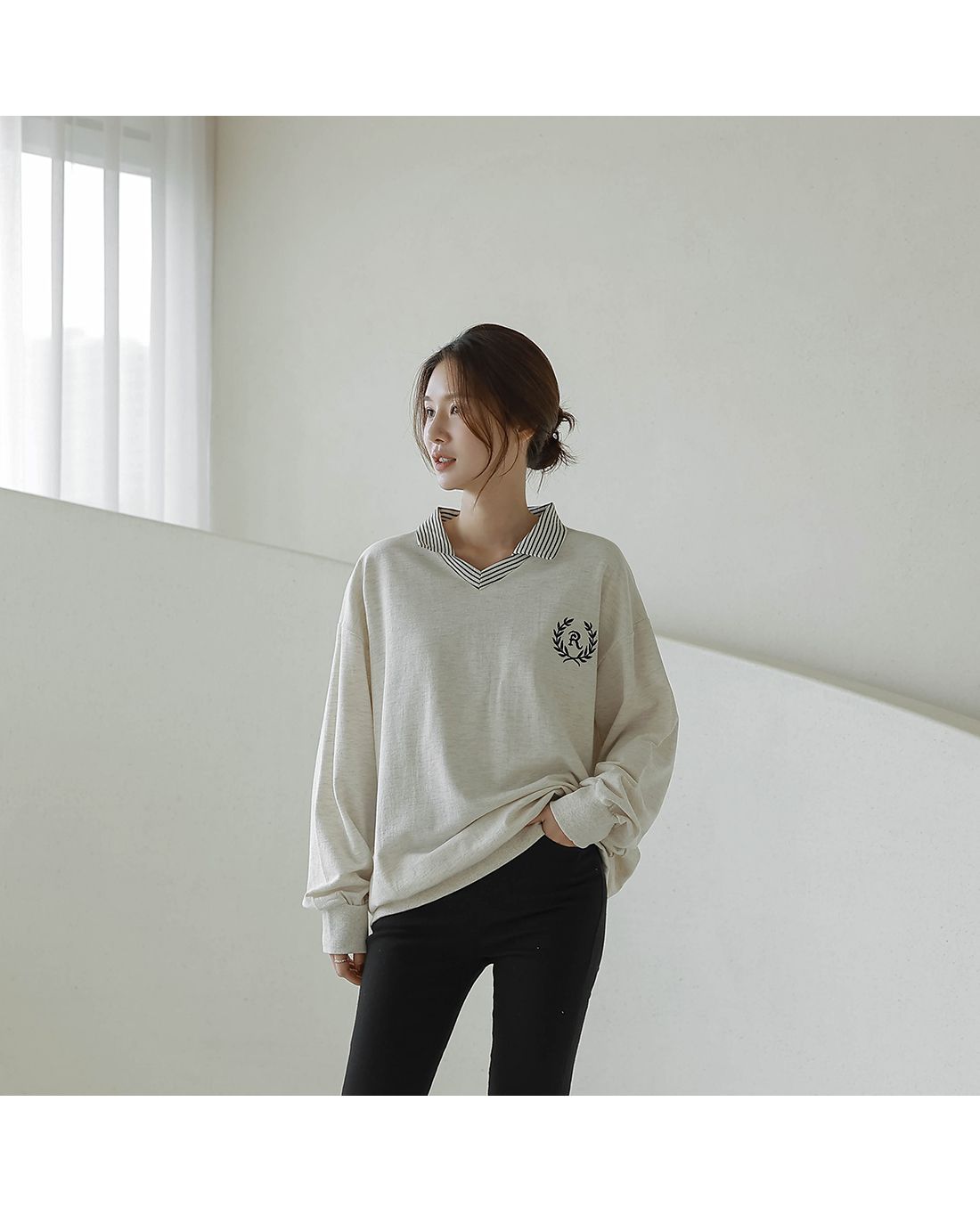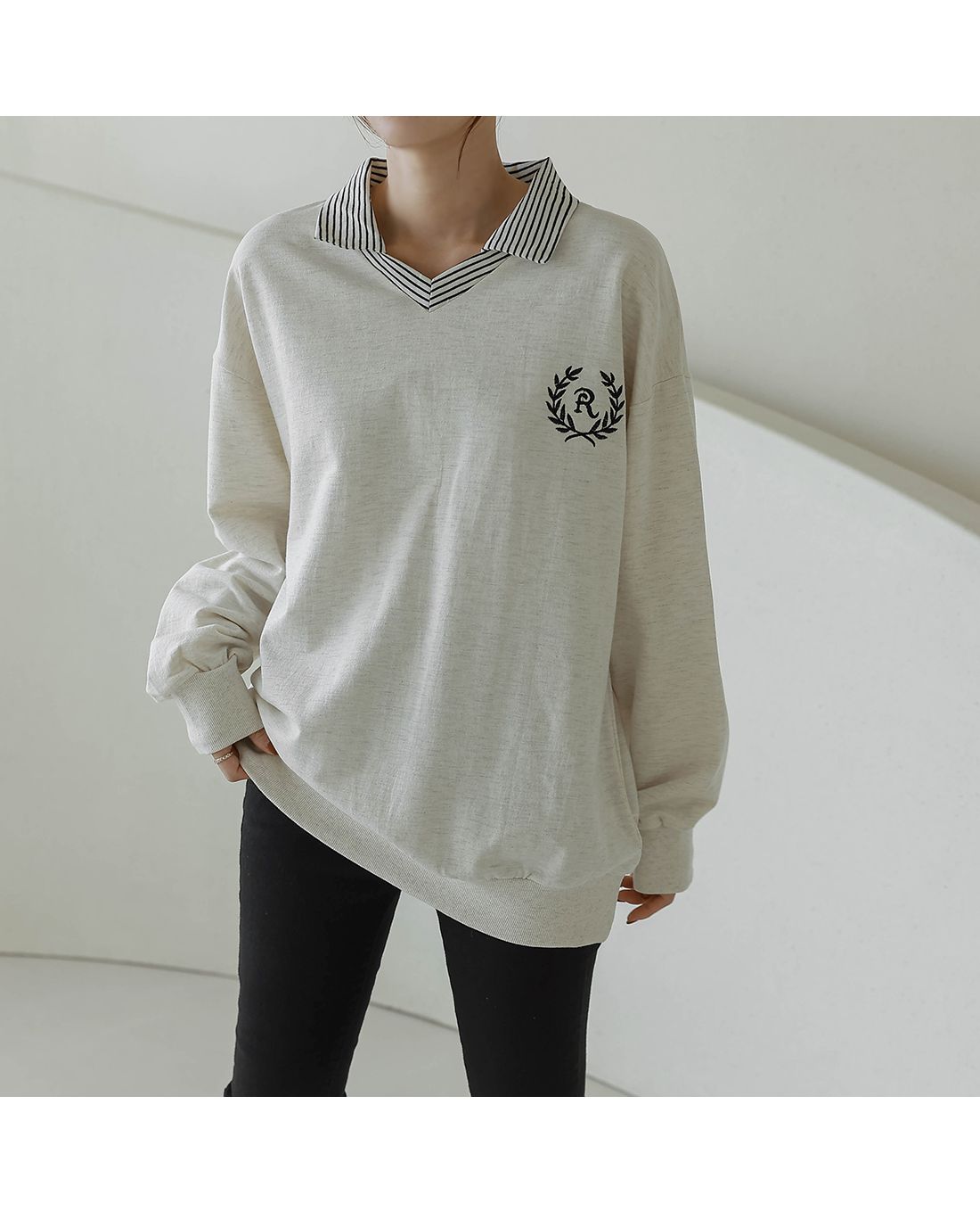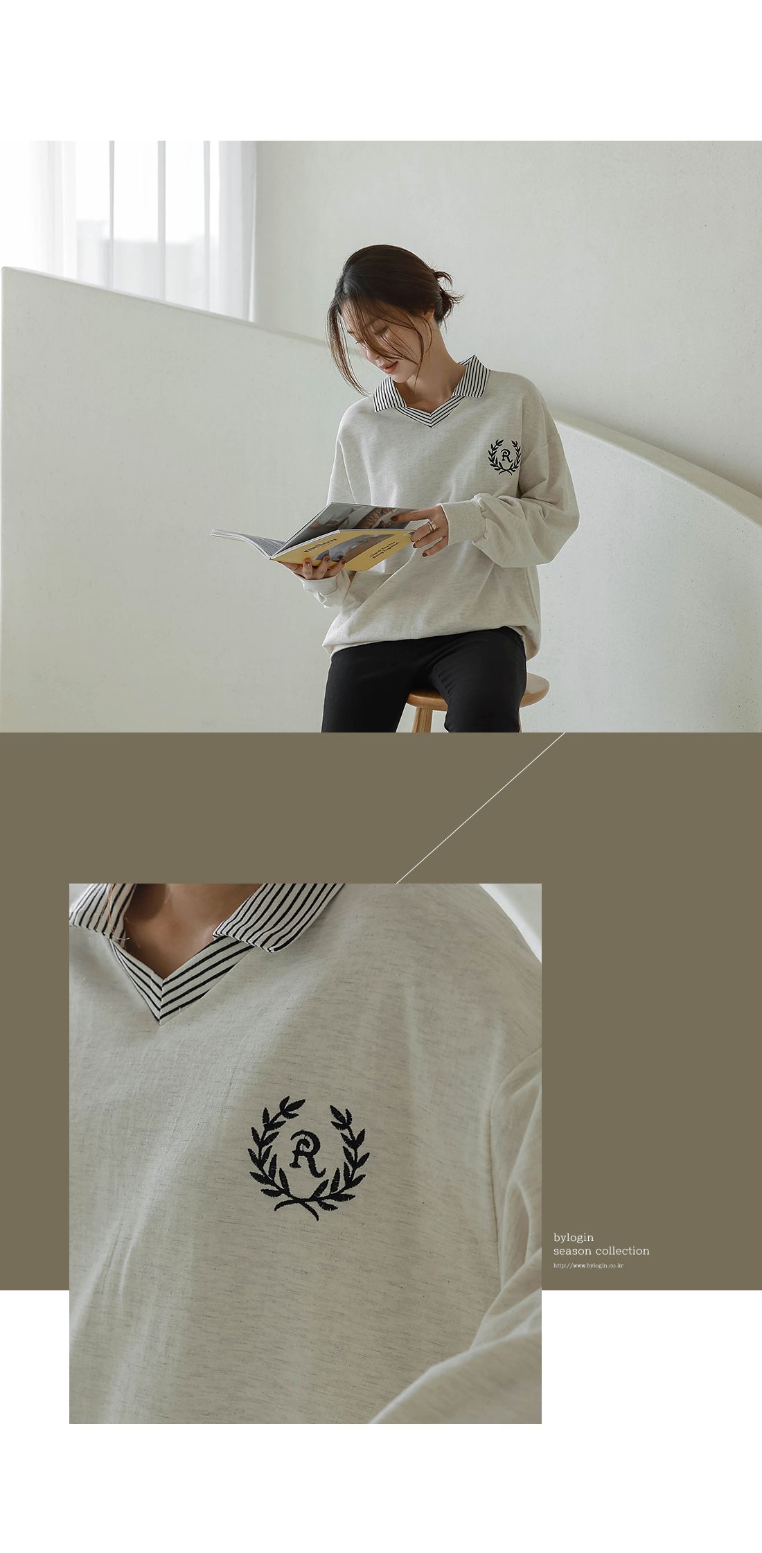 兩種尺寸/校徽LOGO/刺繡字母/R字母/V領/翻領/假兩件拼接/條紋襯衫領/寬鬆長版 - 休閒居家英文字母上衣字母T恤刺繡大學T寬鬆大尺碼上衣長版上衣長袖上衣多尺寸LXL燕麥色深藍色