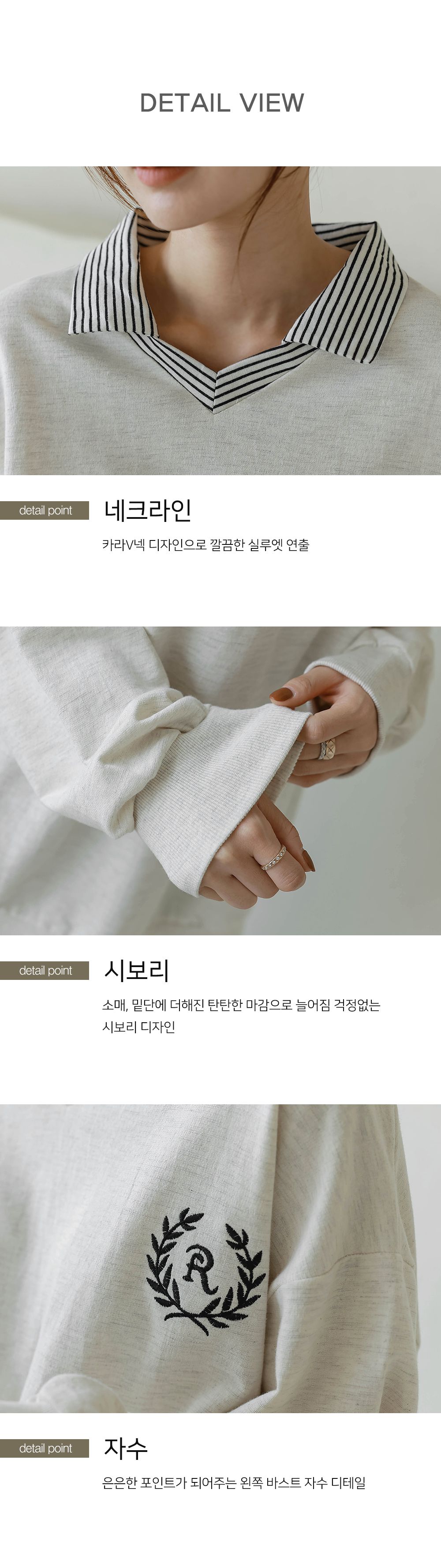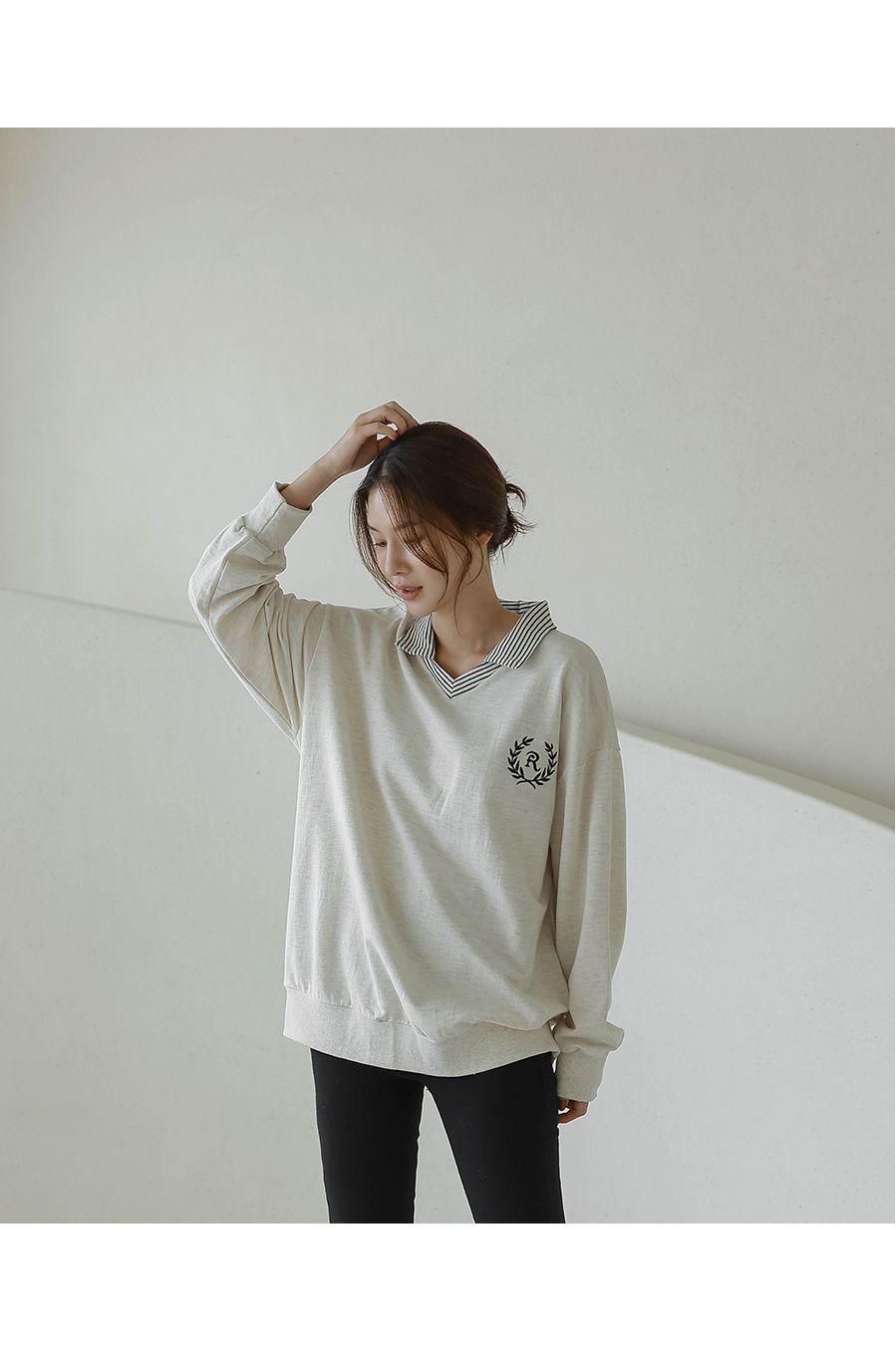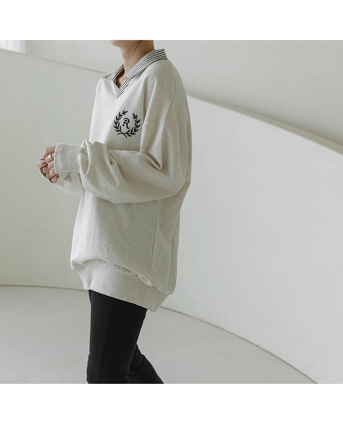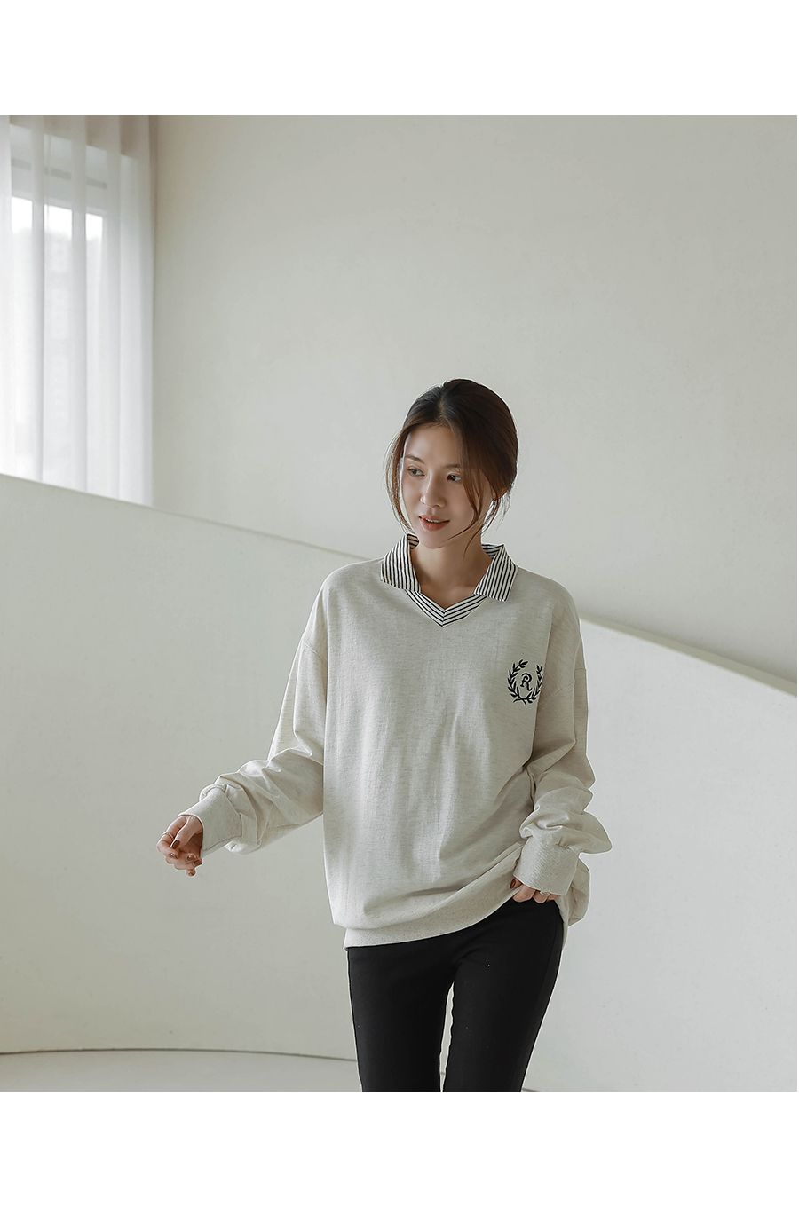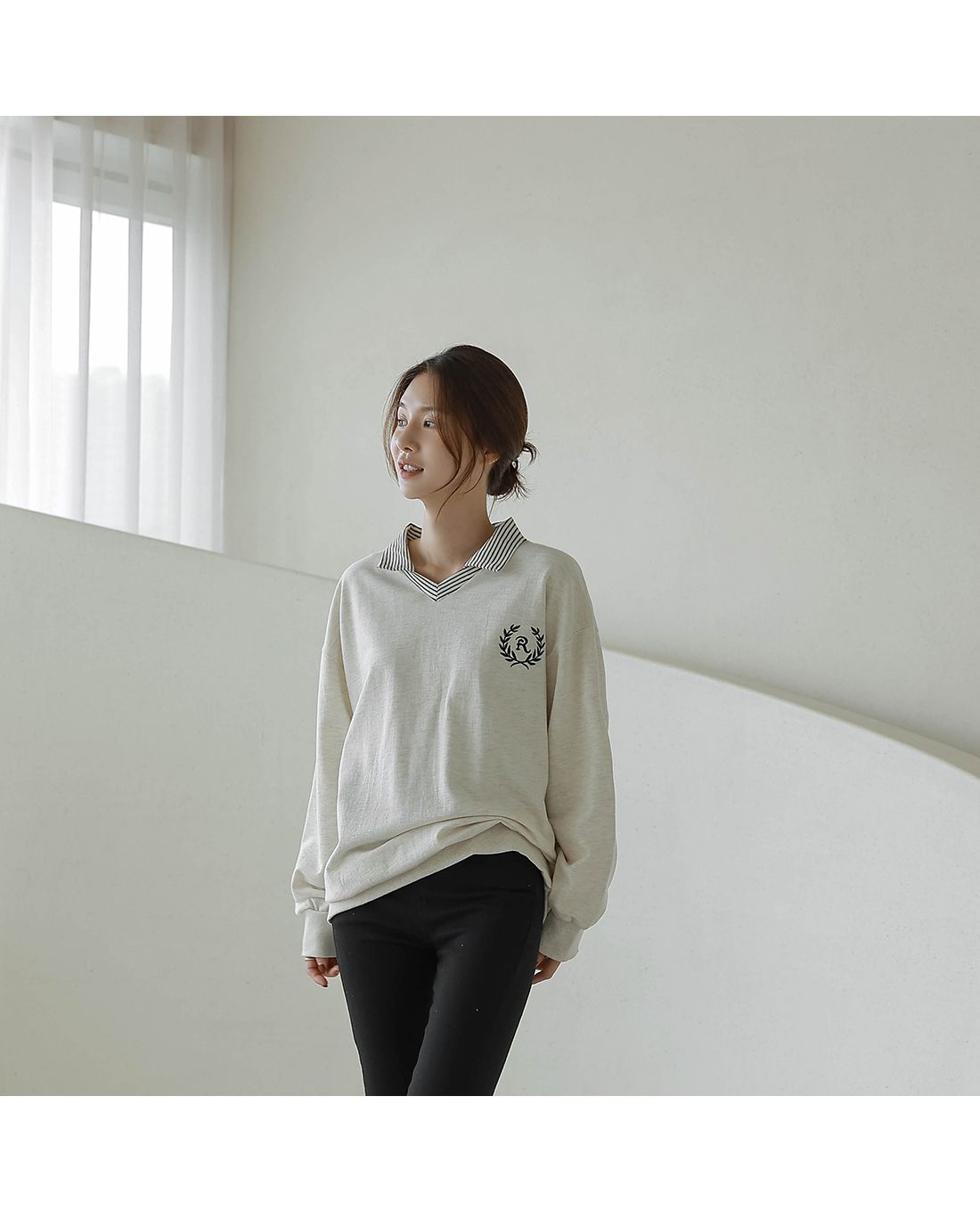 兩種尺寸/校徽LOGO/刺繡字母/R字母/V領/翻領/假兩件拼接/條紋襯衫領/寬鬆長版 - 休閒居家英文字母上衣字母T恤刺繡大學T寬鬆大尺碼上衣長版上衣長袖上衣多尺寸LXL燕麥色深藍色