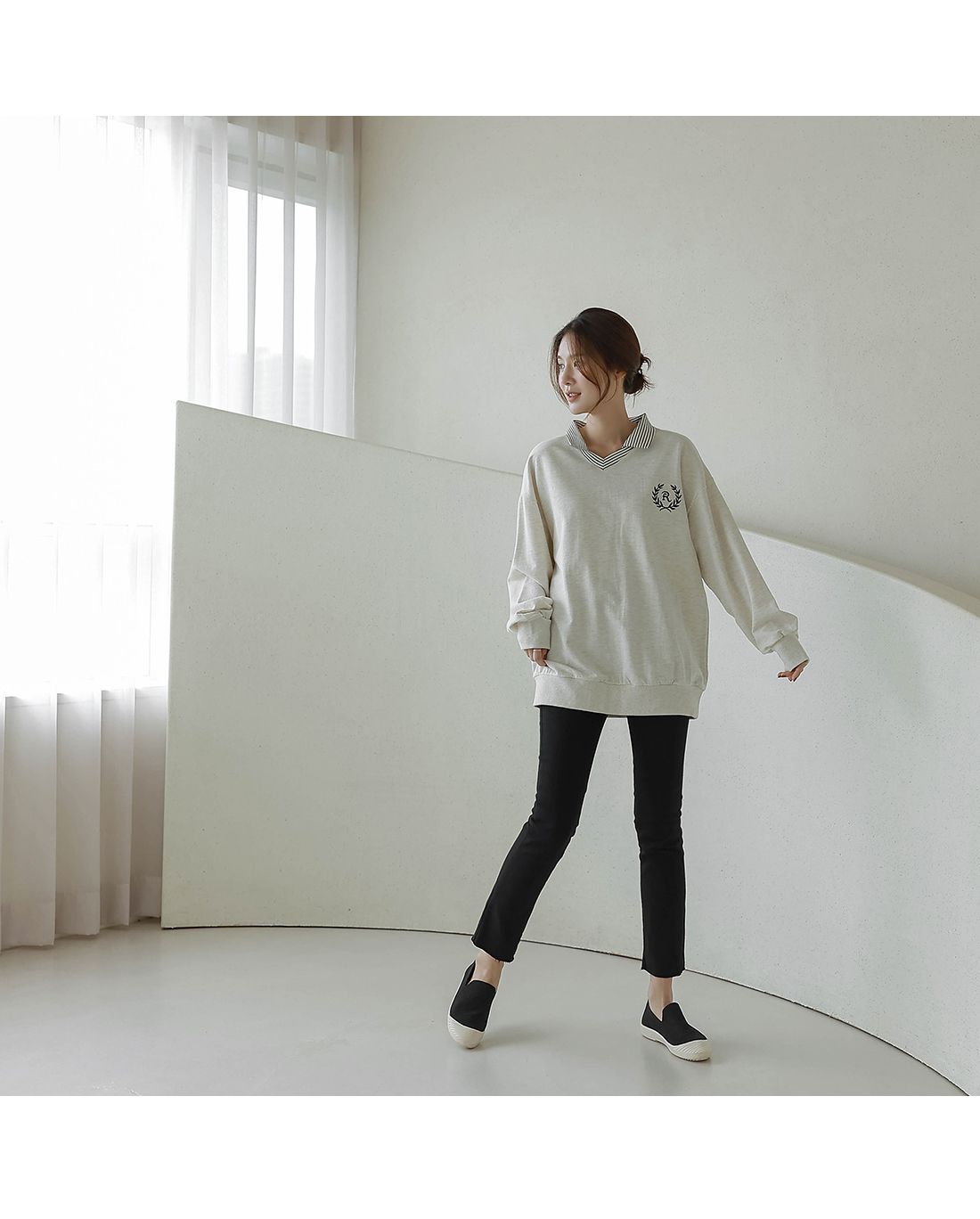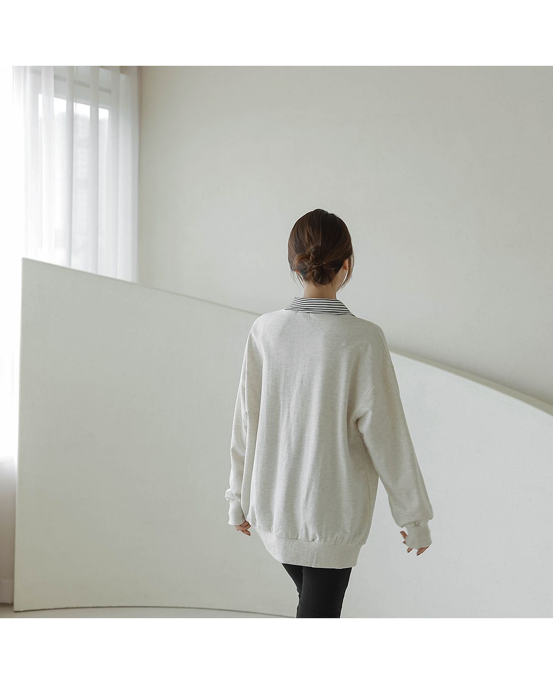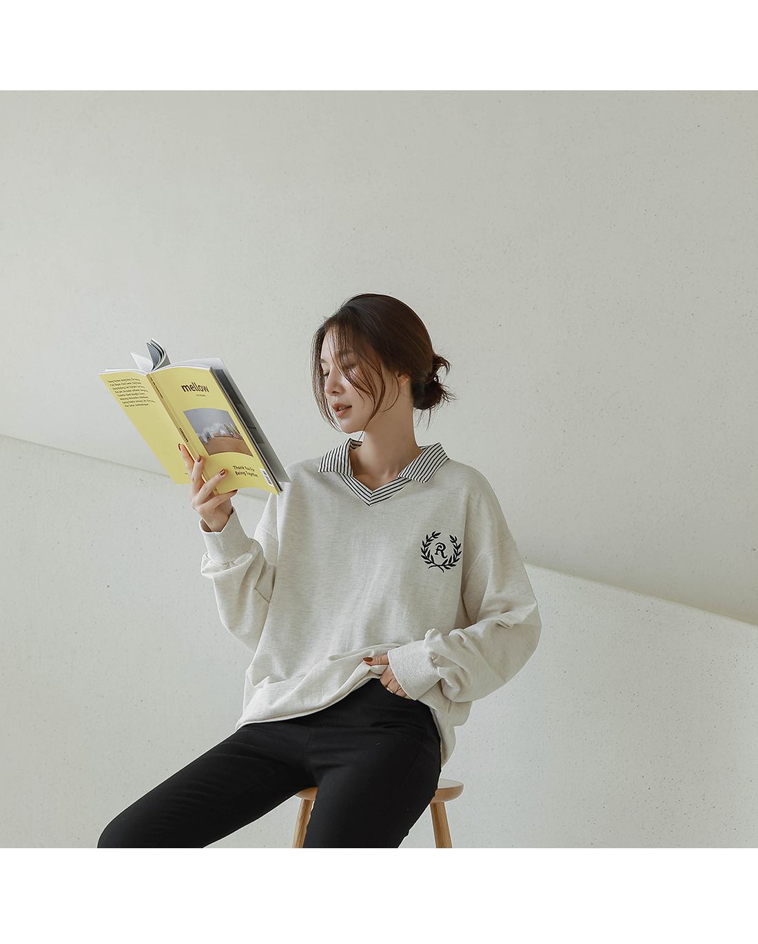 【C55663】韓國BLG 刺繡大學T-拼接條紋襯衫領寬鬆長版長袖字母上衣