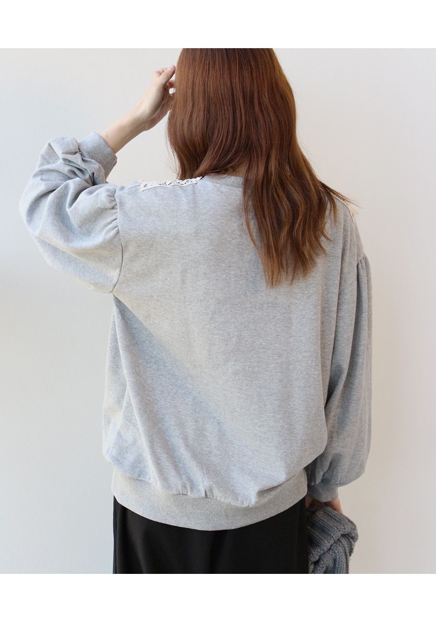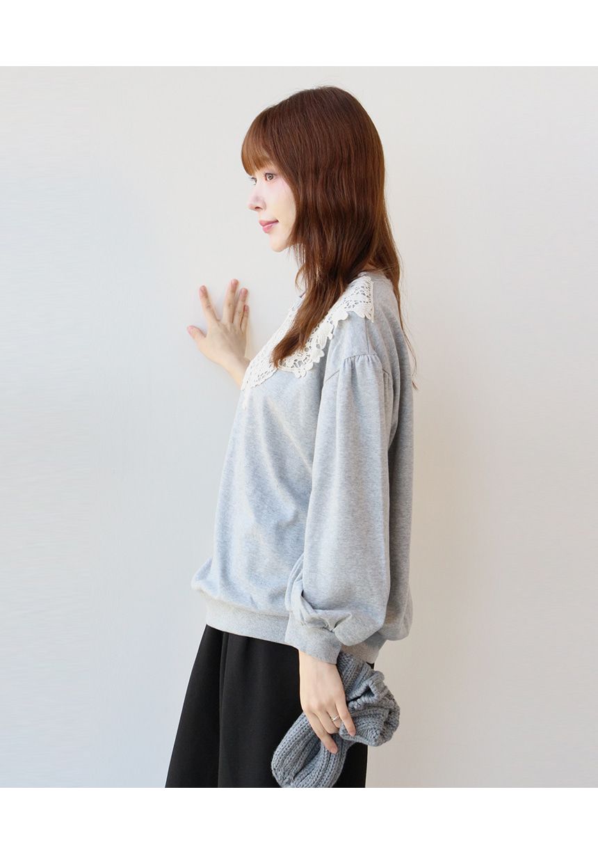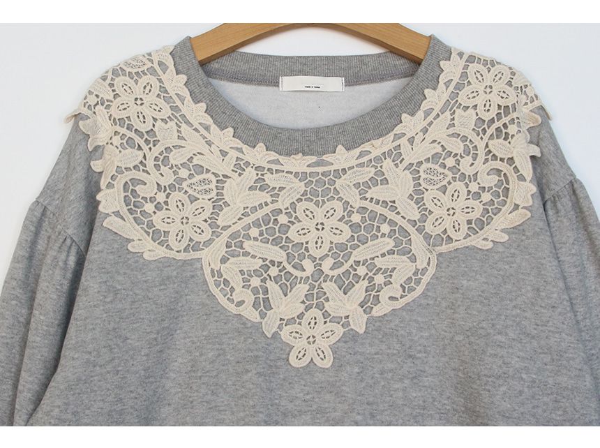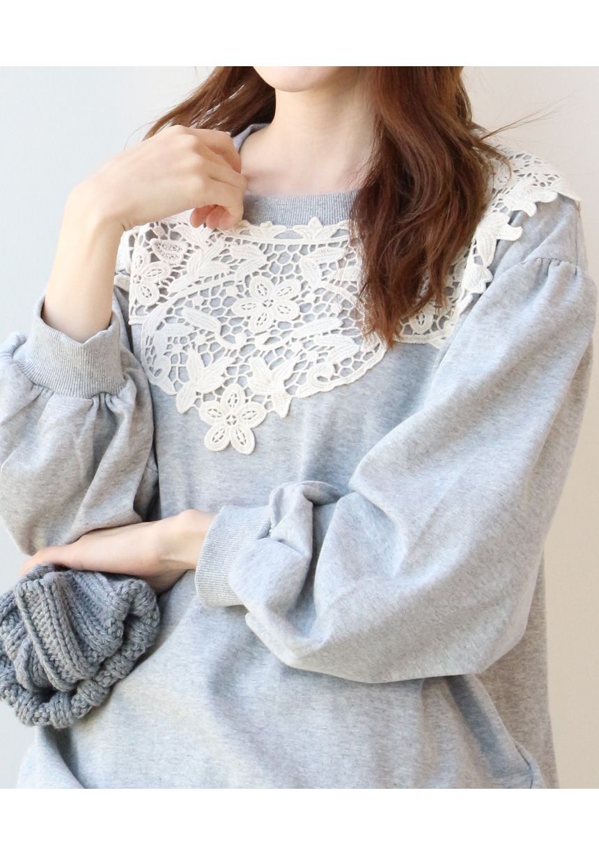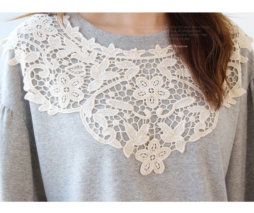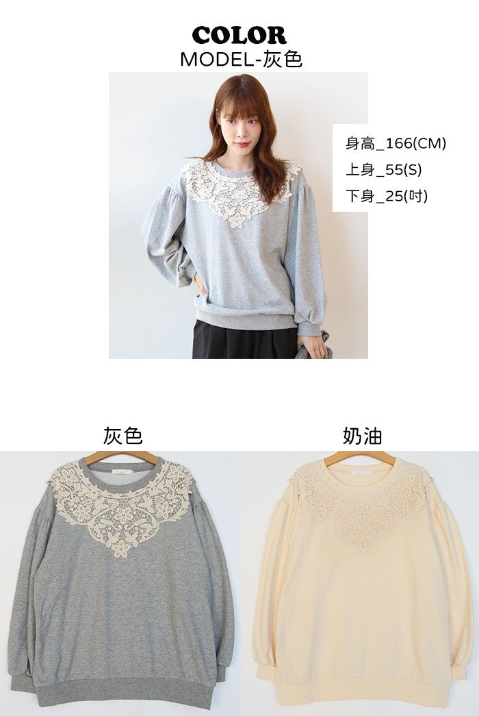 圓領/寬袖/縷空蕾絲雕花/雕花領片/泡泡袖/寬袖 - 休閒居家簡約百搭素面蕾絲拼接大學T長袖上衣灰色奶油色