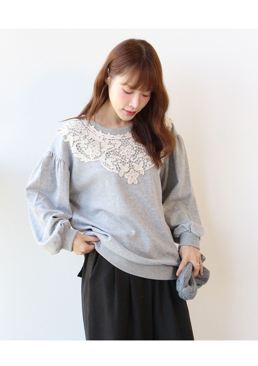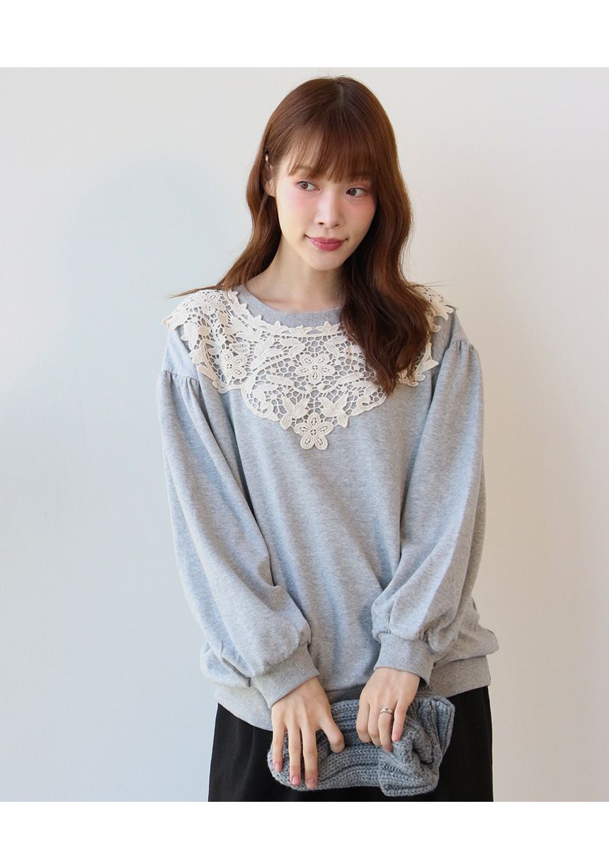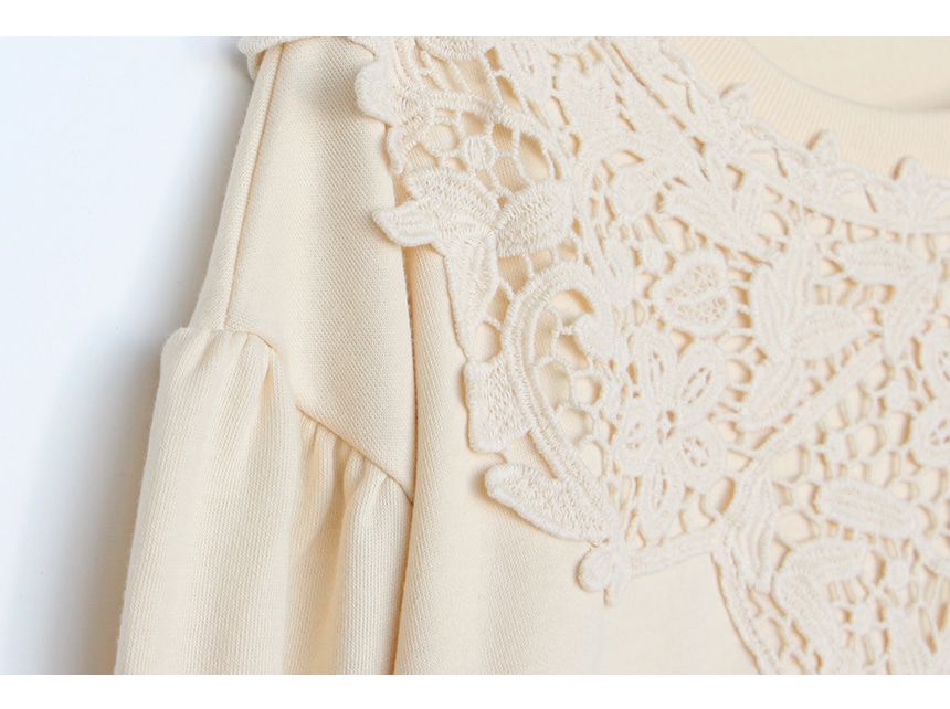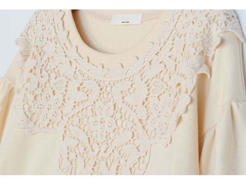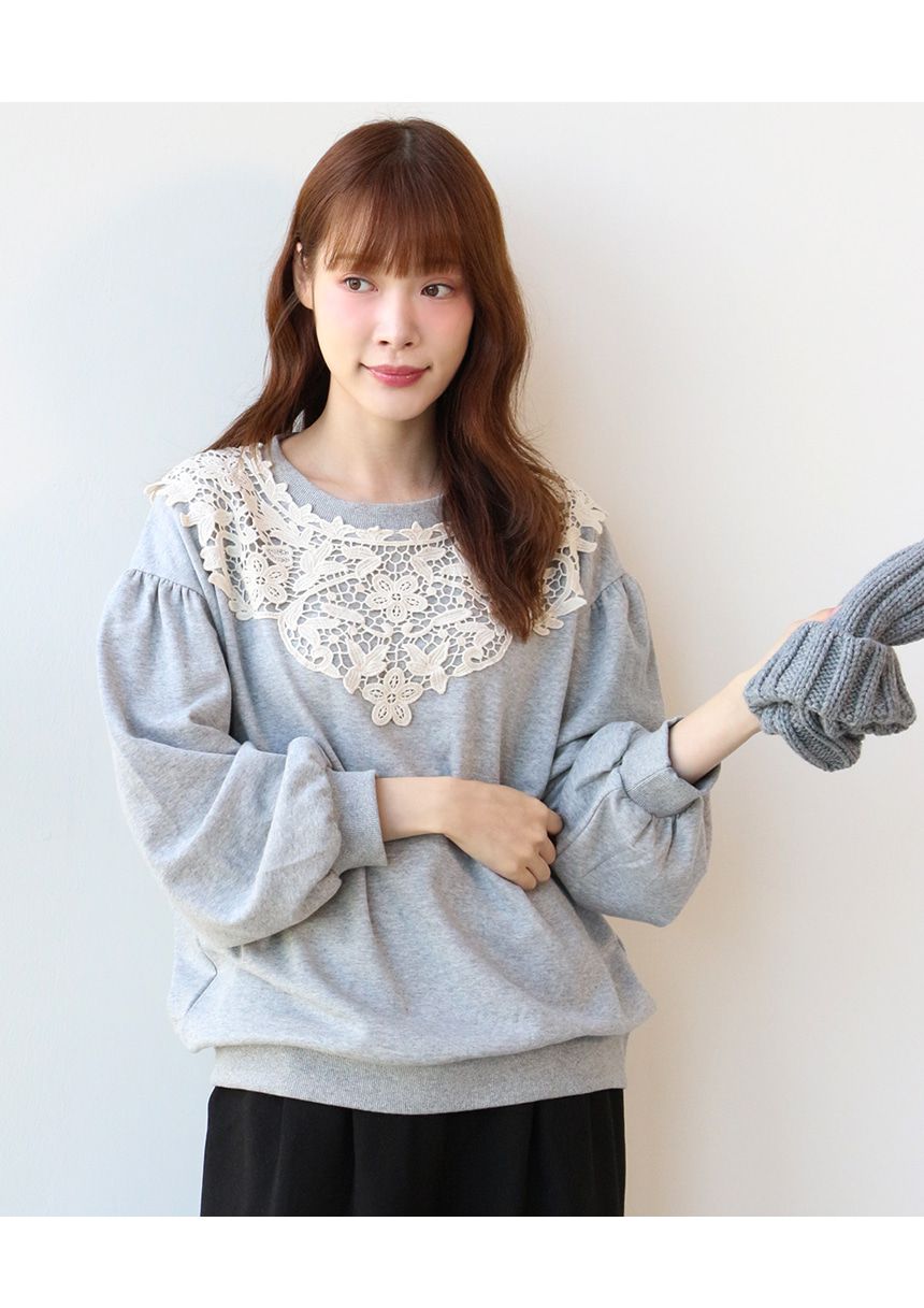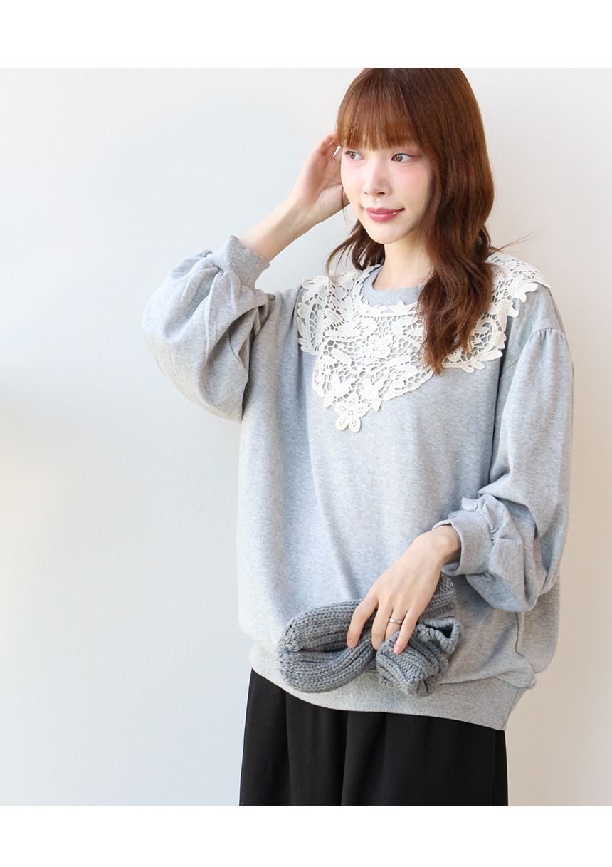 圓領/寬袖/縷空蕾絲雕花/雕花領片/泡泡袖/寬袖 - 休閒居家簡約百搭素面蕾絲拼接大學T長袖上衣灰色奶油色