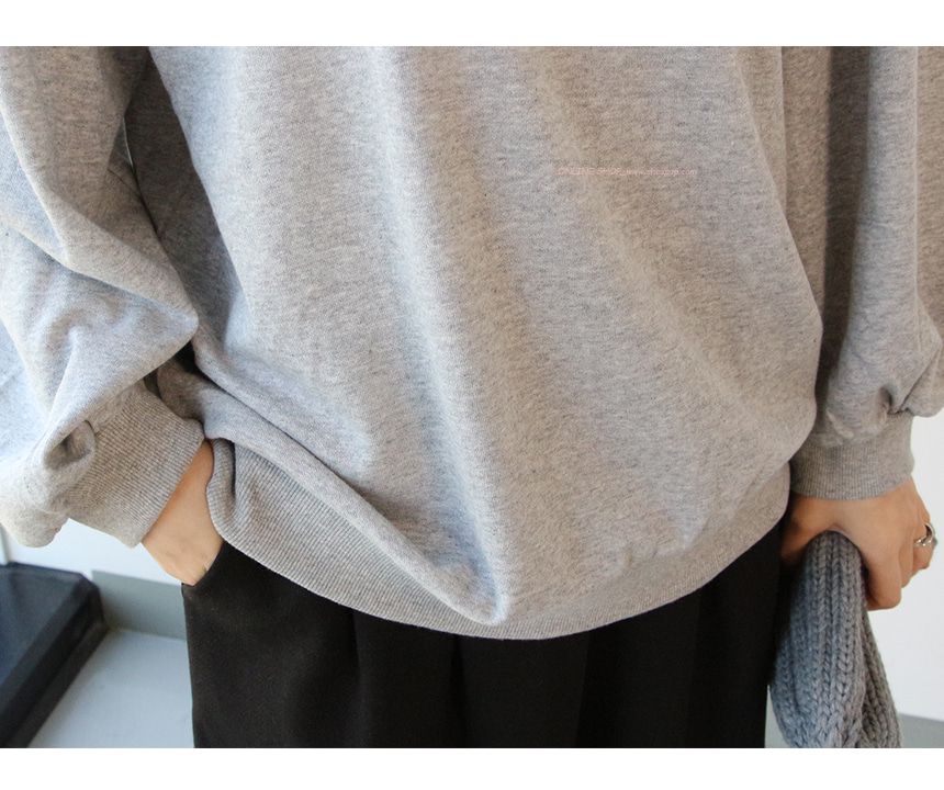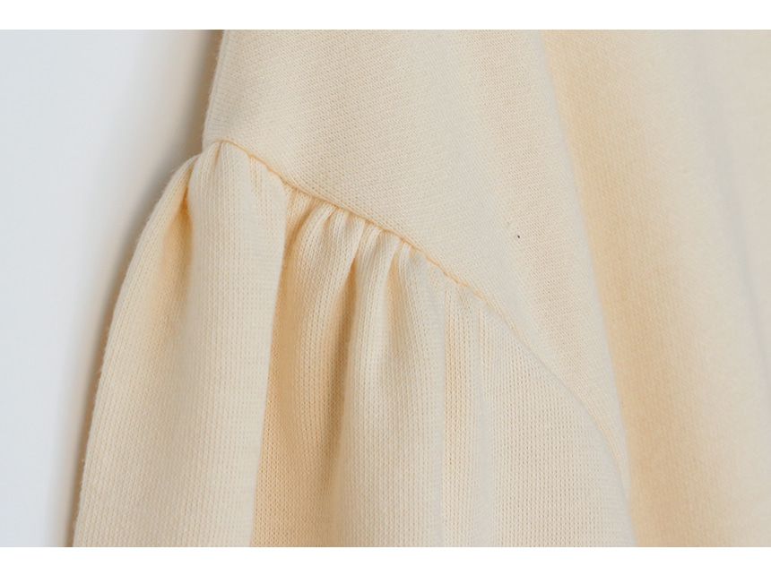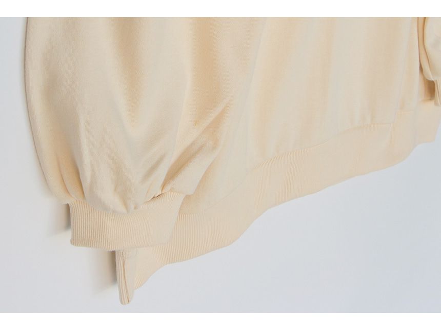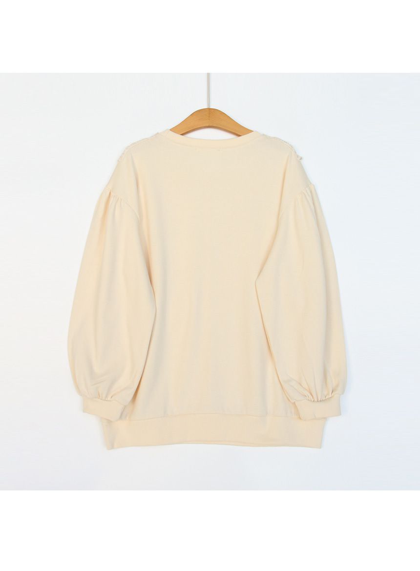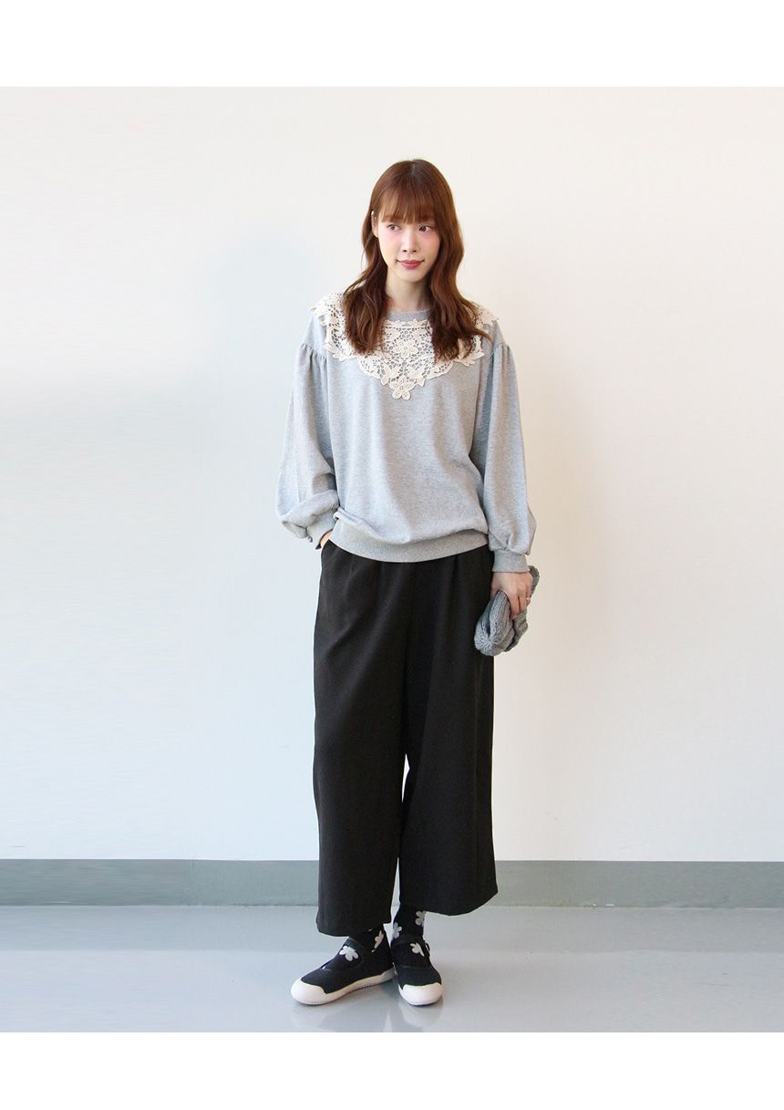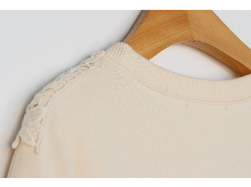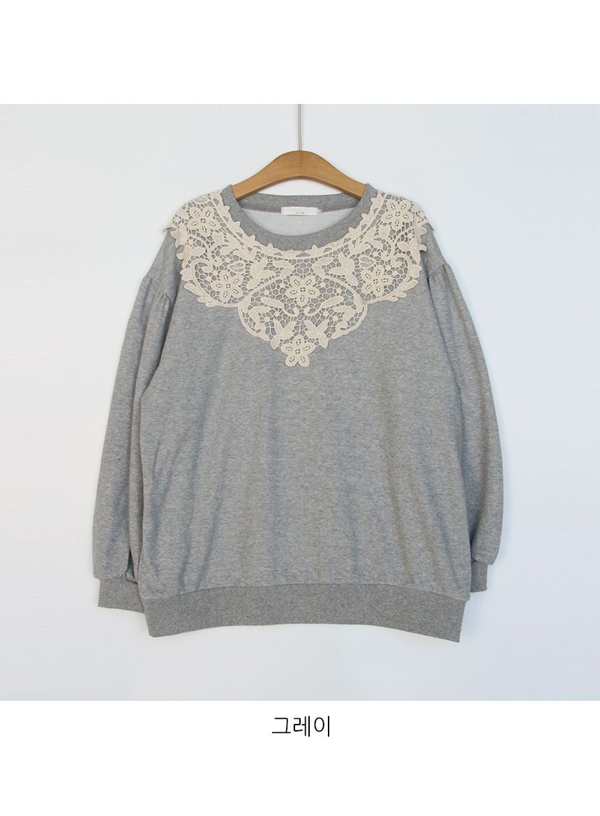 圓領/寬袖/縷空蕾絲雕花/雕花領片/泡泡袖/寬袖 - 休閒居家簡約百搭素面蕾絲拼接大學T長袖上衣灰色奶油色