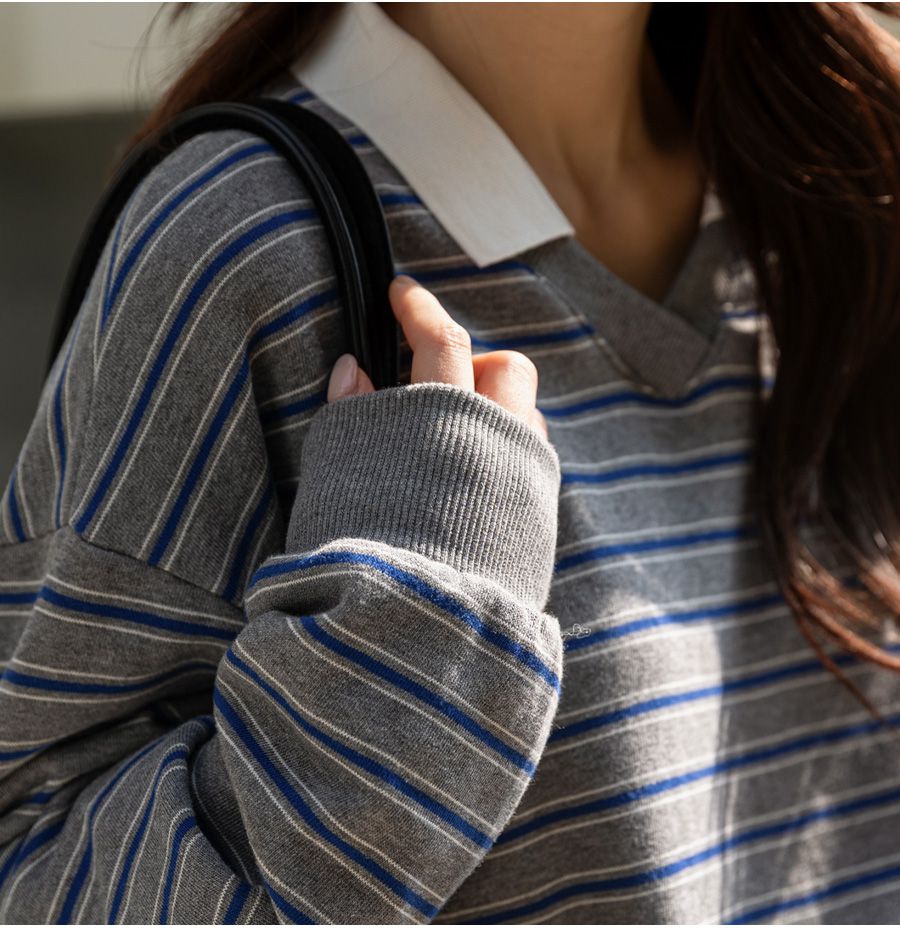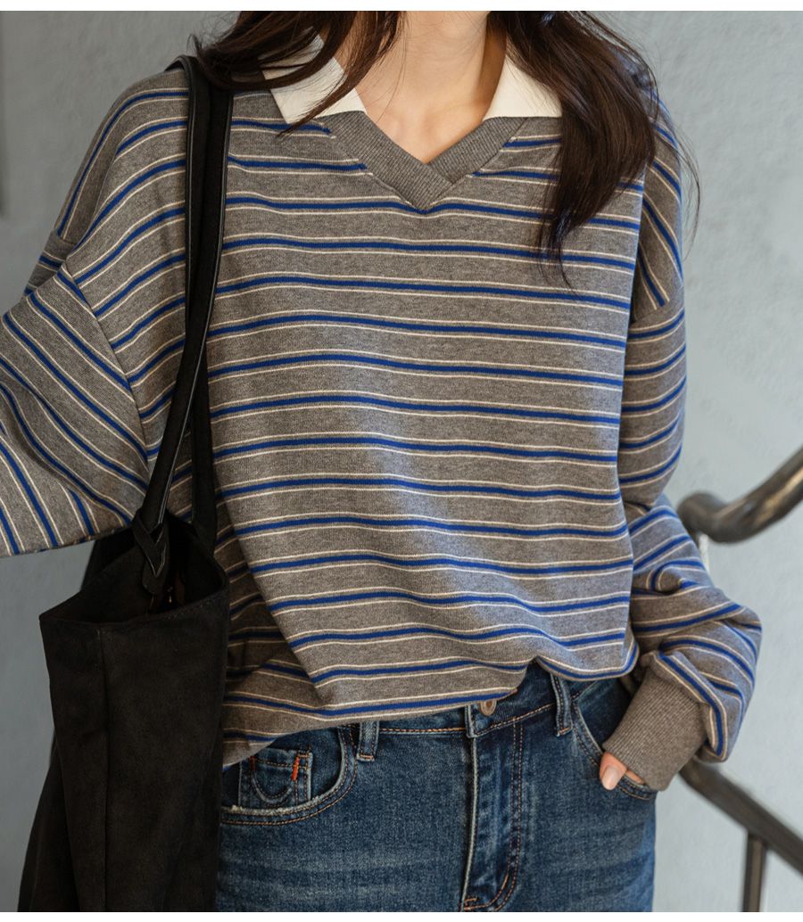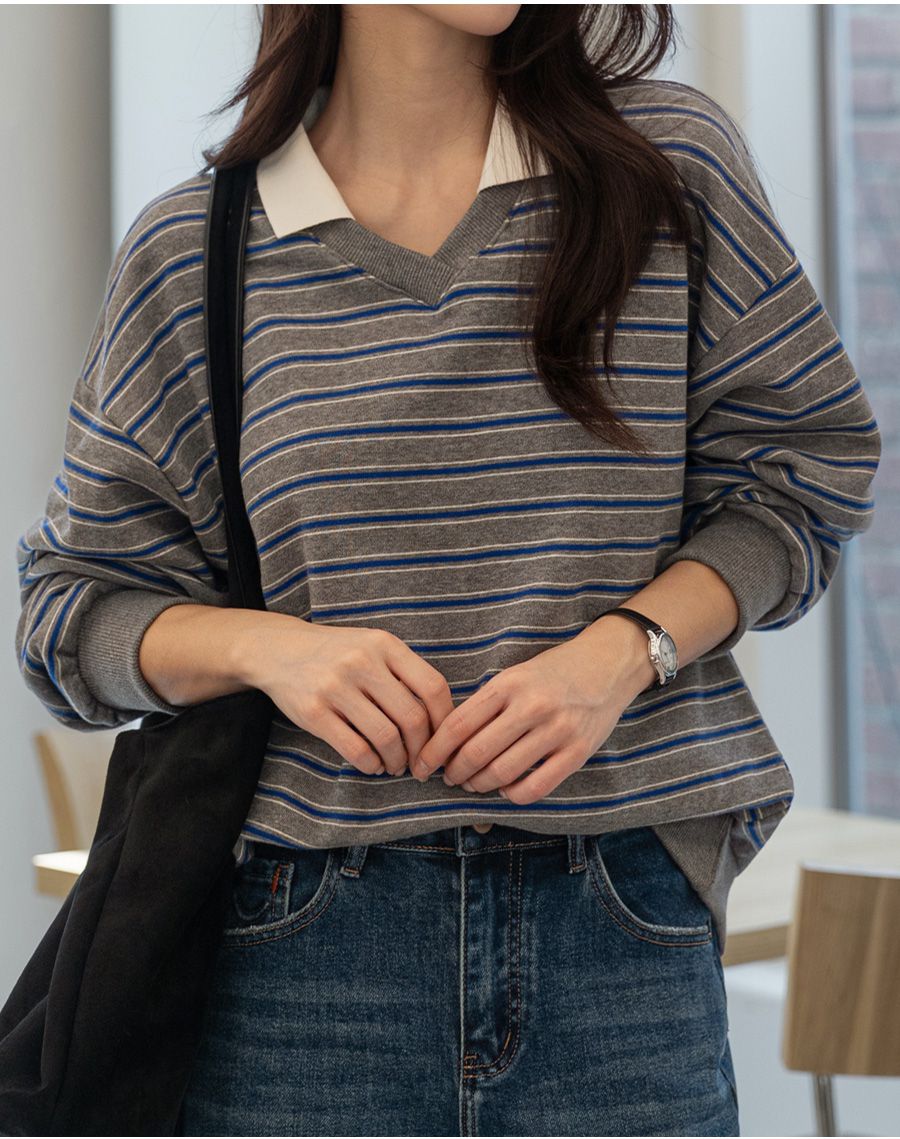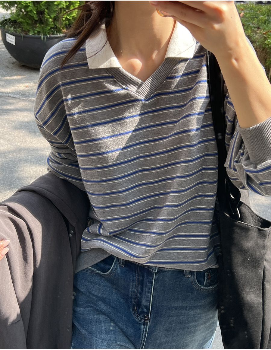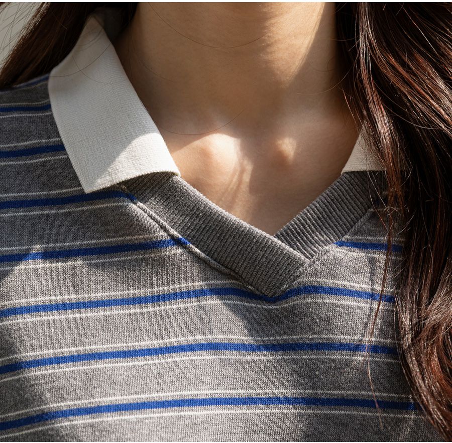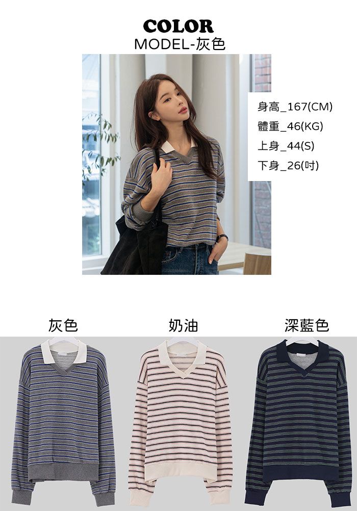 假兩件拼接/V領/拼接襯衫領/翻領/經典條紋色 - 休閒居家配色條紋上衣條紋POLO衫休閒長袖上衣灰色奶油色深藍色