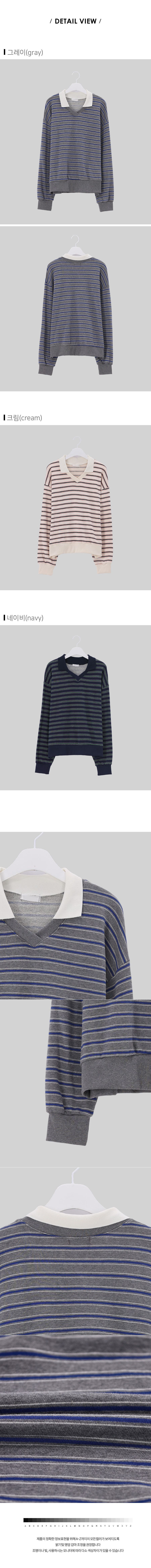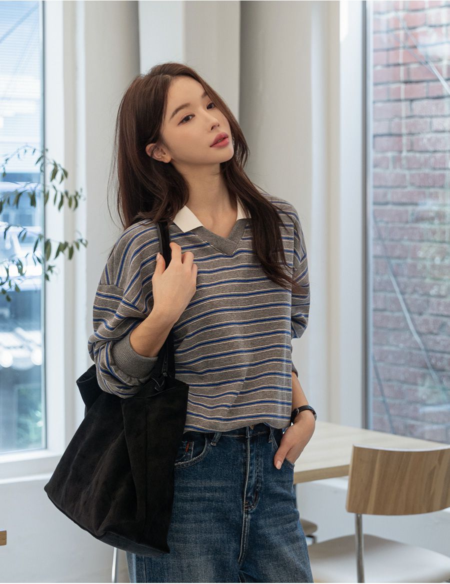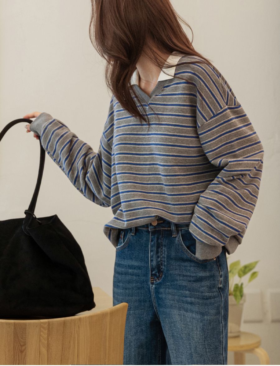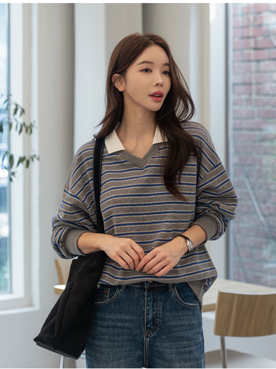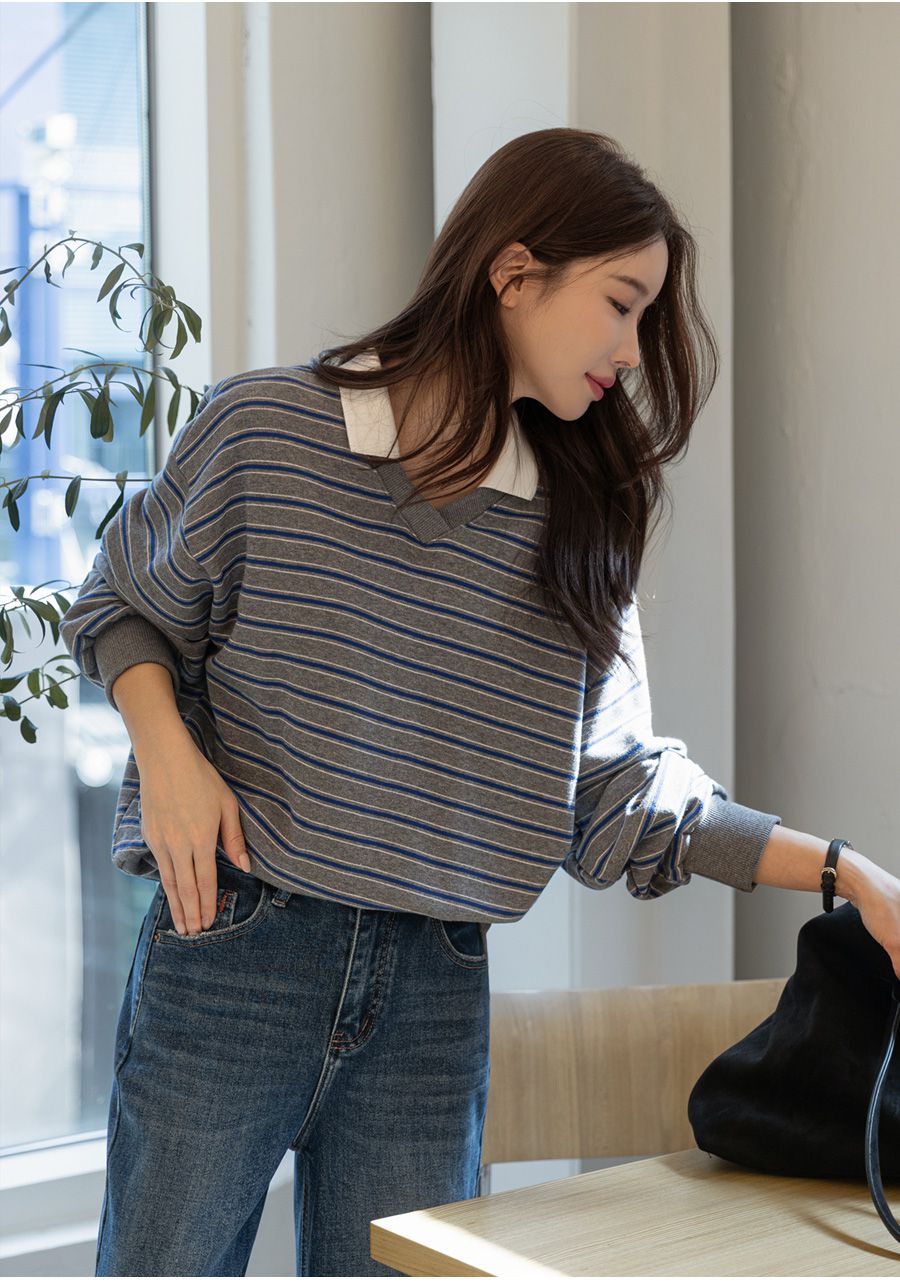 假兩件拼接/V領/拼接襯衫領/翻領/經典條紋色 - 休閒居家配色條紋上衣條紋POLO衫休閒長袖上衣灰色奶油色深藍色