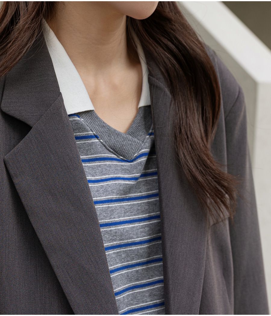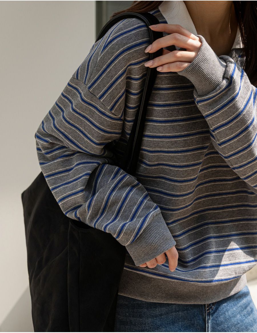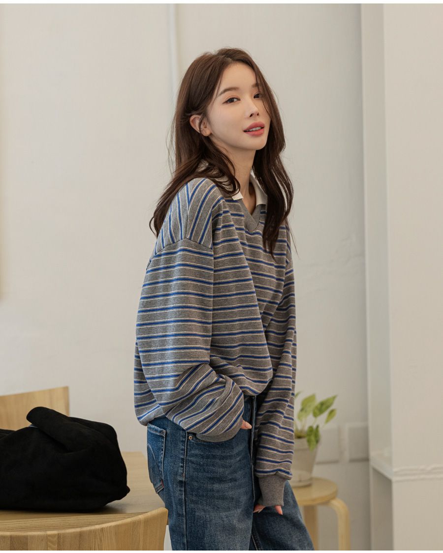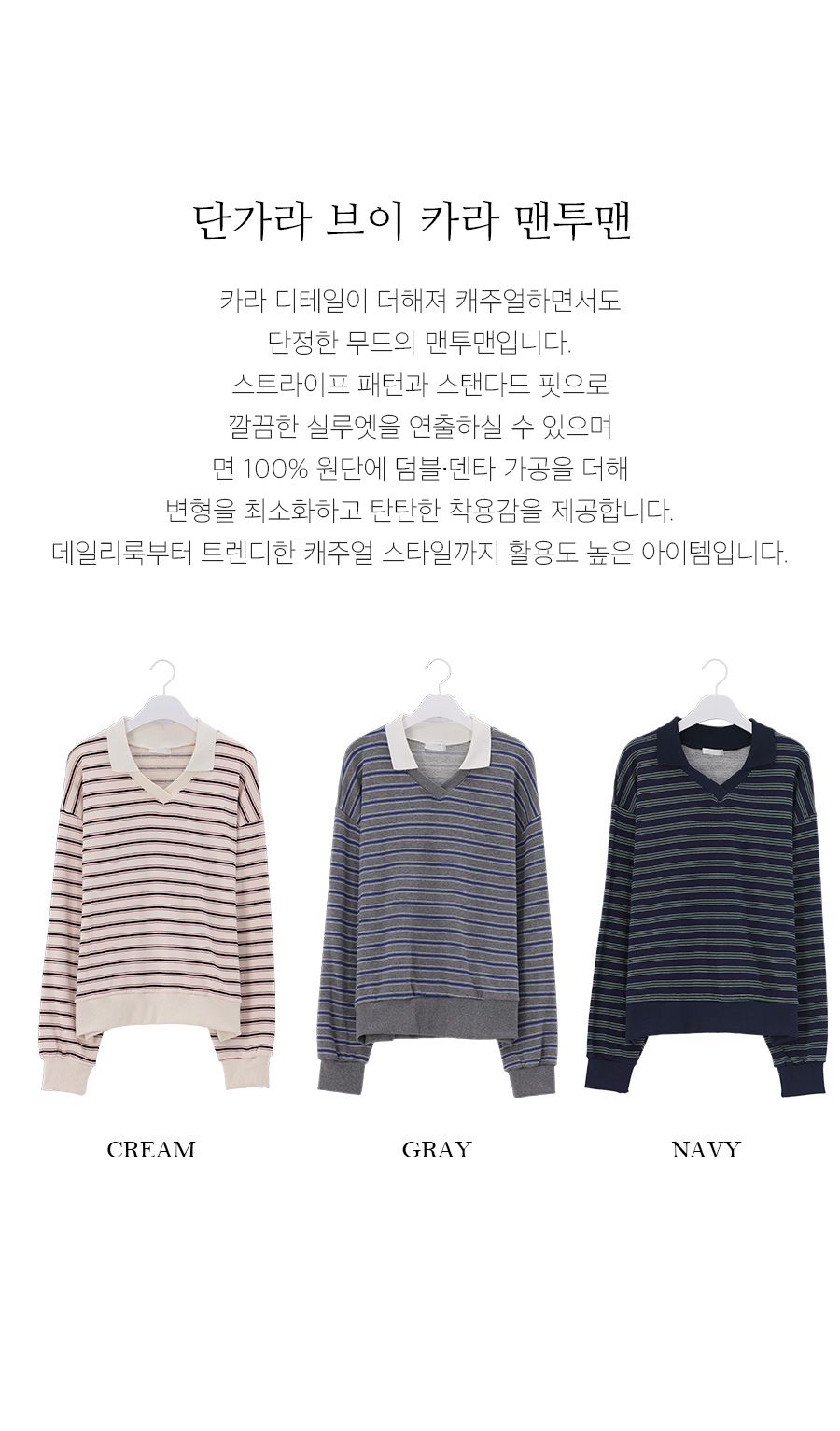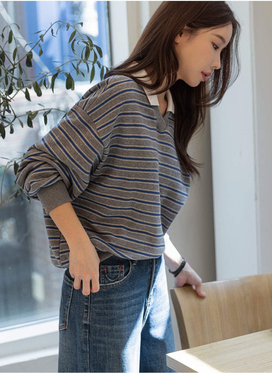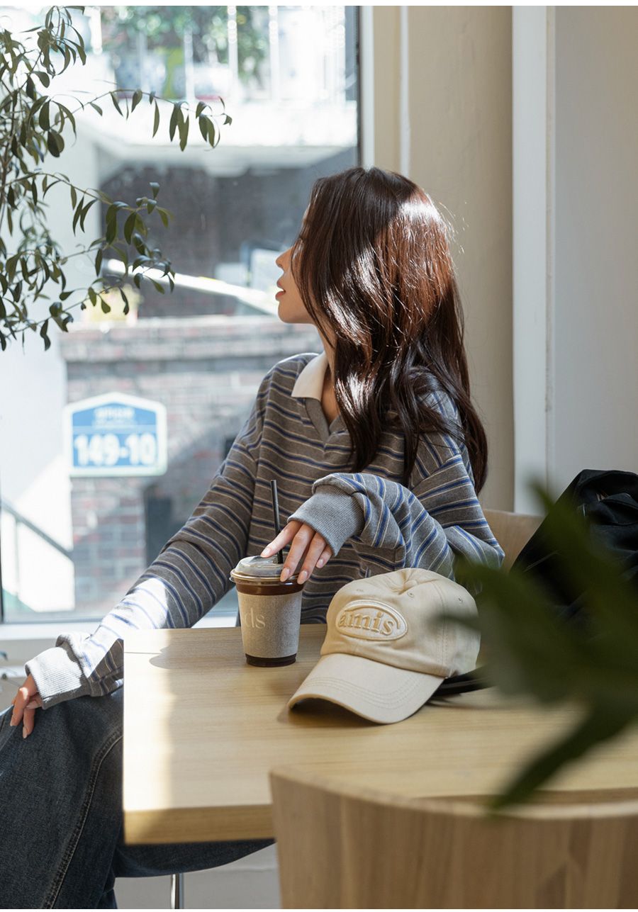 假兩件拼接/V領/拼接襯衫領/翻領/經典條紋色 - 休閒居家配色條紋上衣條紋POLO衫休閒長袖上衣灰色奶油色深藍色