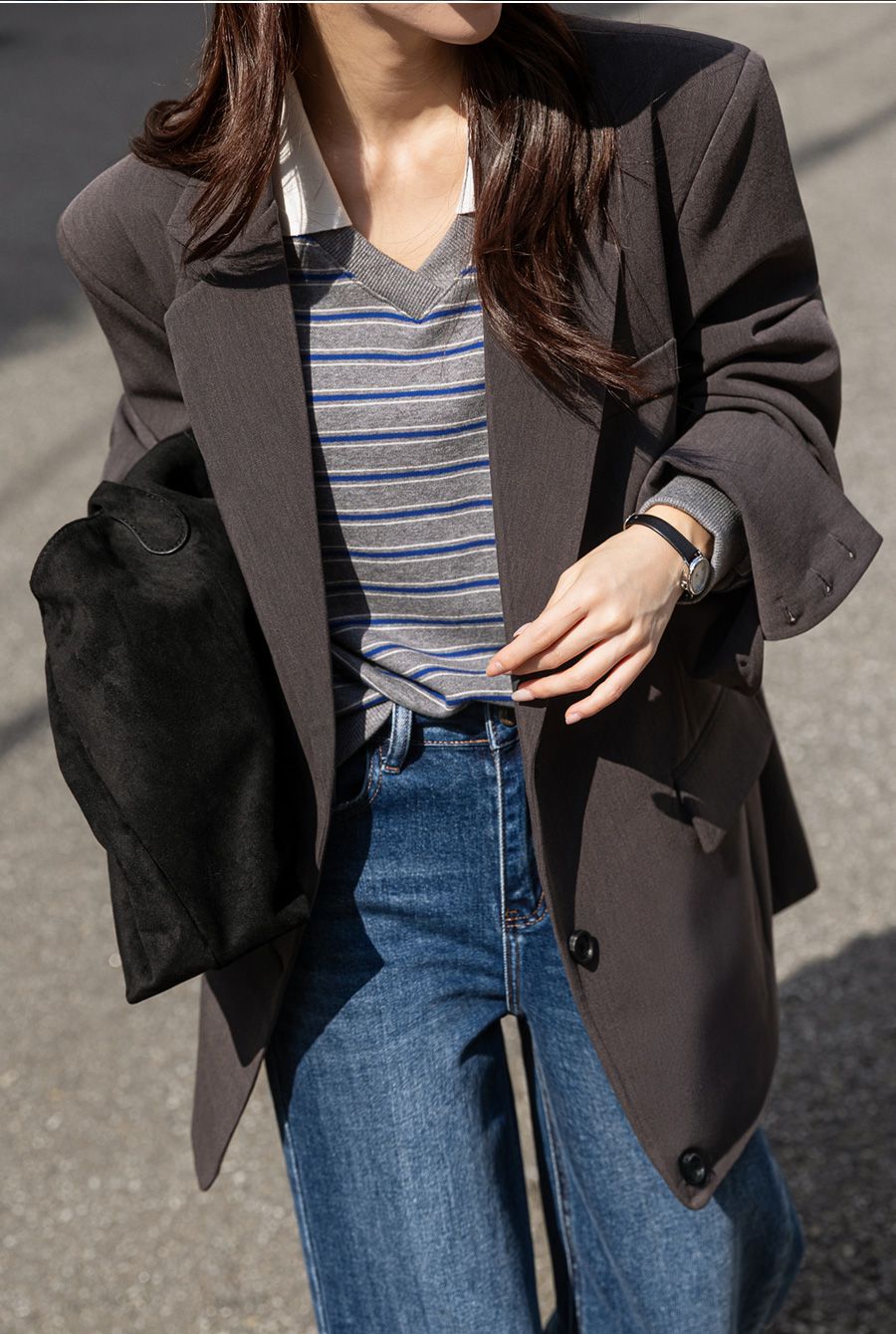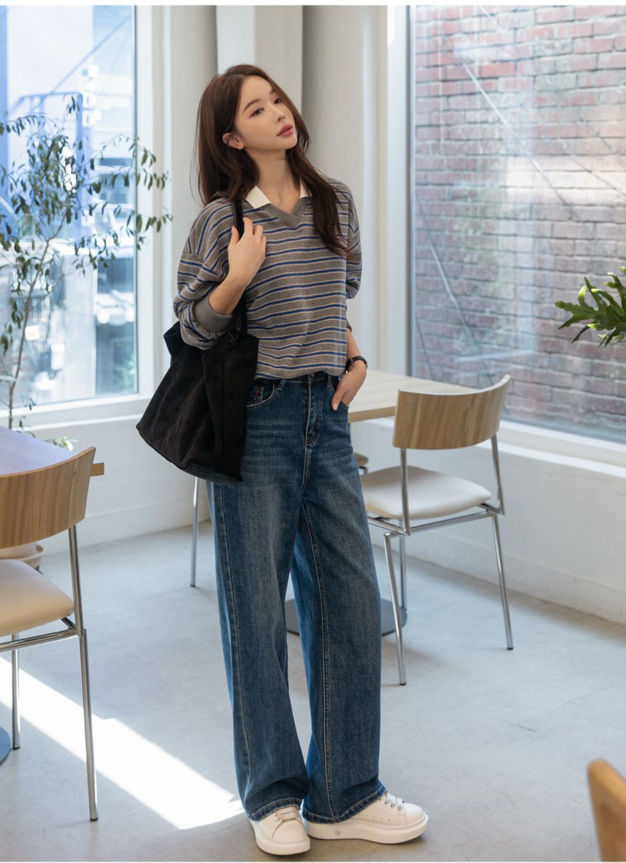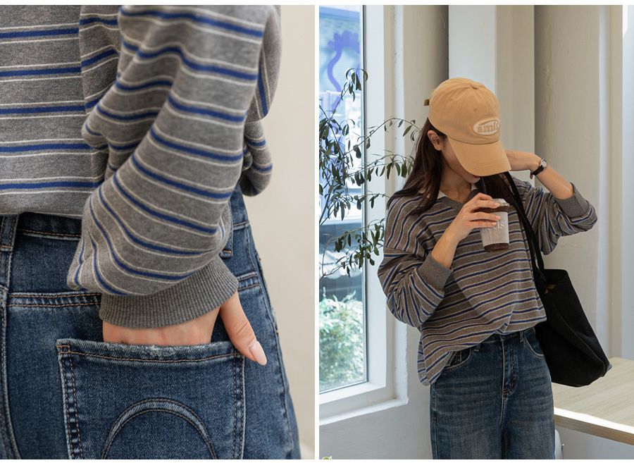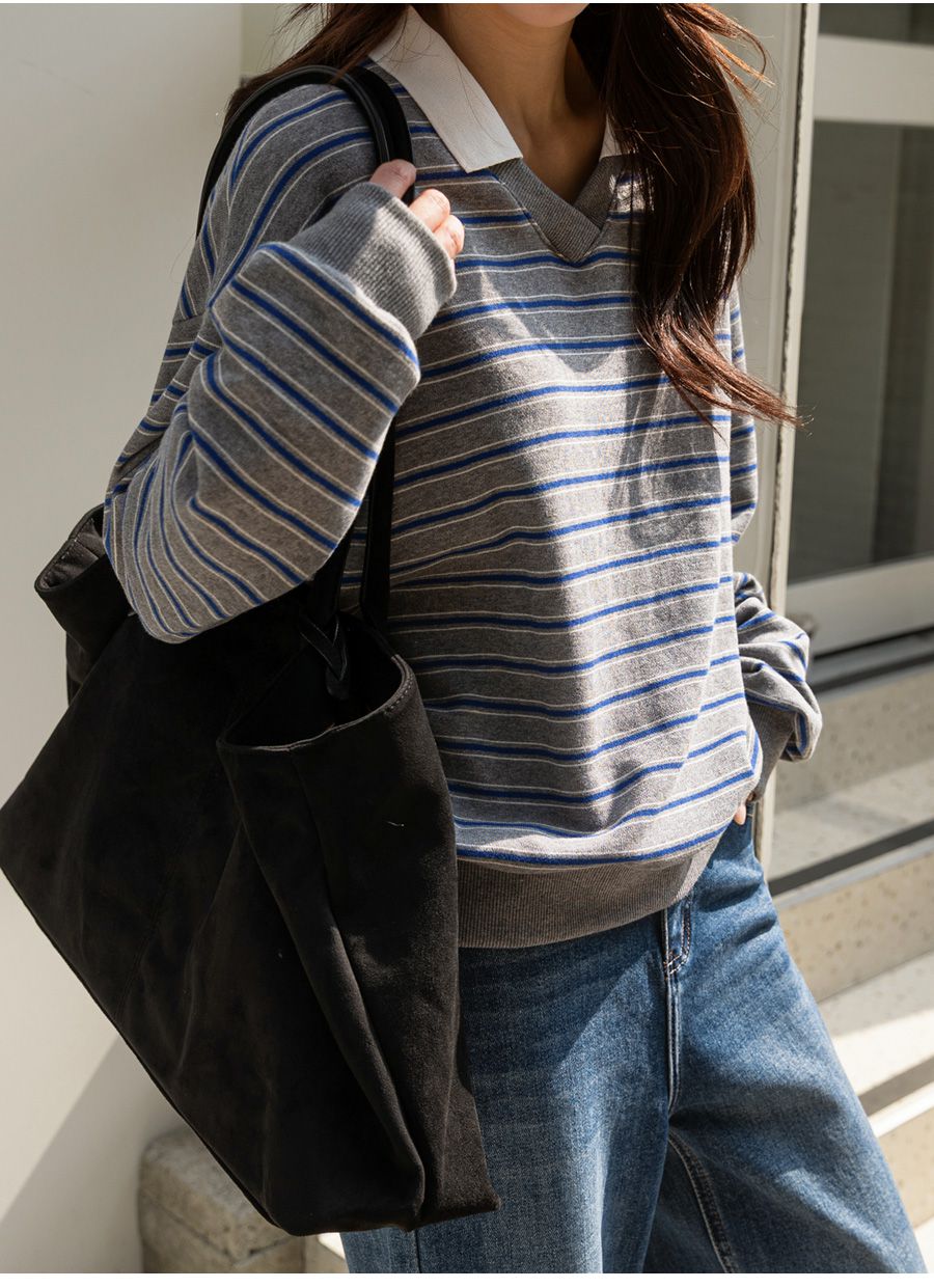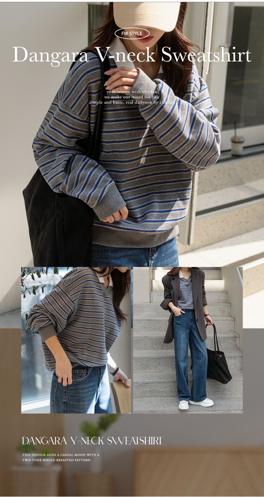 假兩件拼接/V領/拼接襯衫領/翻領/經典條紋色 - 休閒居家配色條紋上衣條紋POLO衫休閒長袖上衣灰色奶油色深藍色