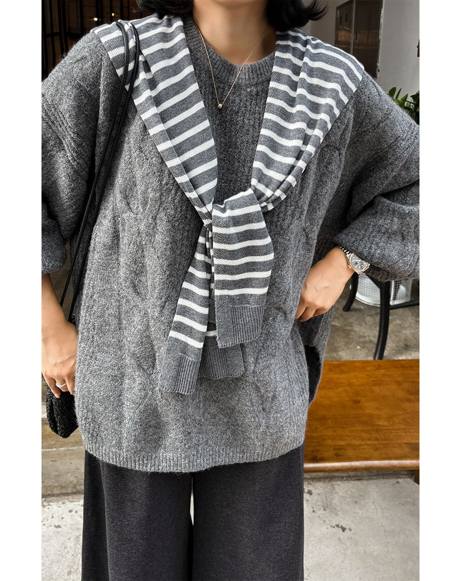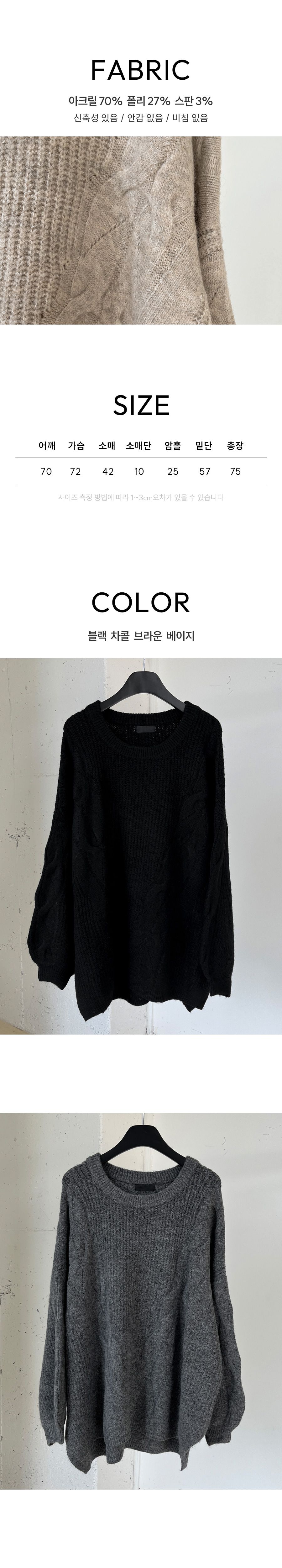 蓬鬆有厚度/圓領/麻花編織紋/落肩寬袖/泡泡袖/寬鬆長版/前短後長/側開衩 - 休閒居家簡約百搭素面蓬鬆麻花針織衫針織上衣寬鬆大尺碼上衣長版上衣長袖上衣深灰色黑色米色棕色
