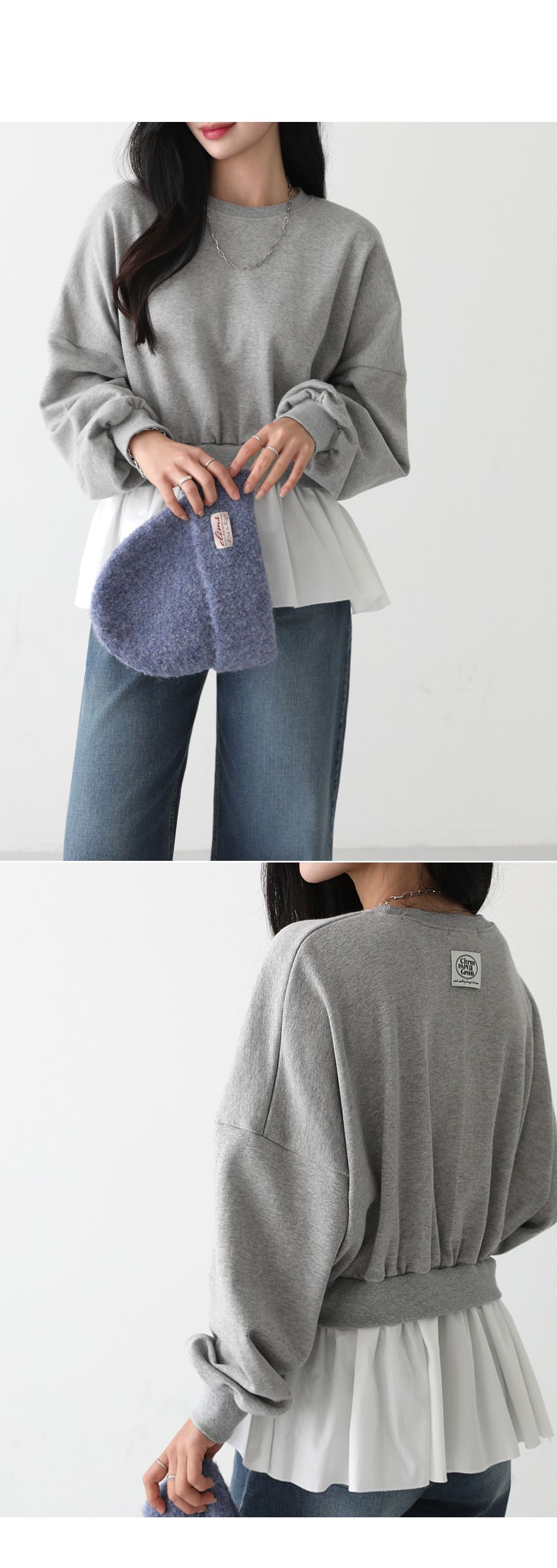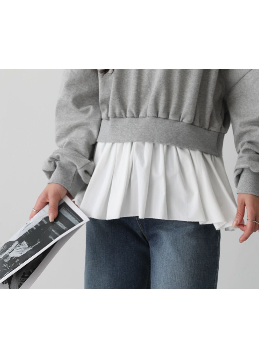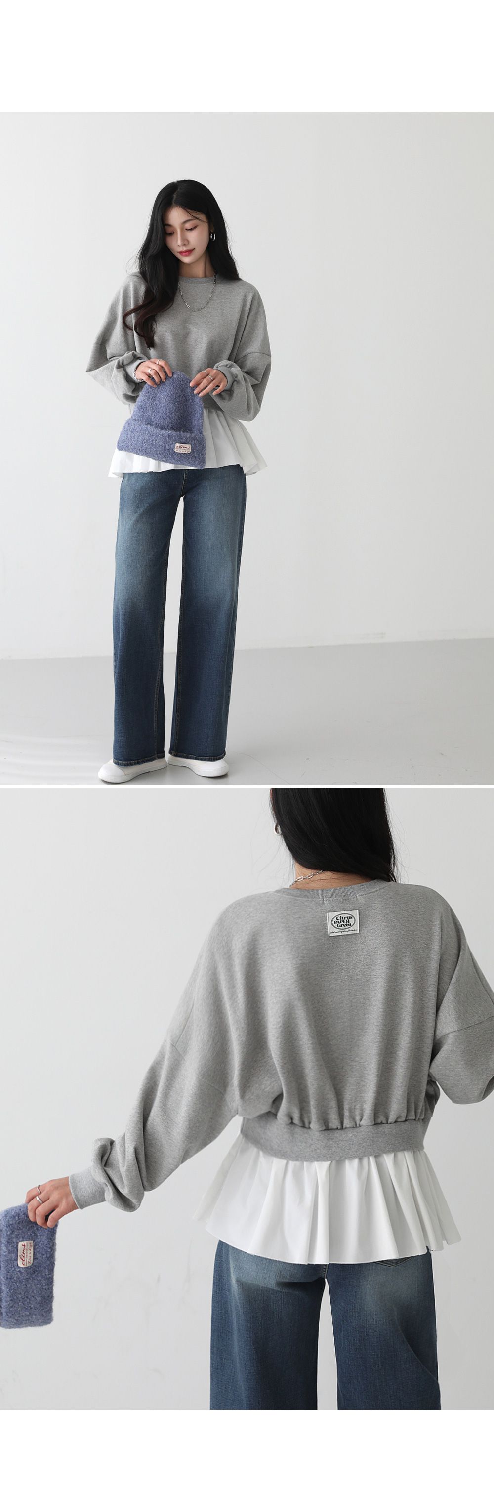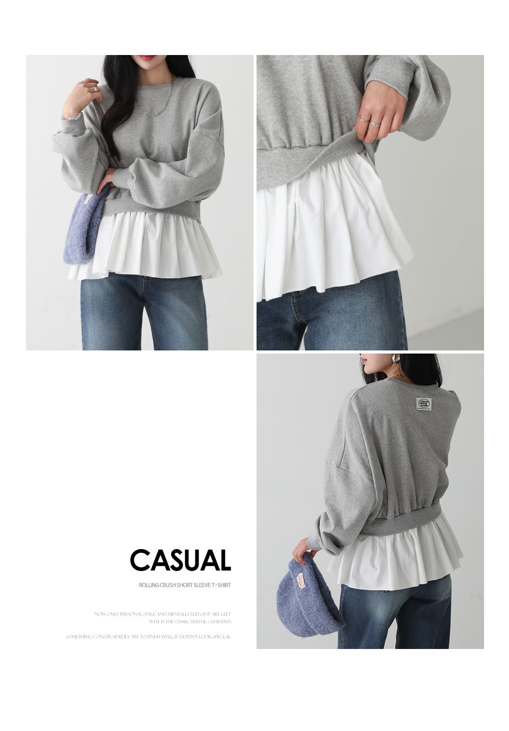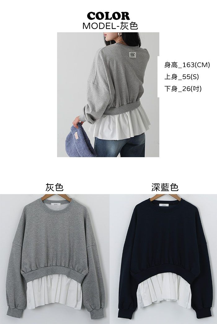 假兩件拼接/襯衫下襬/圓領/後領字母布標/英文字母/寬袖/內裏薄毛絨面料 - 休閒居家簡約百搭素面雙材質拼接上衣長袖上衣灰色深藍色