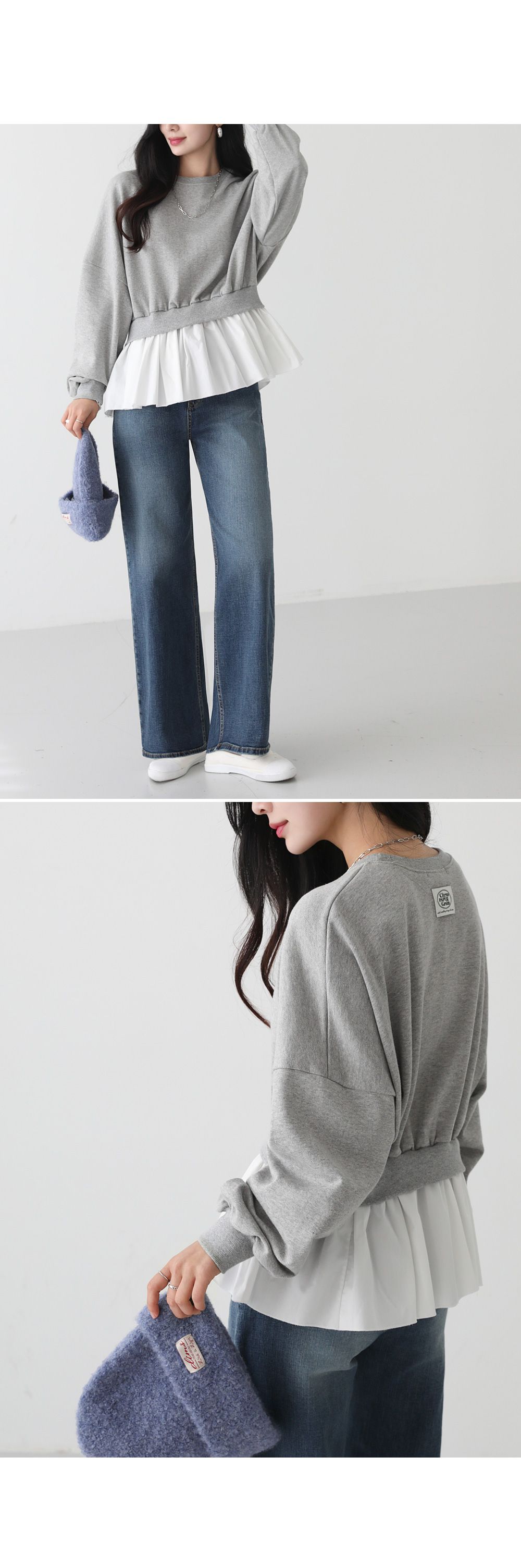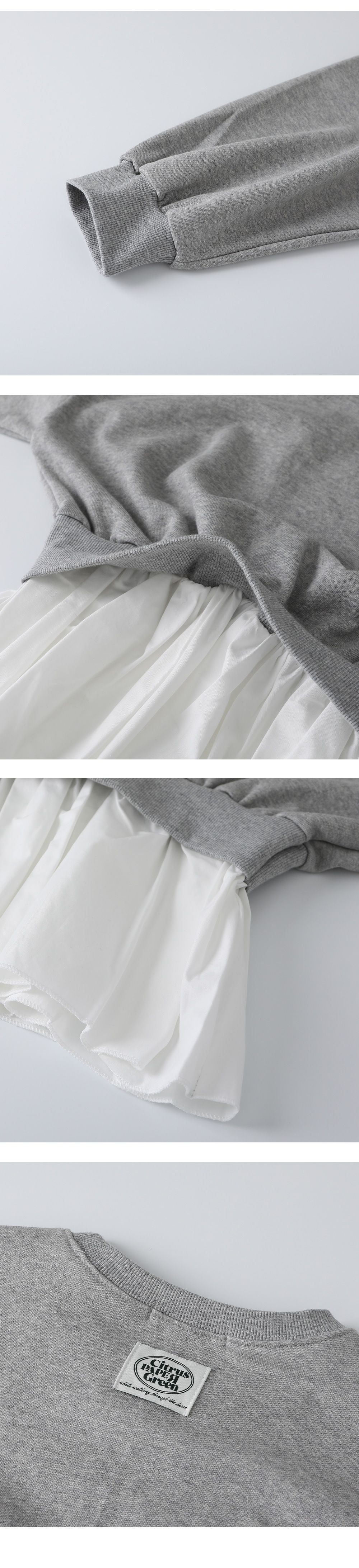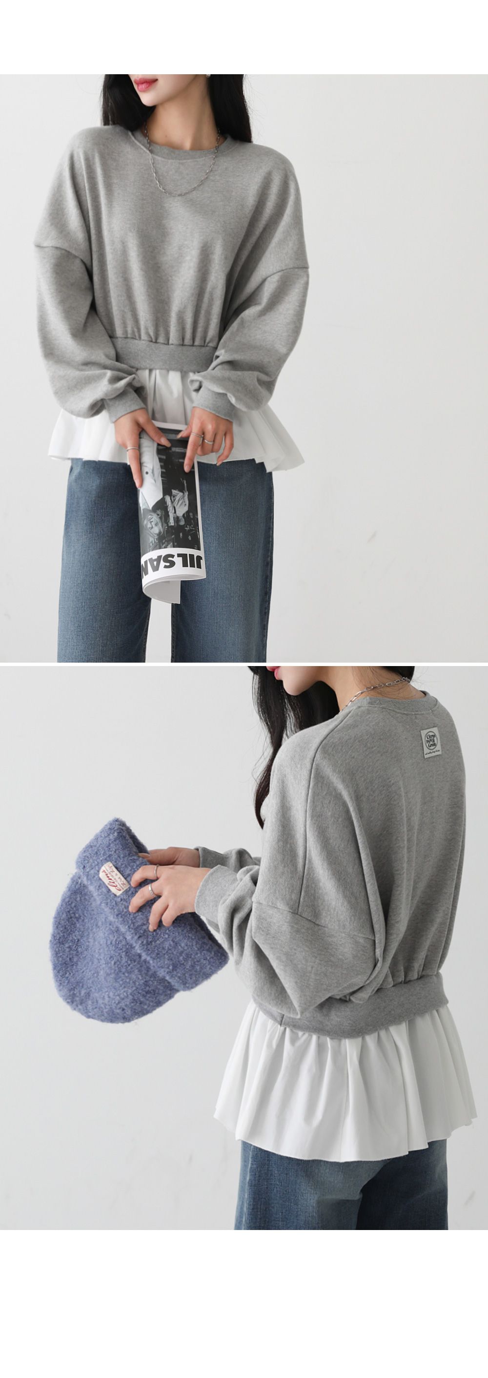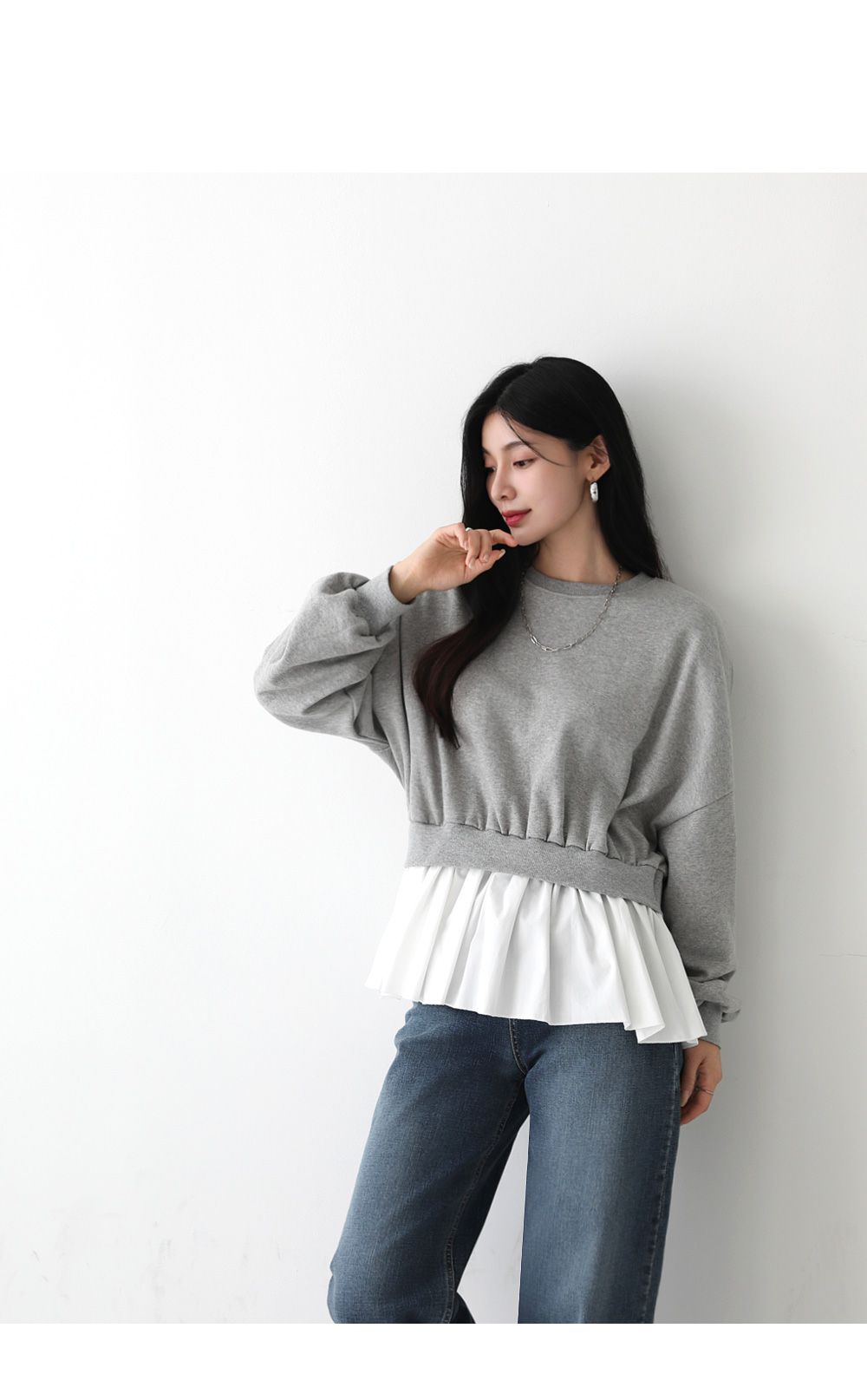 假兩件拼接/襯衫下襬/圓領/後領字母布標/英文字母/寬袖/內裏薄毛絨面料 - 休閒居家簡約百搭素面雙材質拼接上衣長袖上衣灰色深藍色