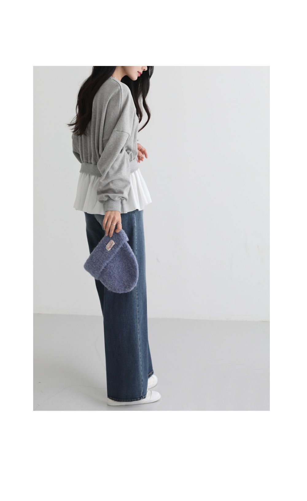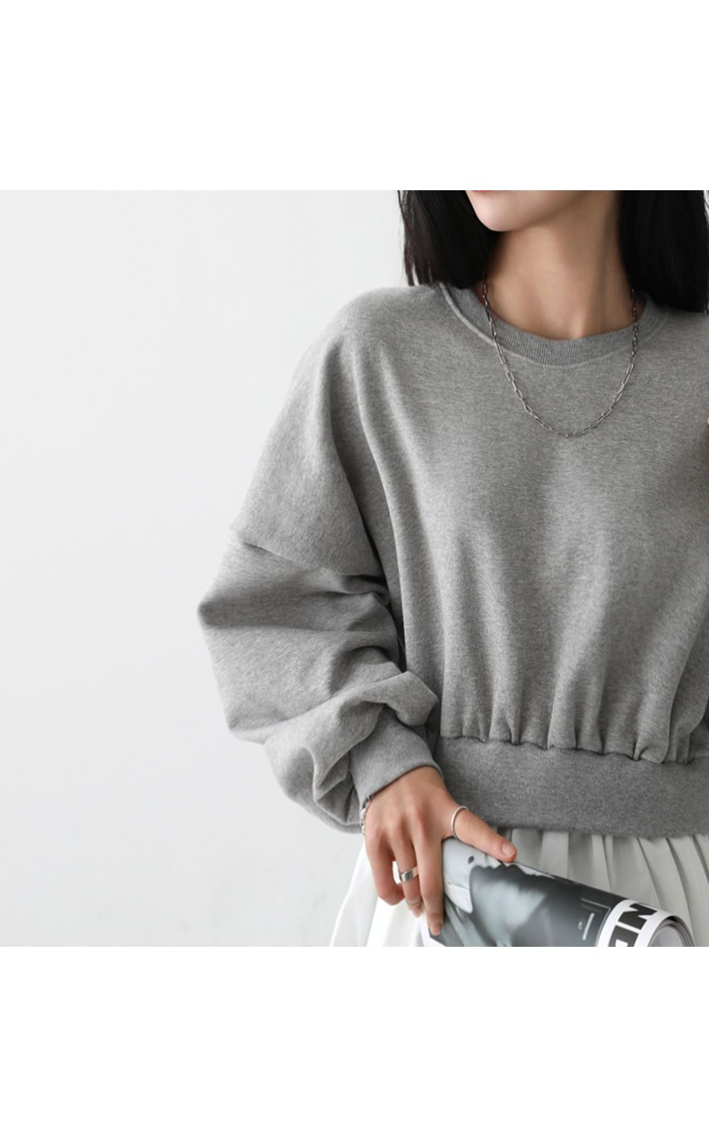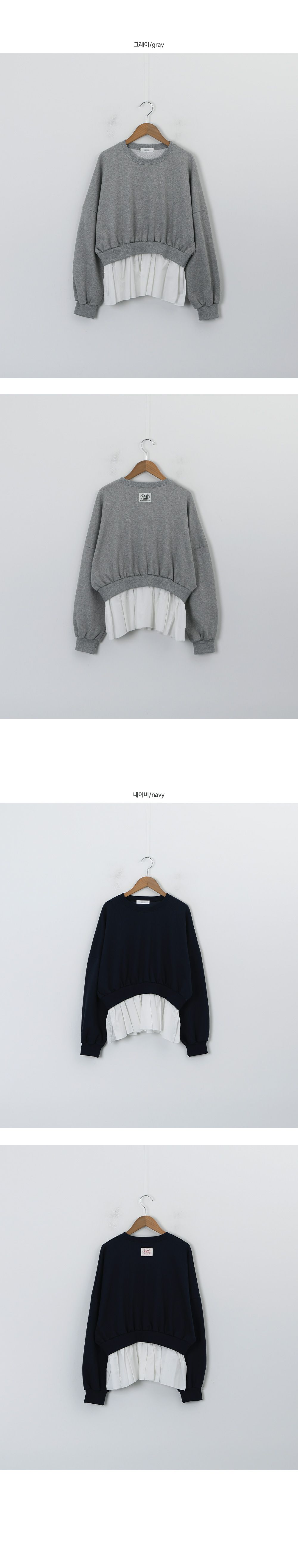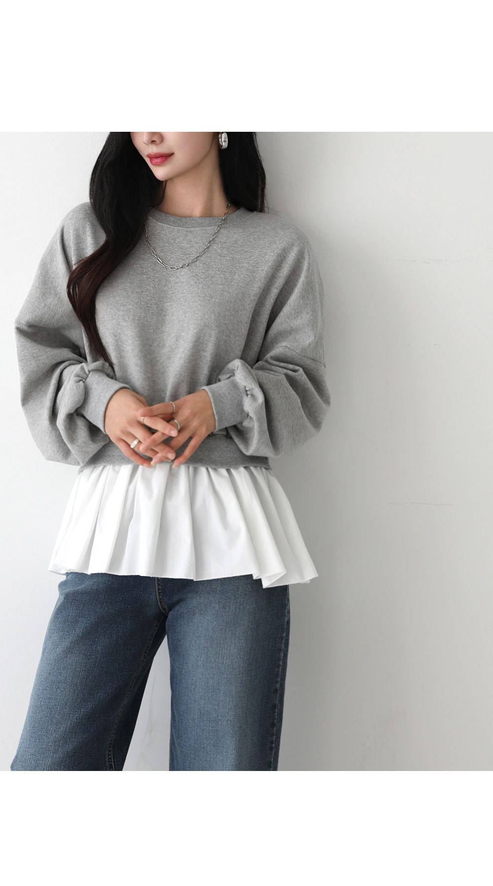 假兩件拼接/襯衫下襬/圓領/後領字母布標/英文字母/寬袖/內裏薄毛絨面料 - 休閒居家簡約百搭素面雙材質拼接上衣長袖上衣灰色深藍色