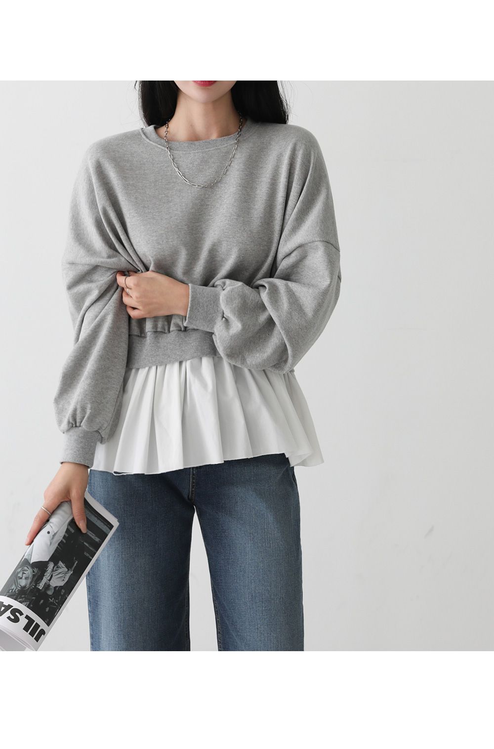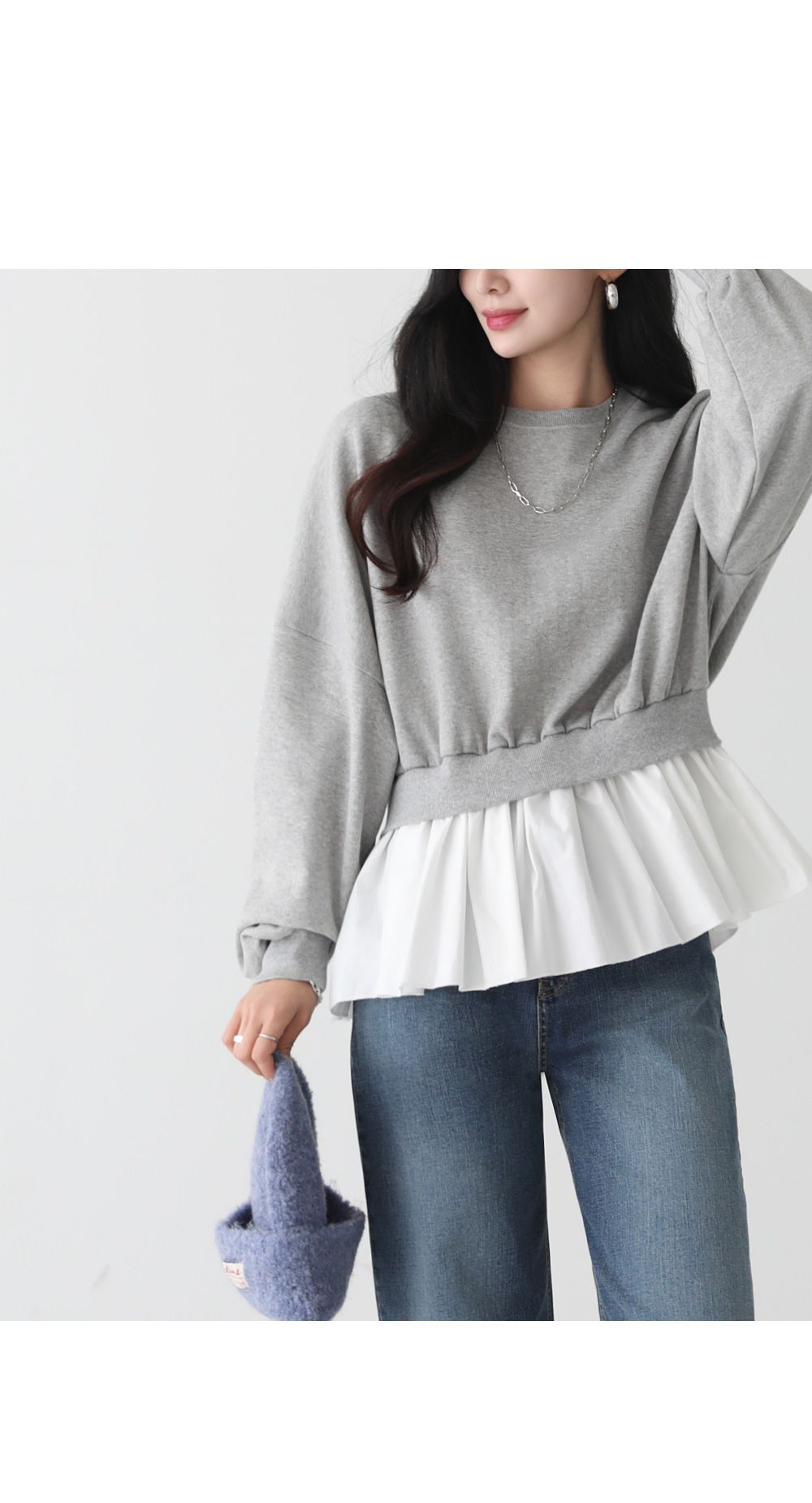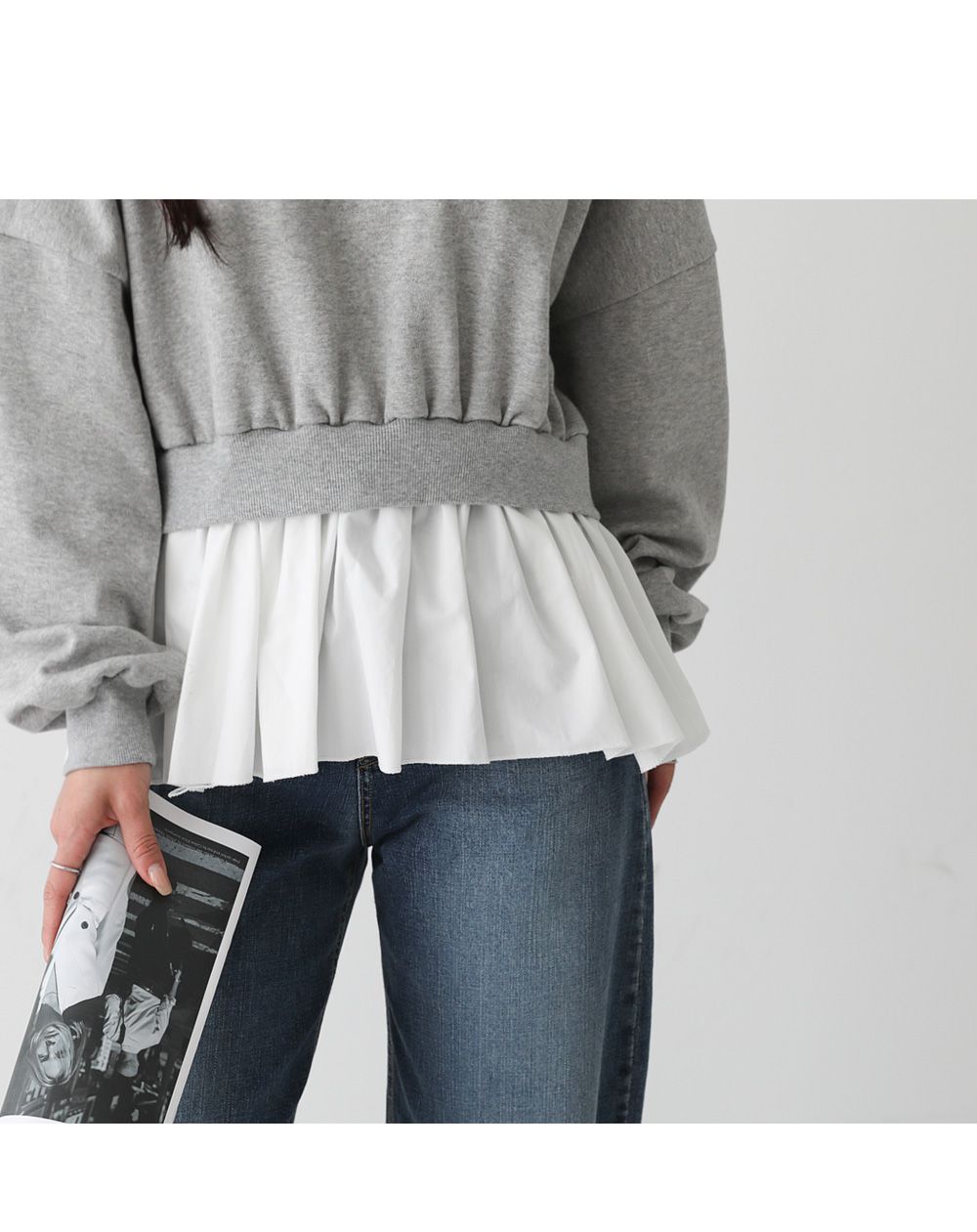 【C55675】韓國PPI 雙材質拼接上衣-後領字母布標襯衫下襬圓領長袖