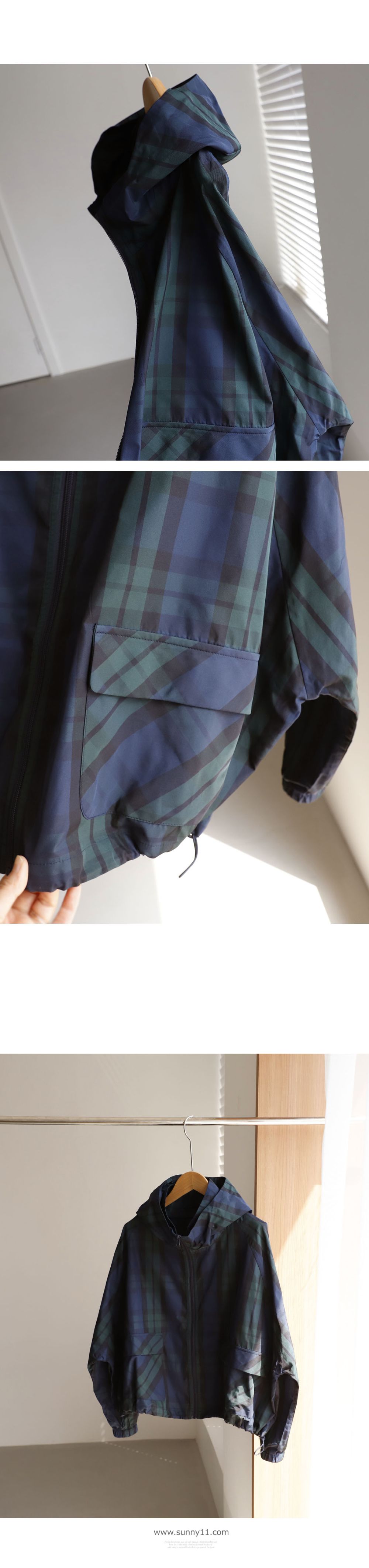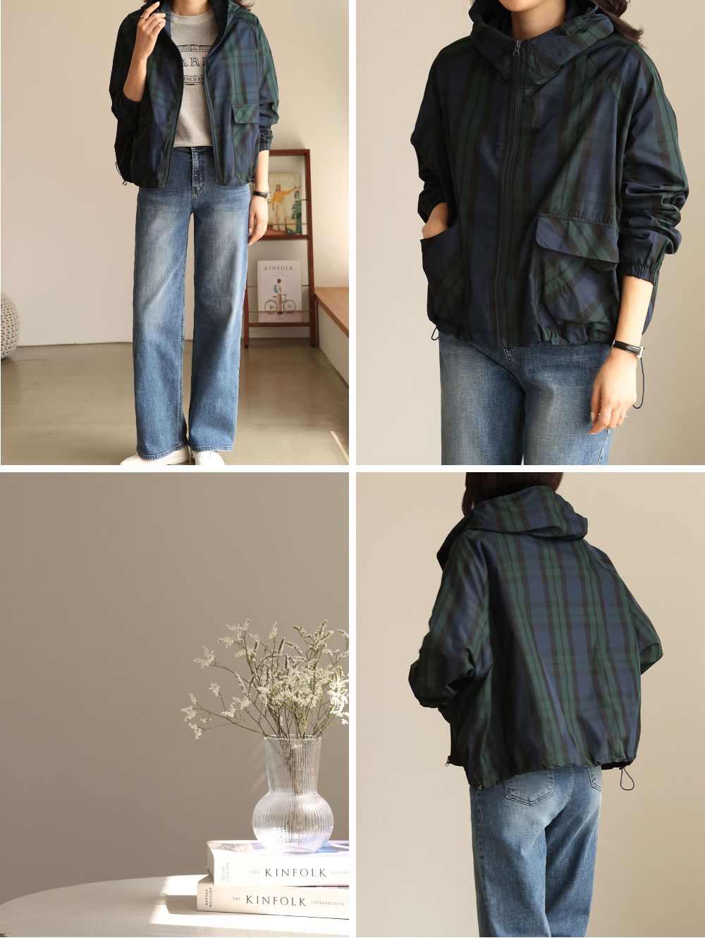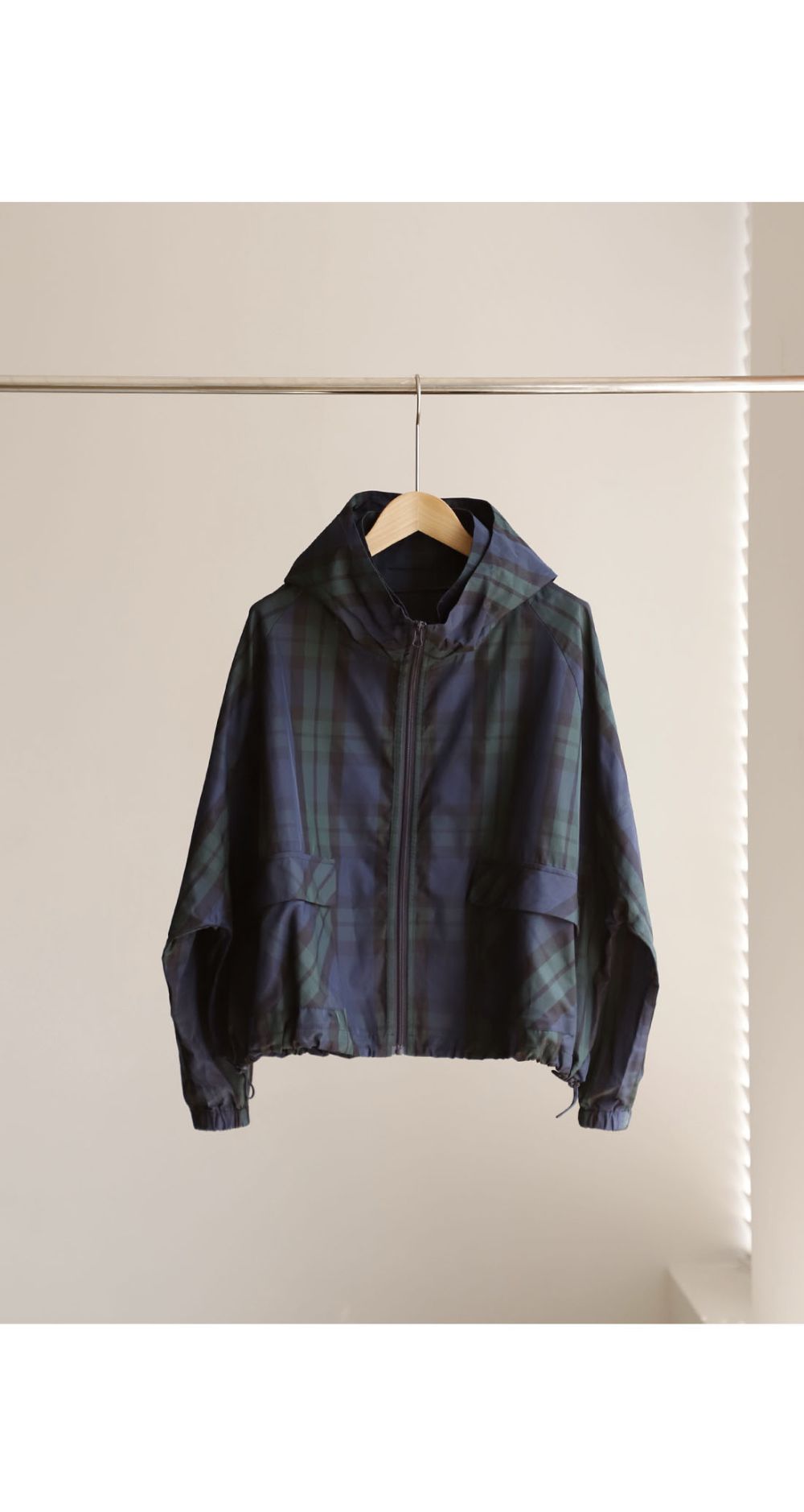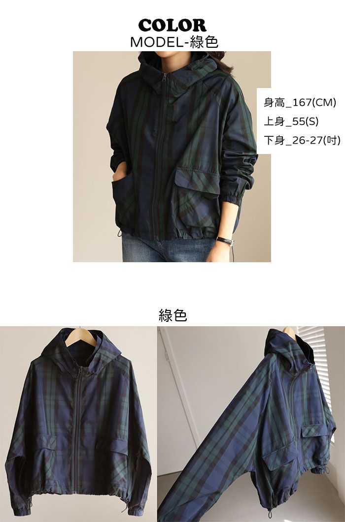 經典格紋/高領/立領/連帽/雙口袋/下襬抽繩收腰/有內裏/拉鍊外套 - 休閒渡假防風格紋外套立領外套連帽外套長袖夾克長袖外套綠色