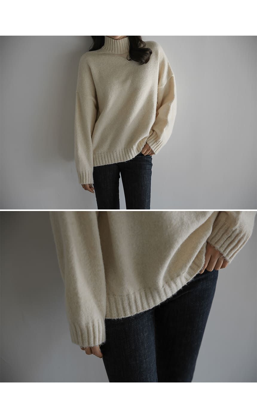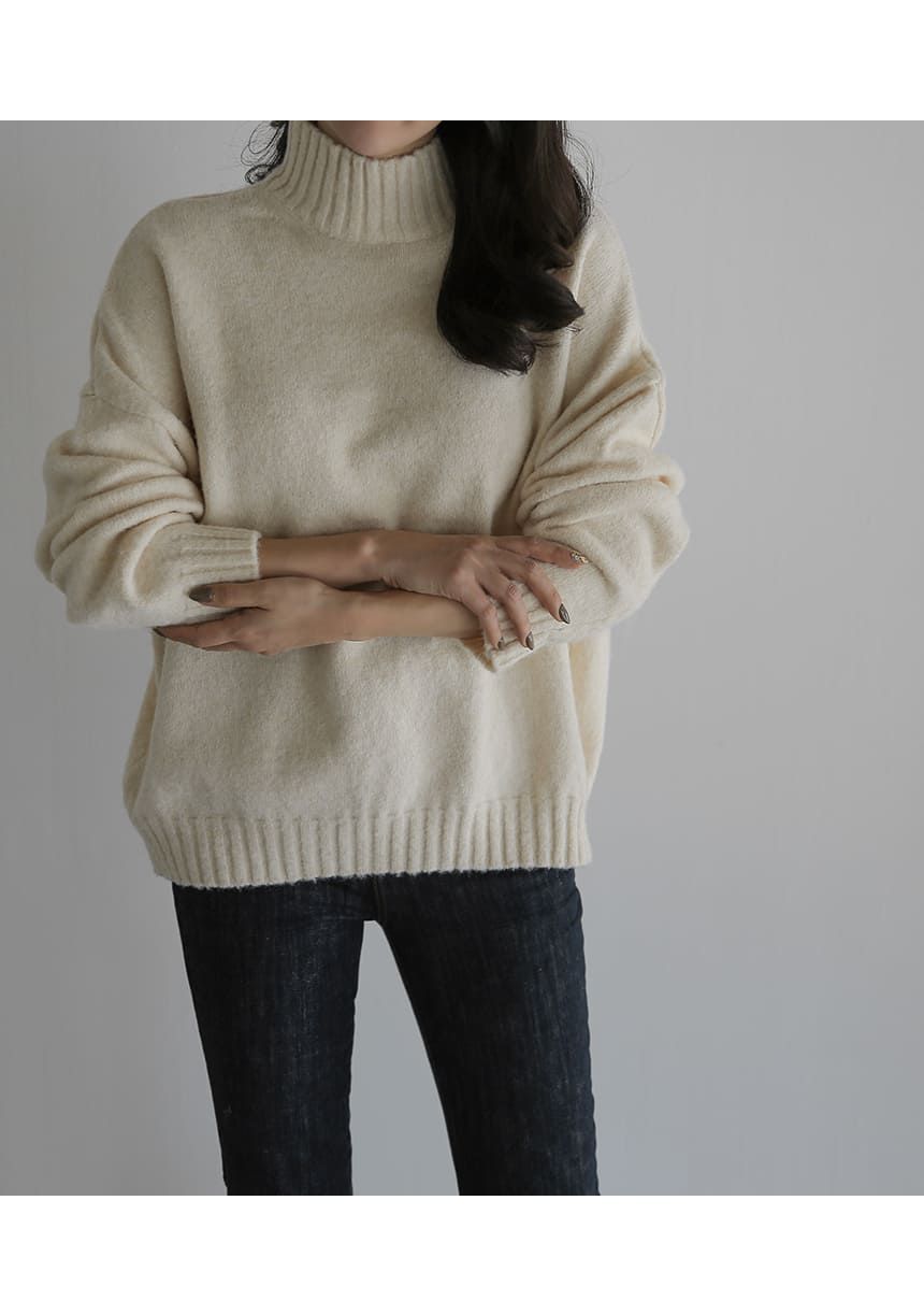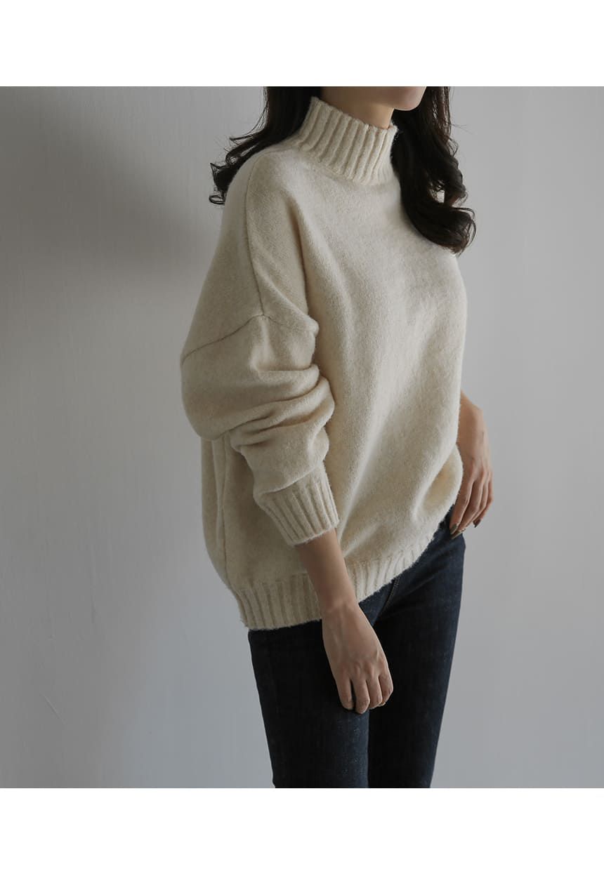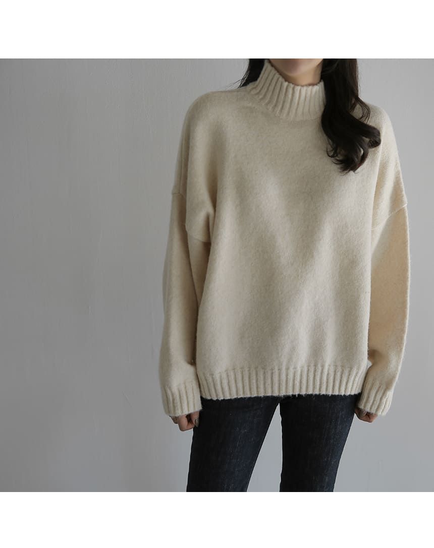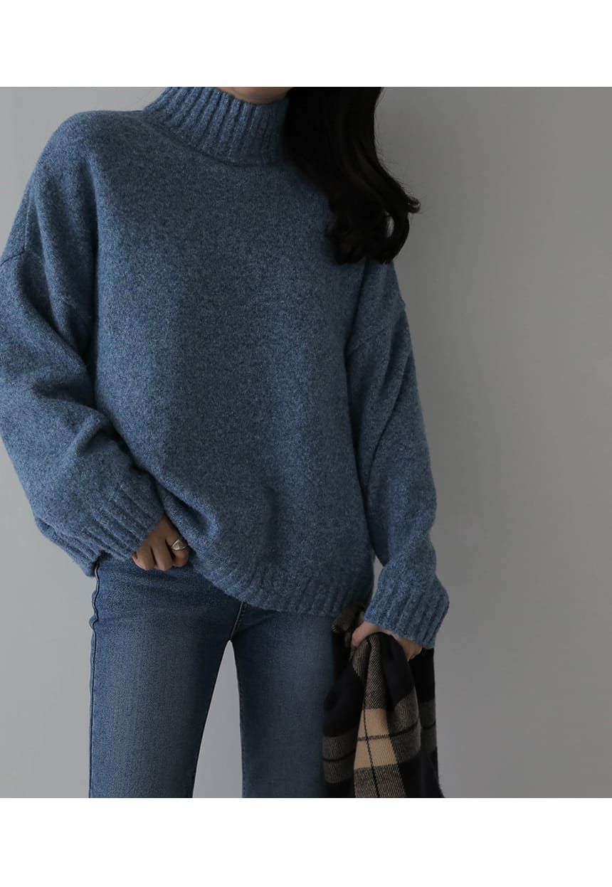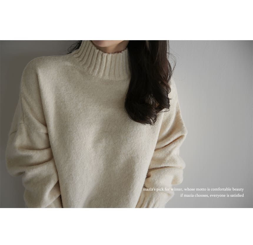 立領/高領/寬鬆版型/落肩長袖/蓬鬆保暖/混羊毛 - 休閒居家簡約百搭素面蓬鬆高領針織衫針織上衣長袖上衣羊毛針織衫寬鬆大尺碼上衣