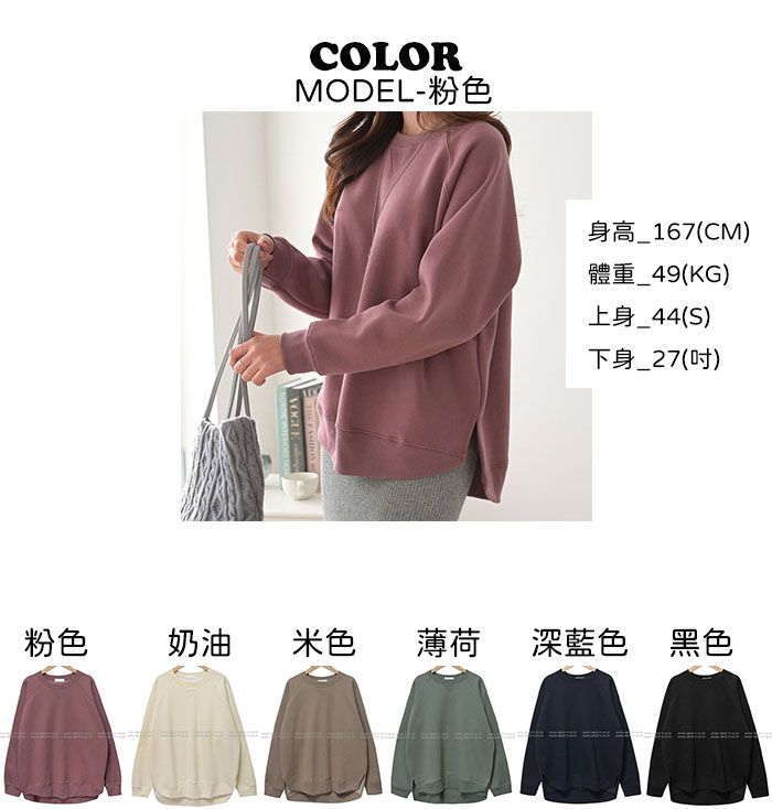 保暖內刷毛/好氣色/前短後長/弧形下襬/側開衩/前短後長/圓領/連肩袖/寬鬆長版 - 休閒居家簡約百搭素面內刷毛大學T長袖上衣寬鬆大尺碼上衣長版上衣粉色奶油色米色薄荷色深藍色黑色