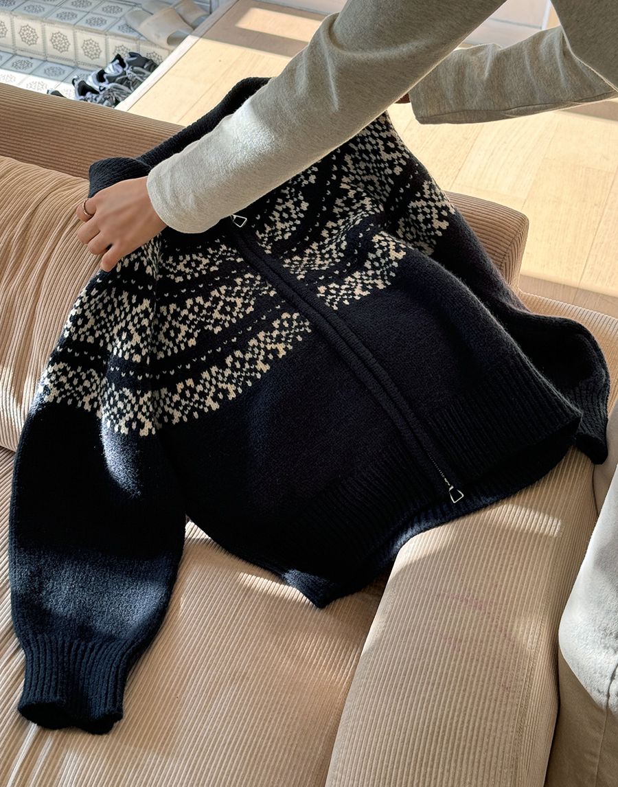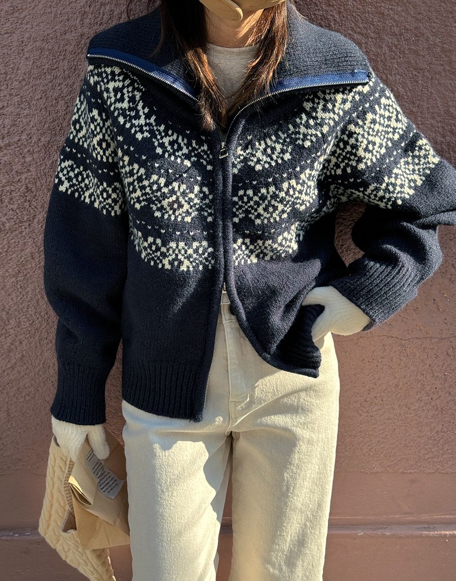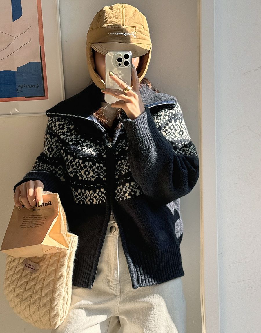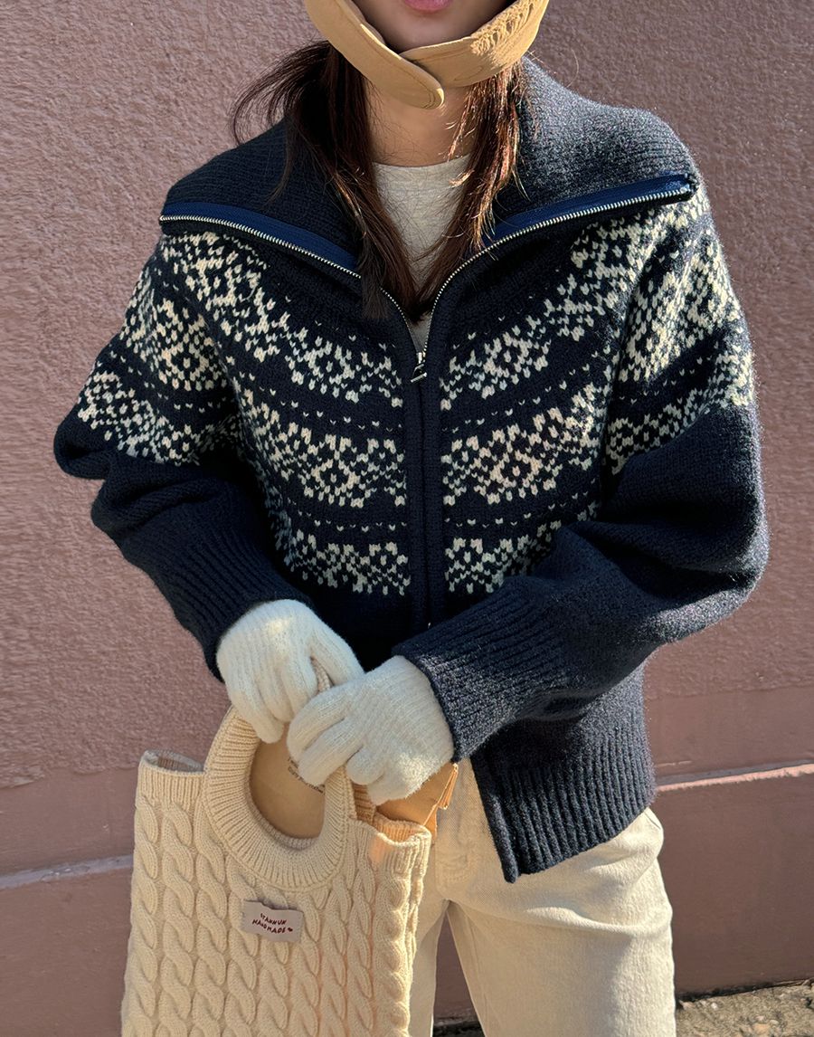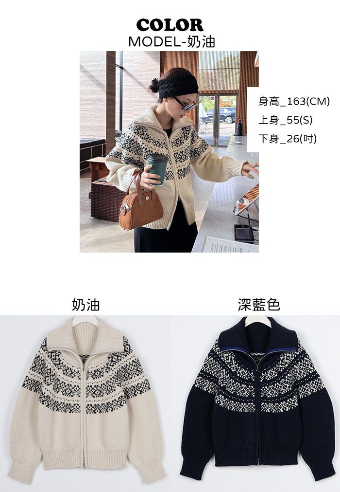 【C55682】韓國MBL 雪花紋針織外套-圖騰印花高領厚磅長袖拉鍊外套