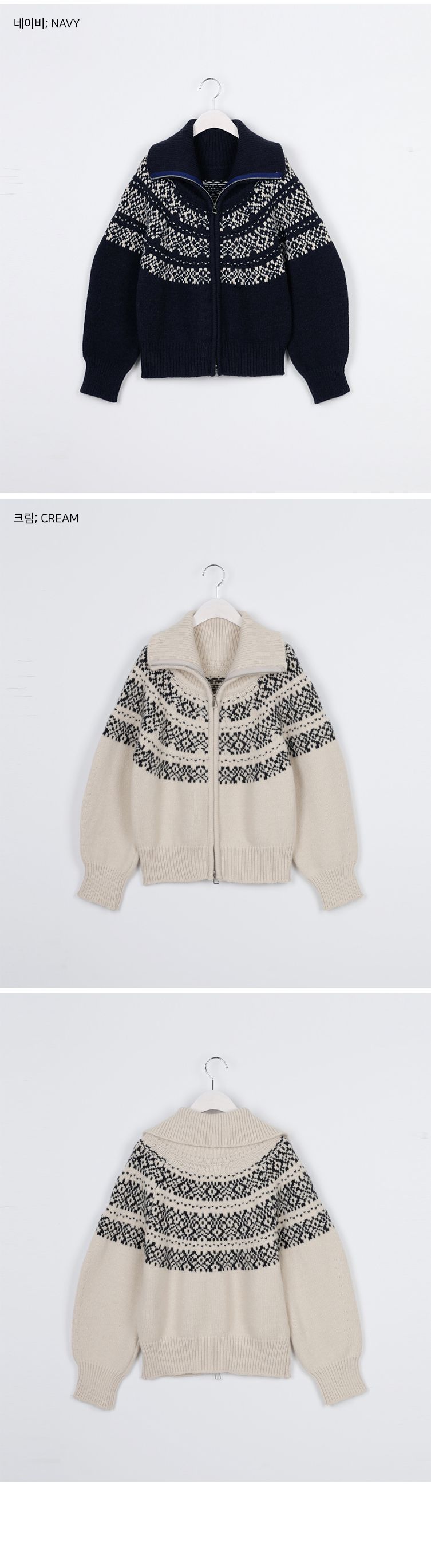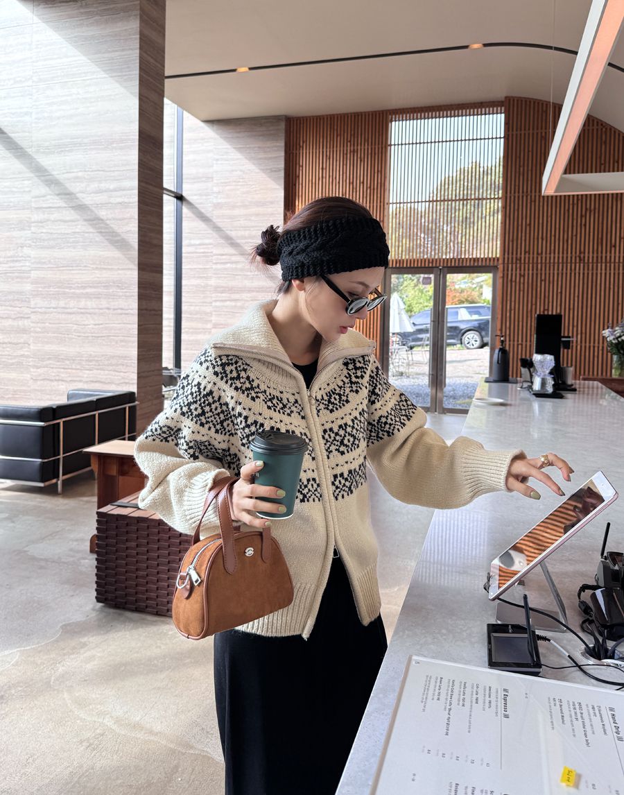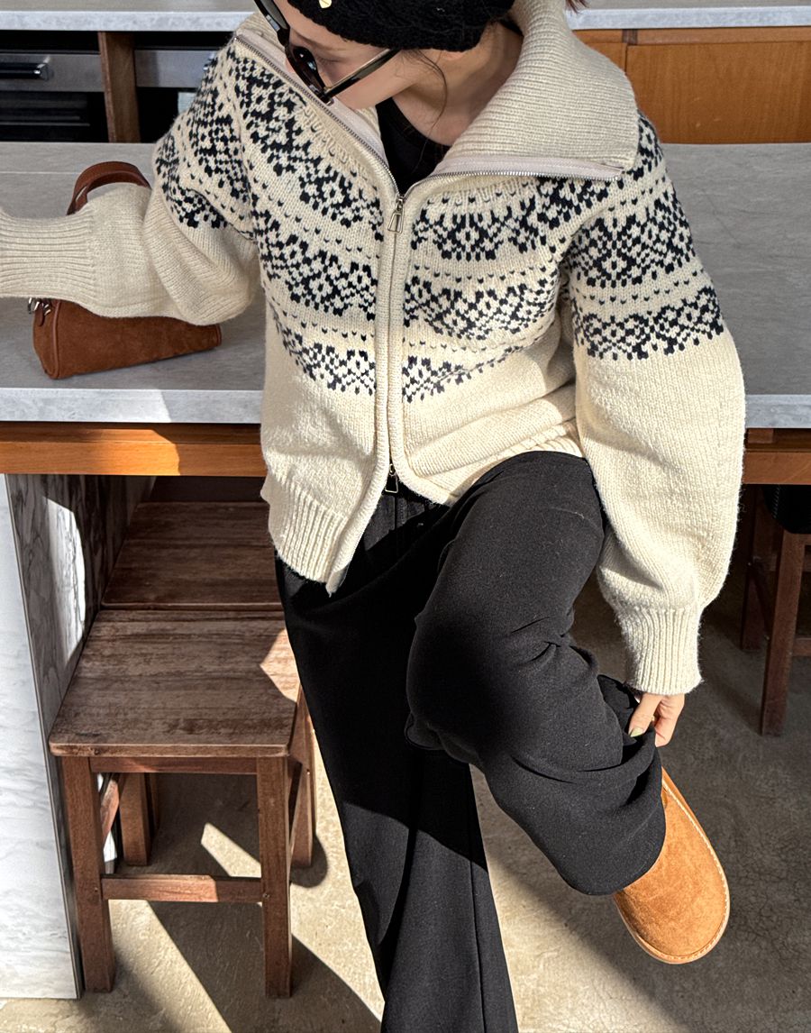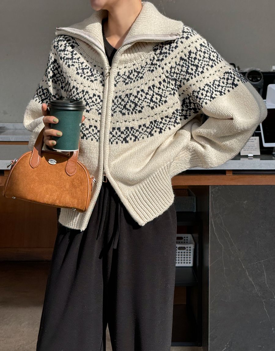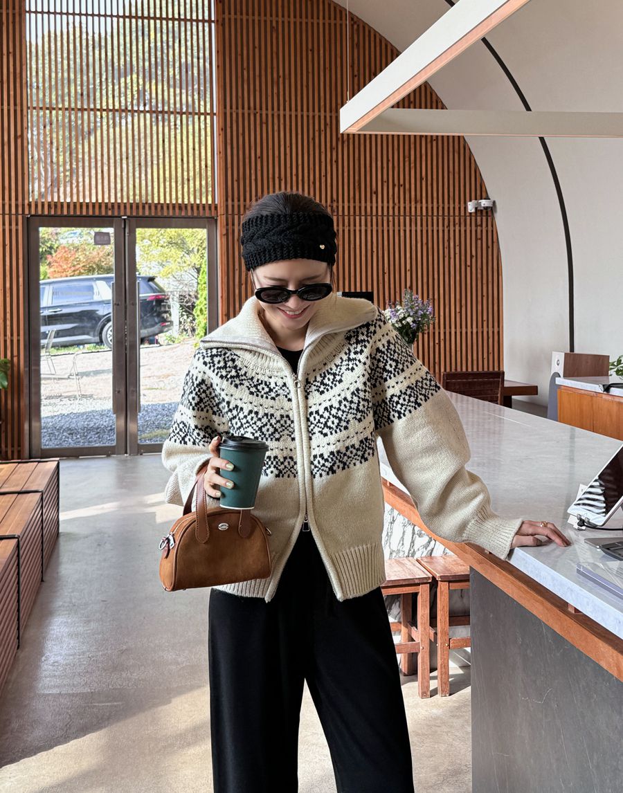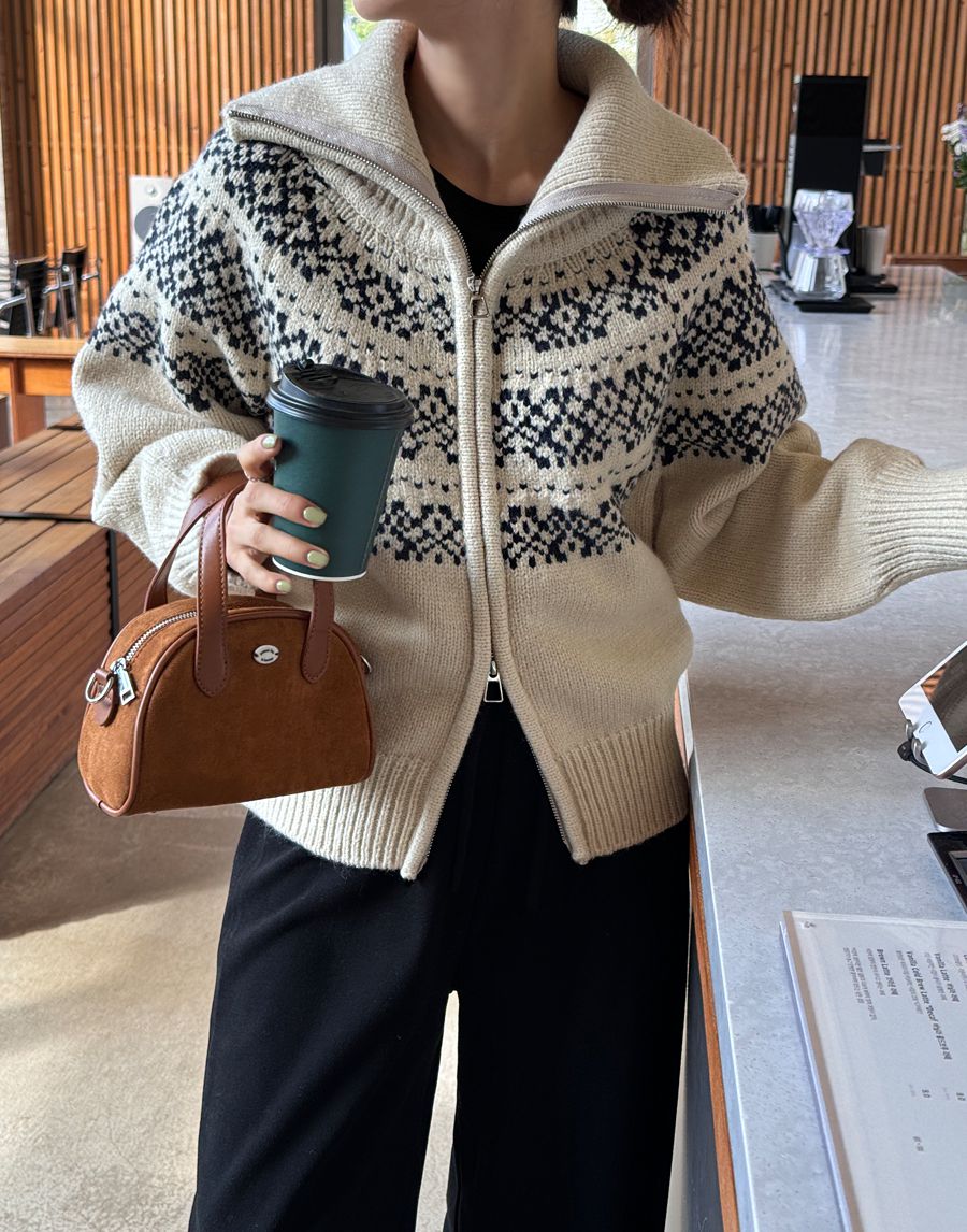 【C55682】韓國MBL 雪花紋針織外套-圖騰印花高領厚磅長袖拉鍊外套