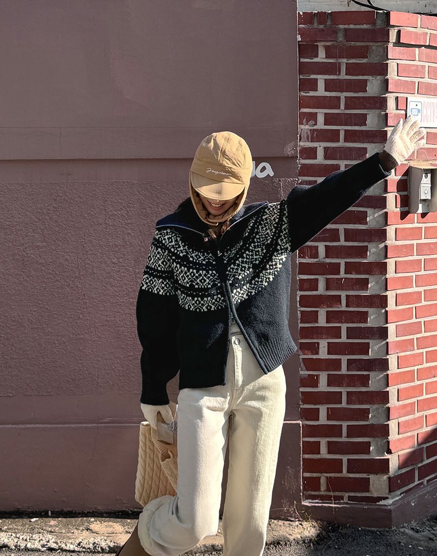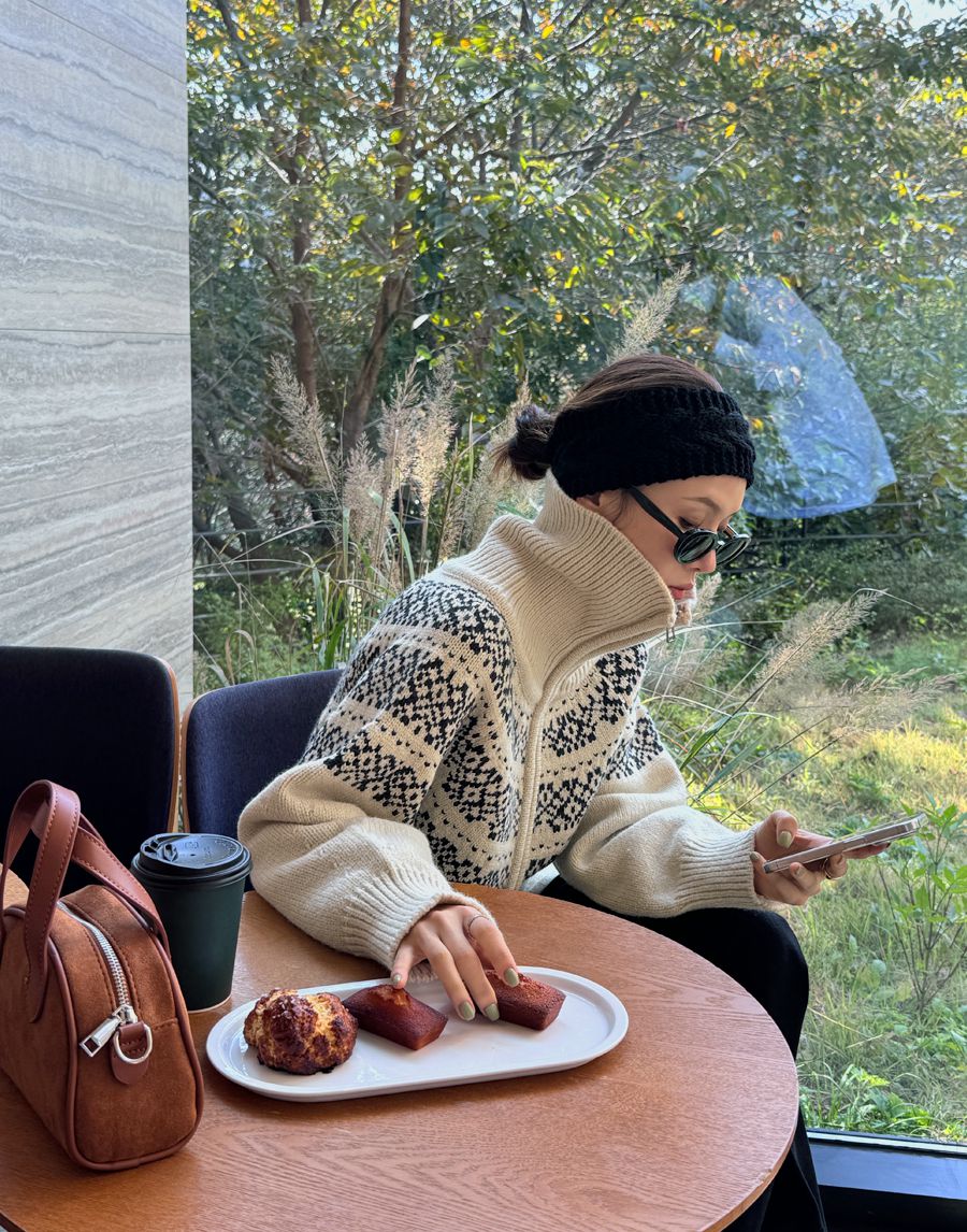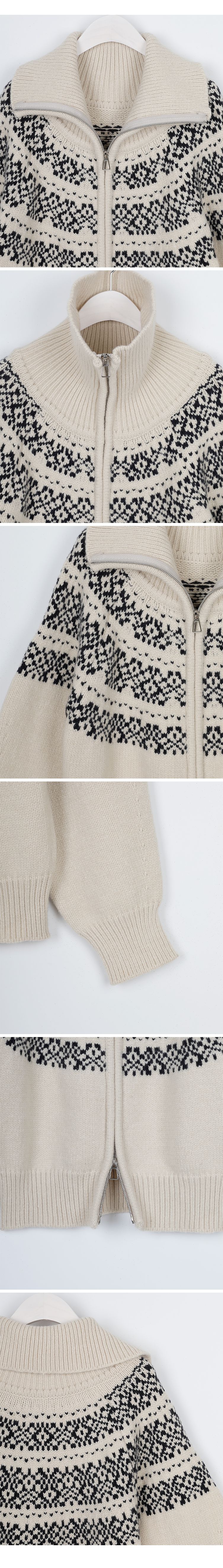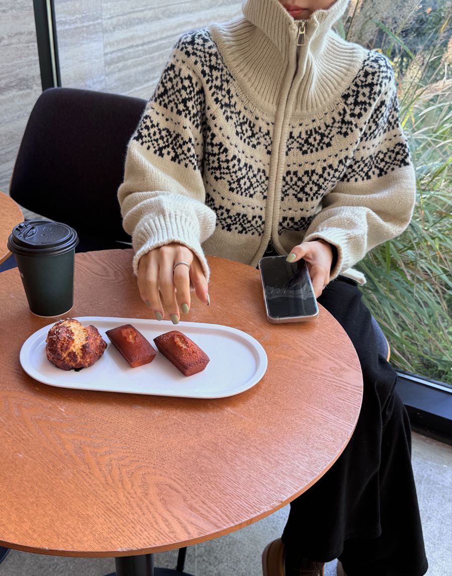 【C55682】韓國MBL 雪花紋針織外套-圖騰印花高領厚磅長袖拉鍊外套