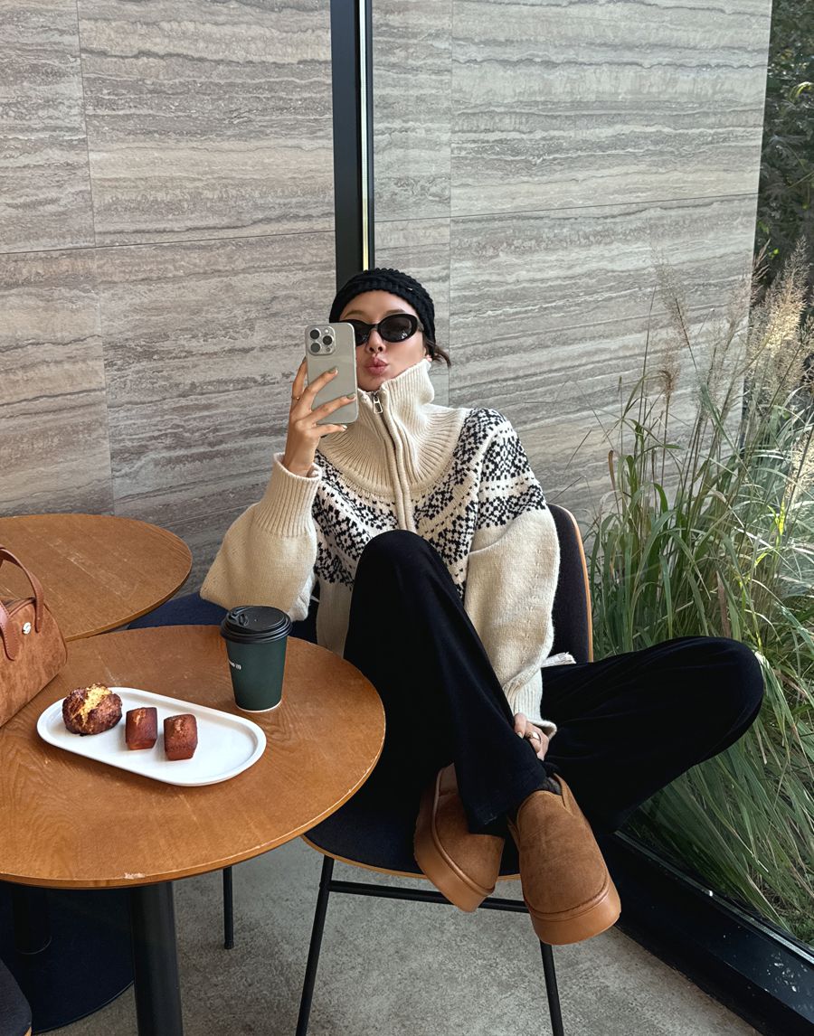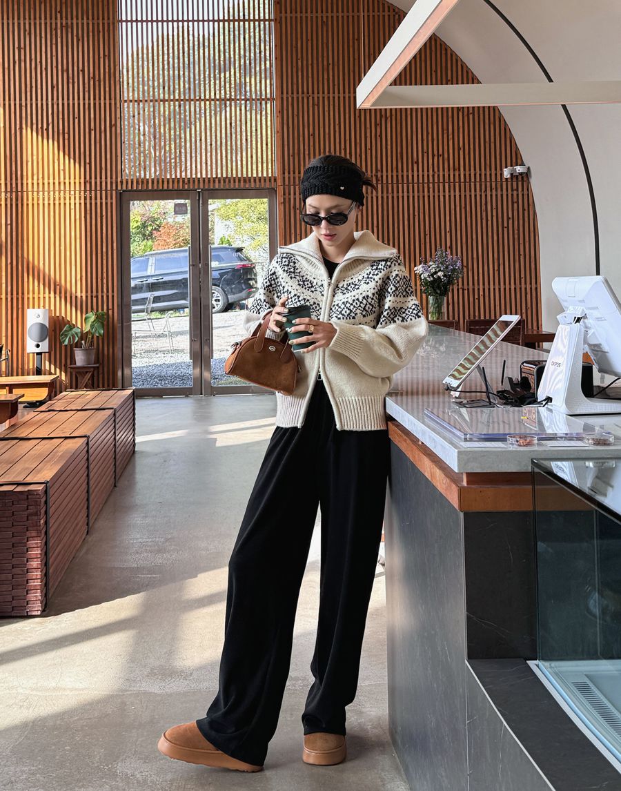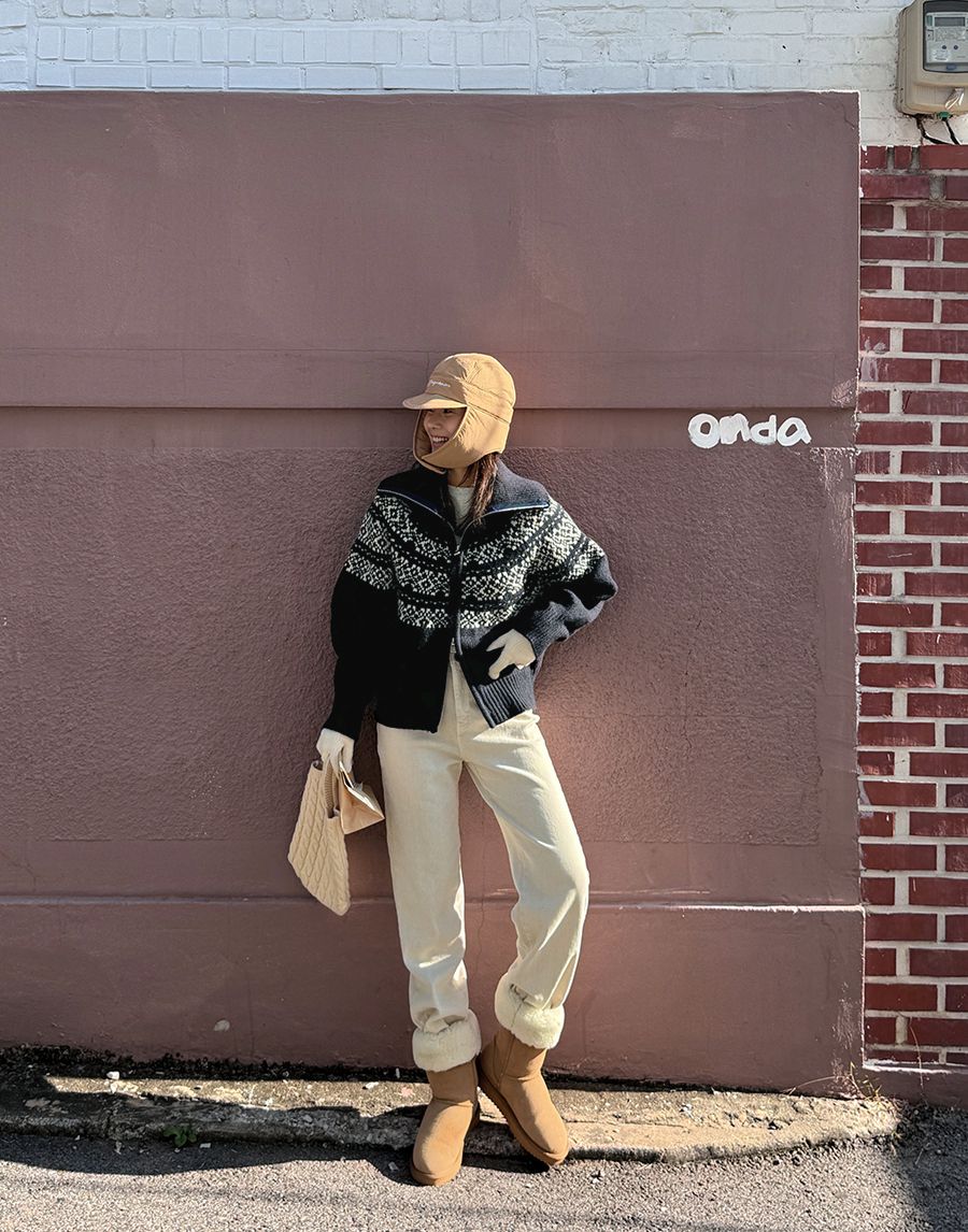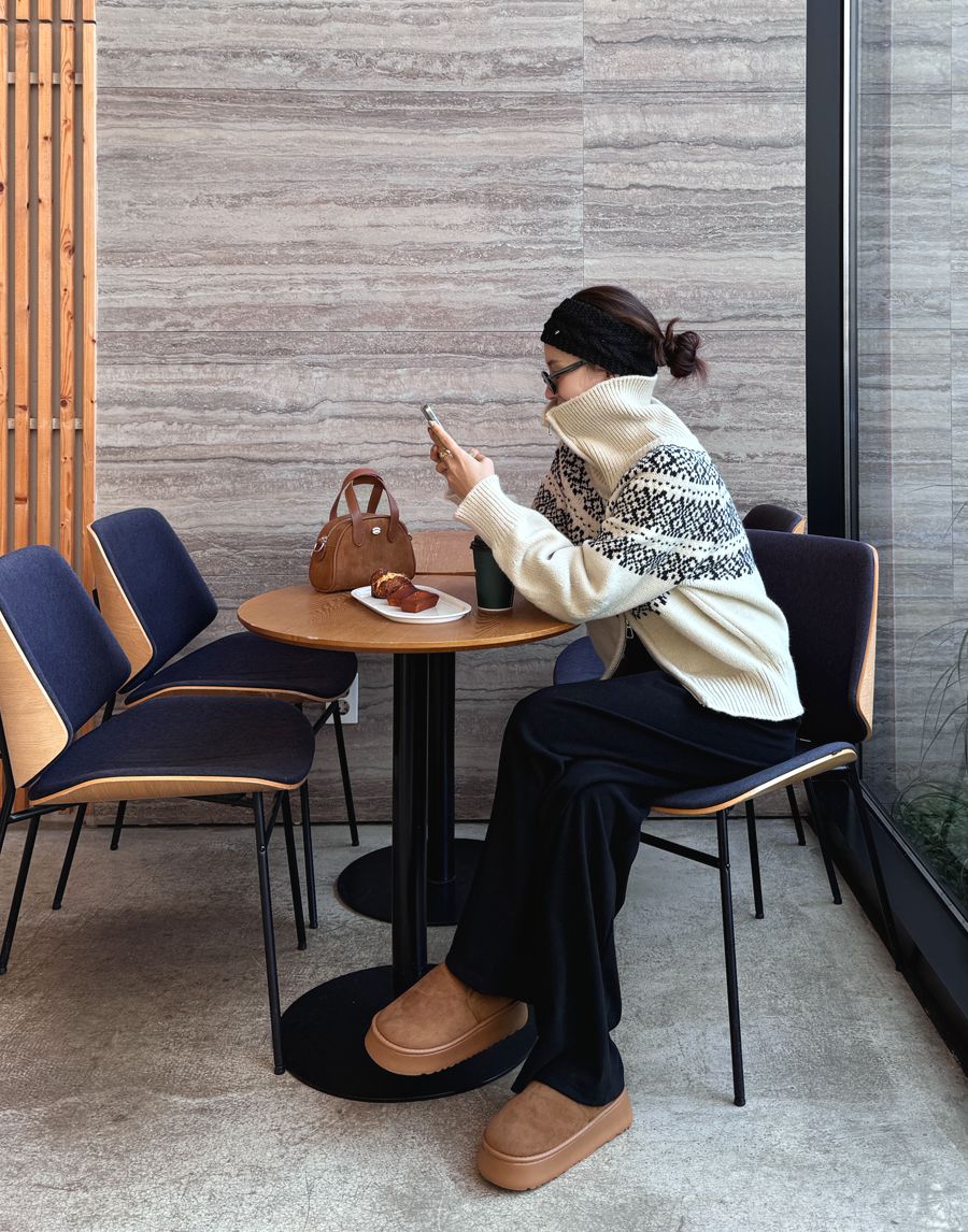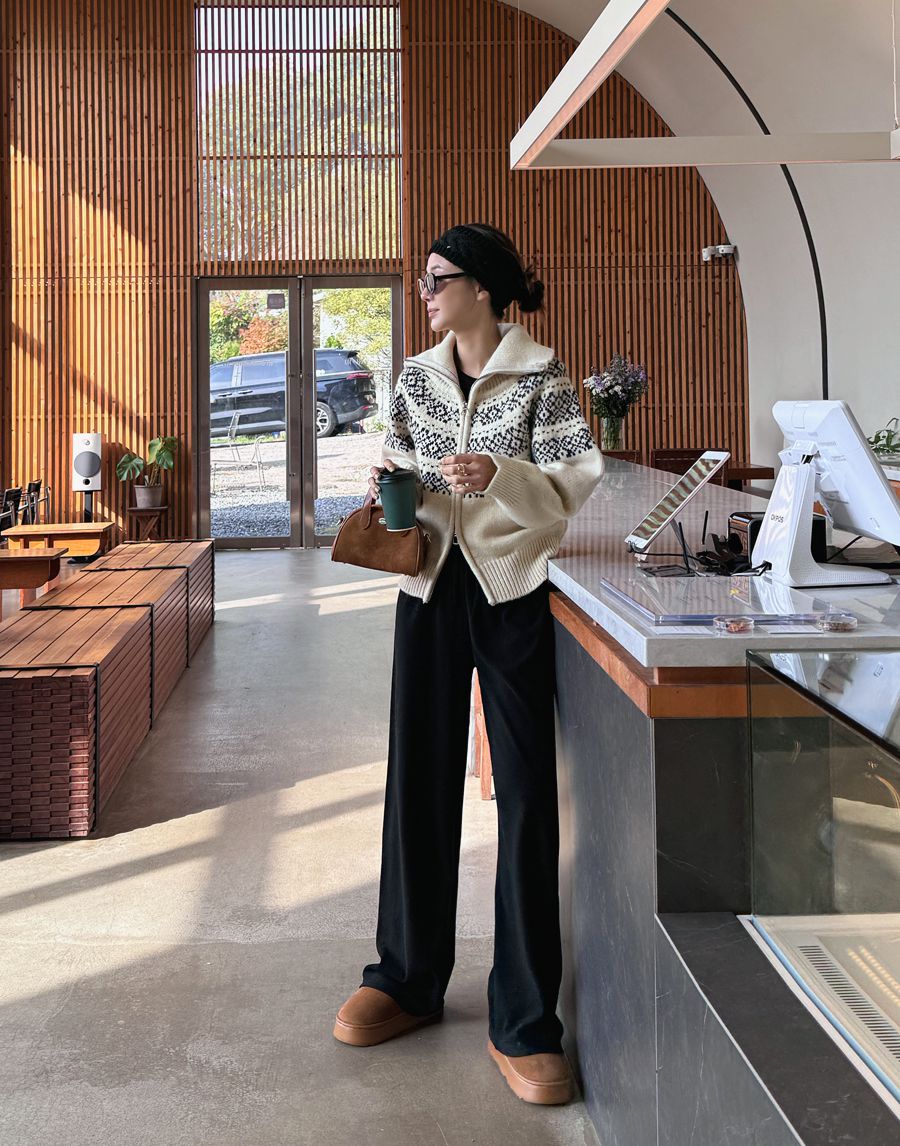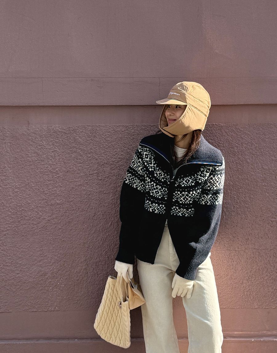 【C55682】韓國MBL 雪花紋針織外套-圖騰印花高領厚磅長袖拉鍊外套