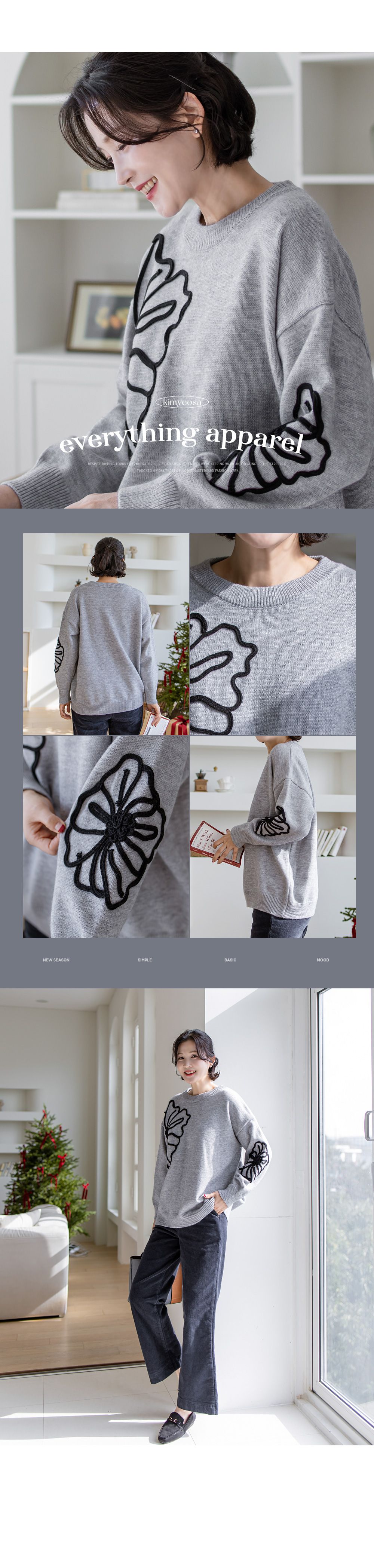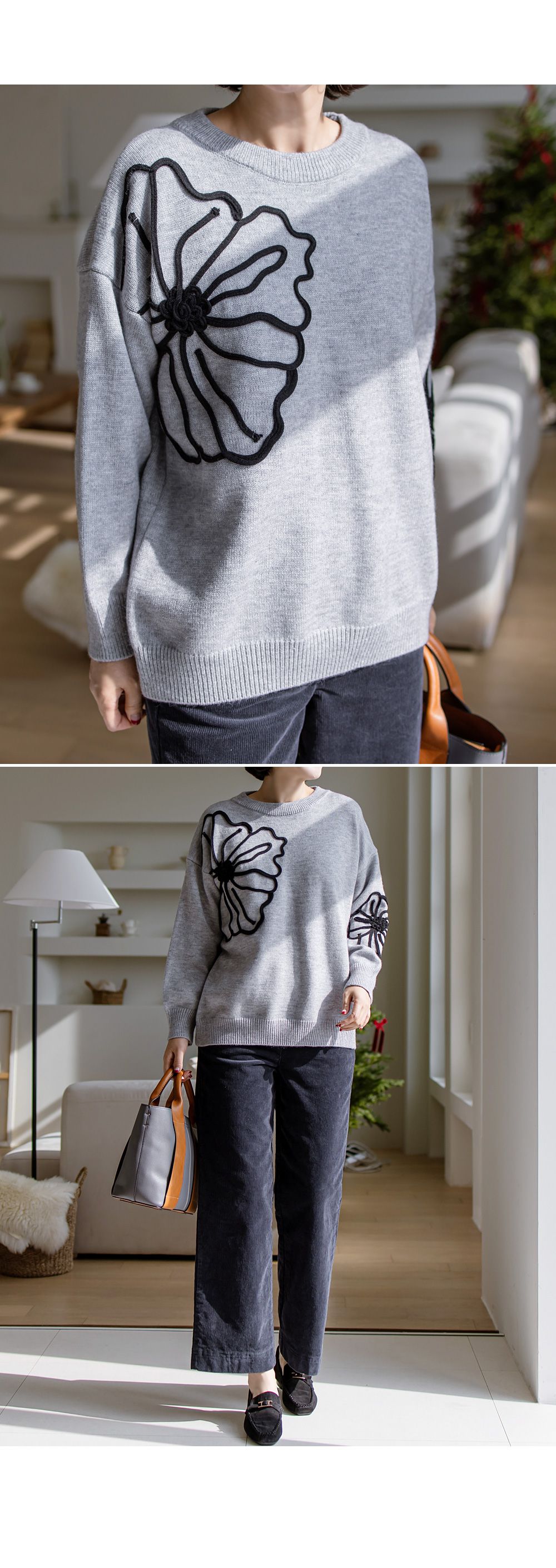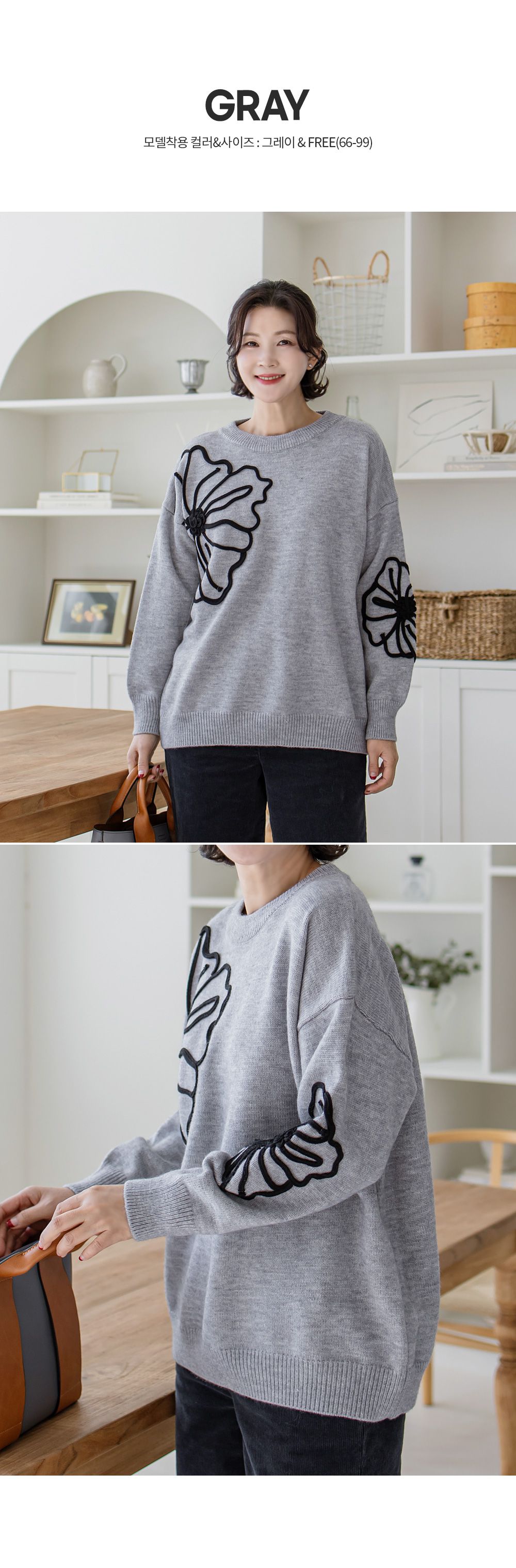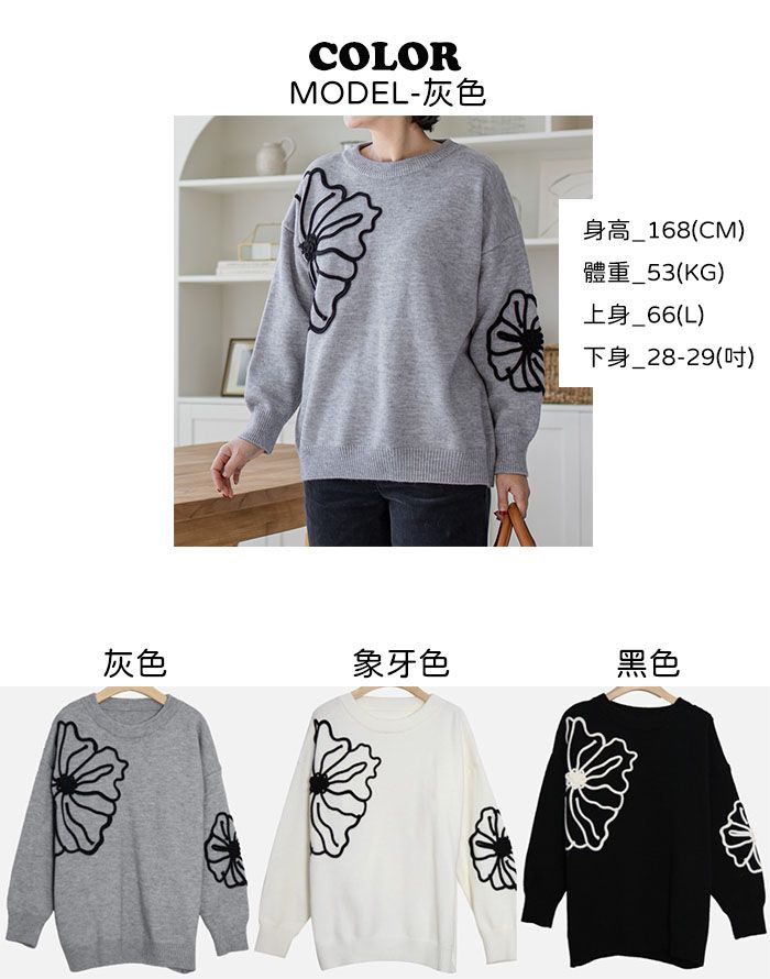 立體花朵印花/毛線雕花/圓領 - 休閒居家花朵印花毛線雕花針織衫針織上衣落肩長袖上衣灰色象牙色黑色