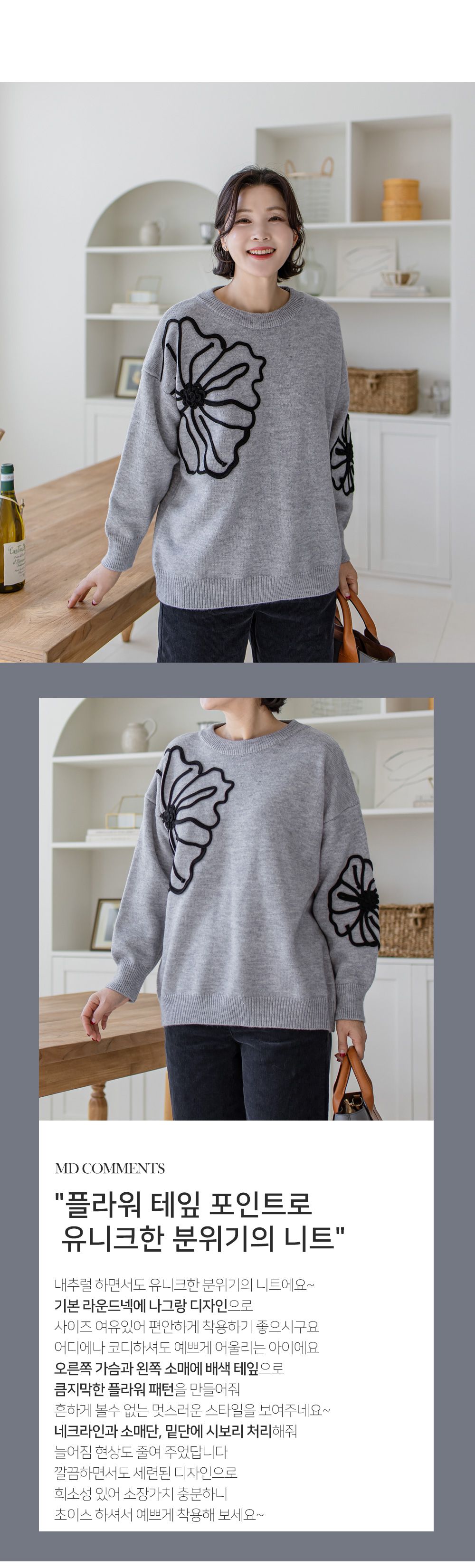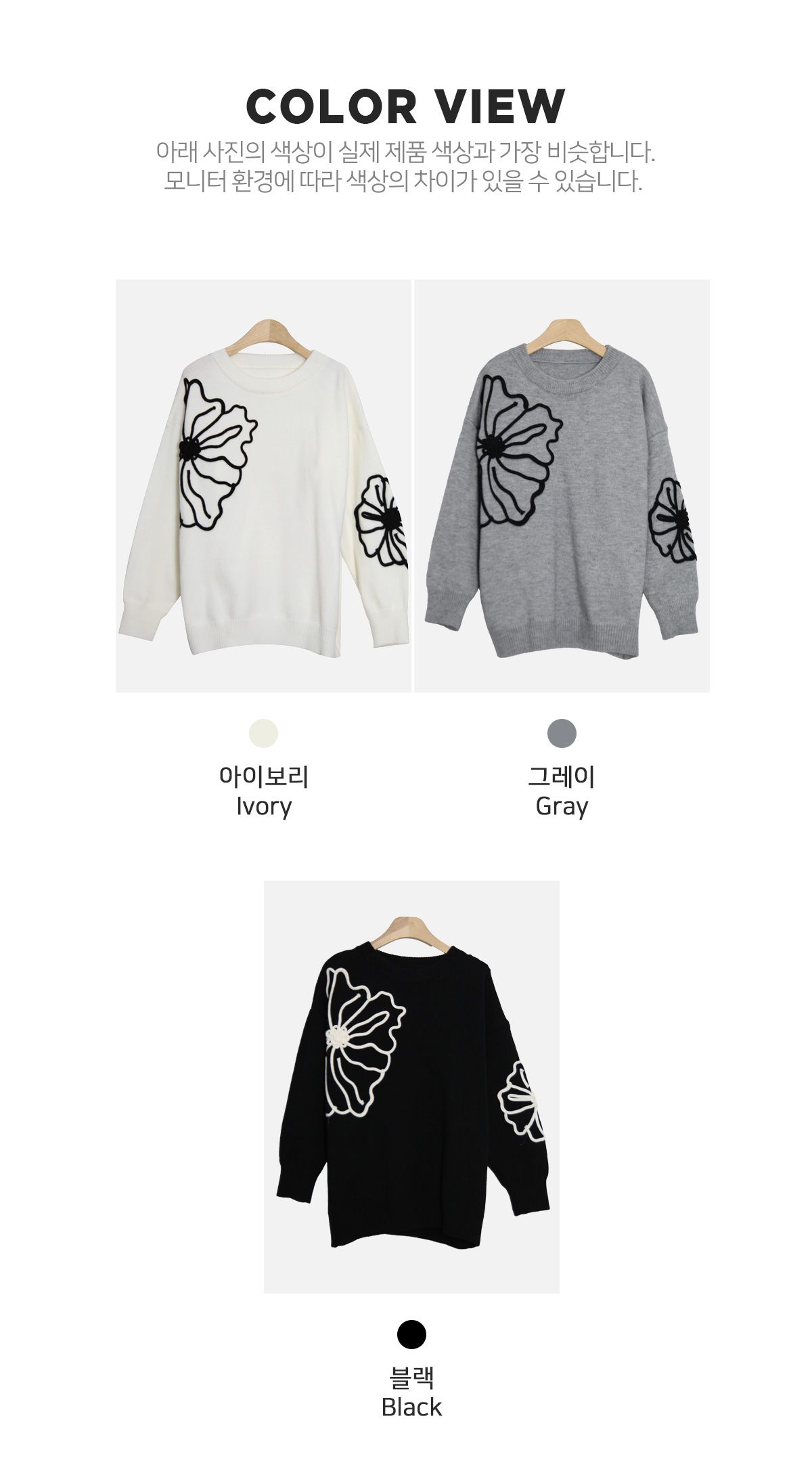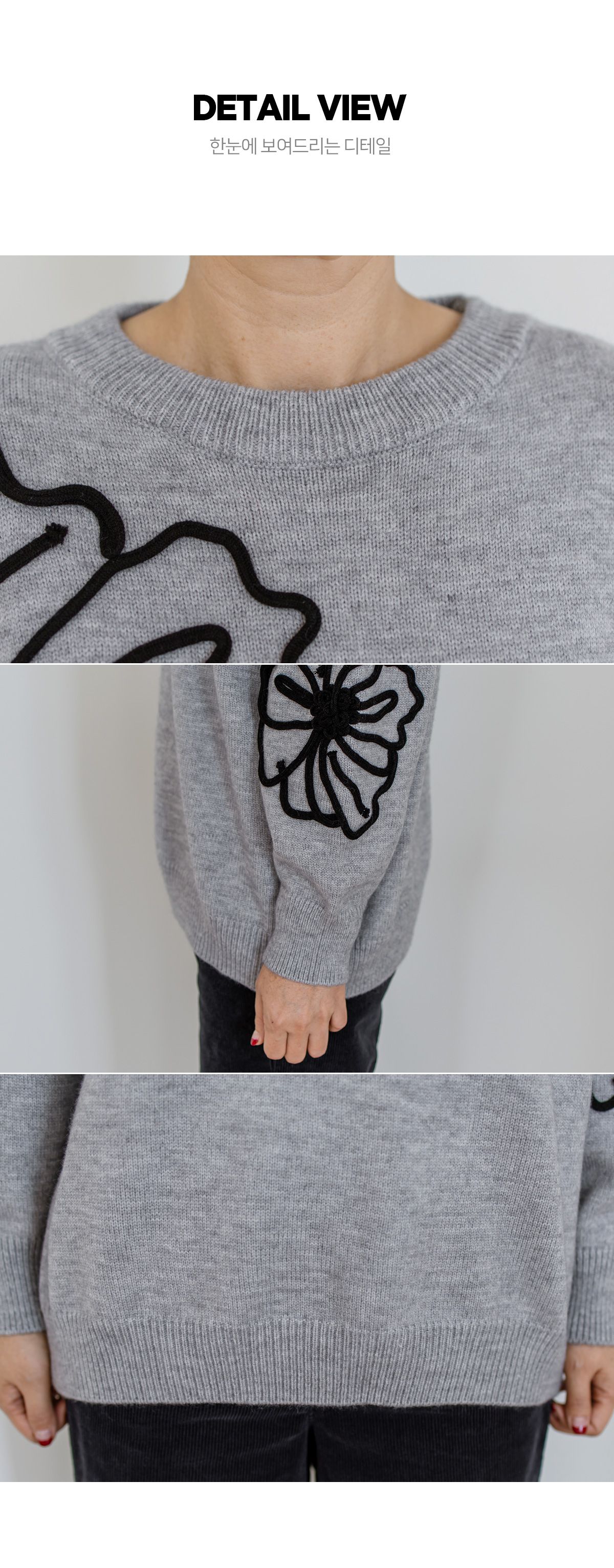 立體花朵印花/毛線雕花/圓領 - 休閒居家花朵印花毛線雕花針織衫針織上衣落肩長袖上衣灰色象牙色黑色