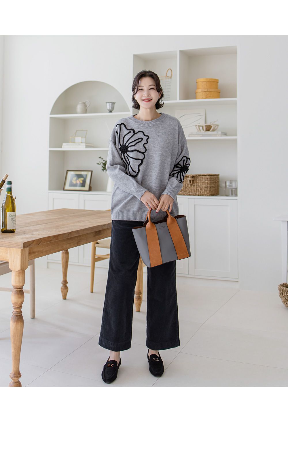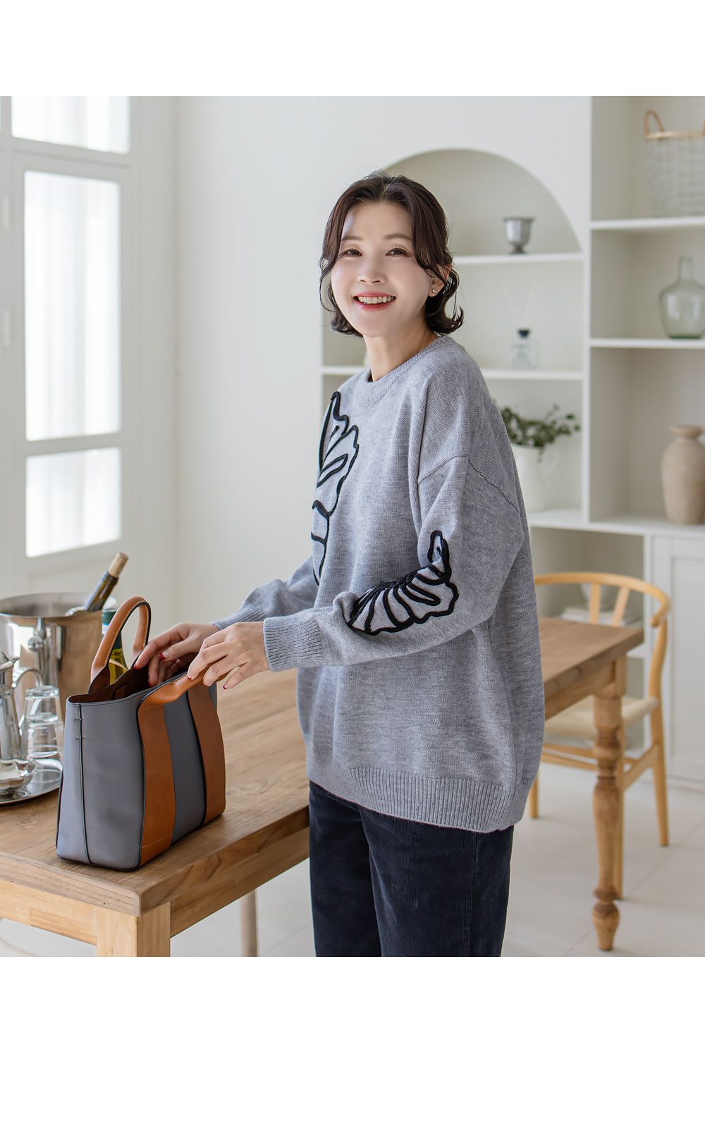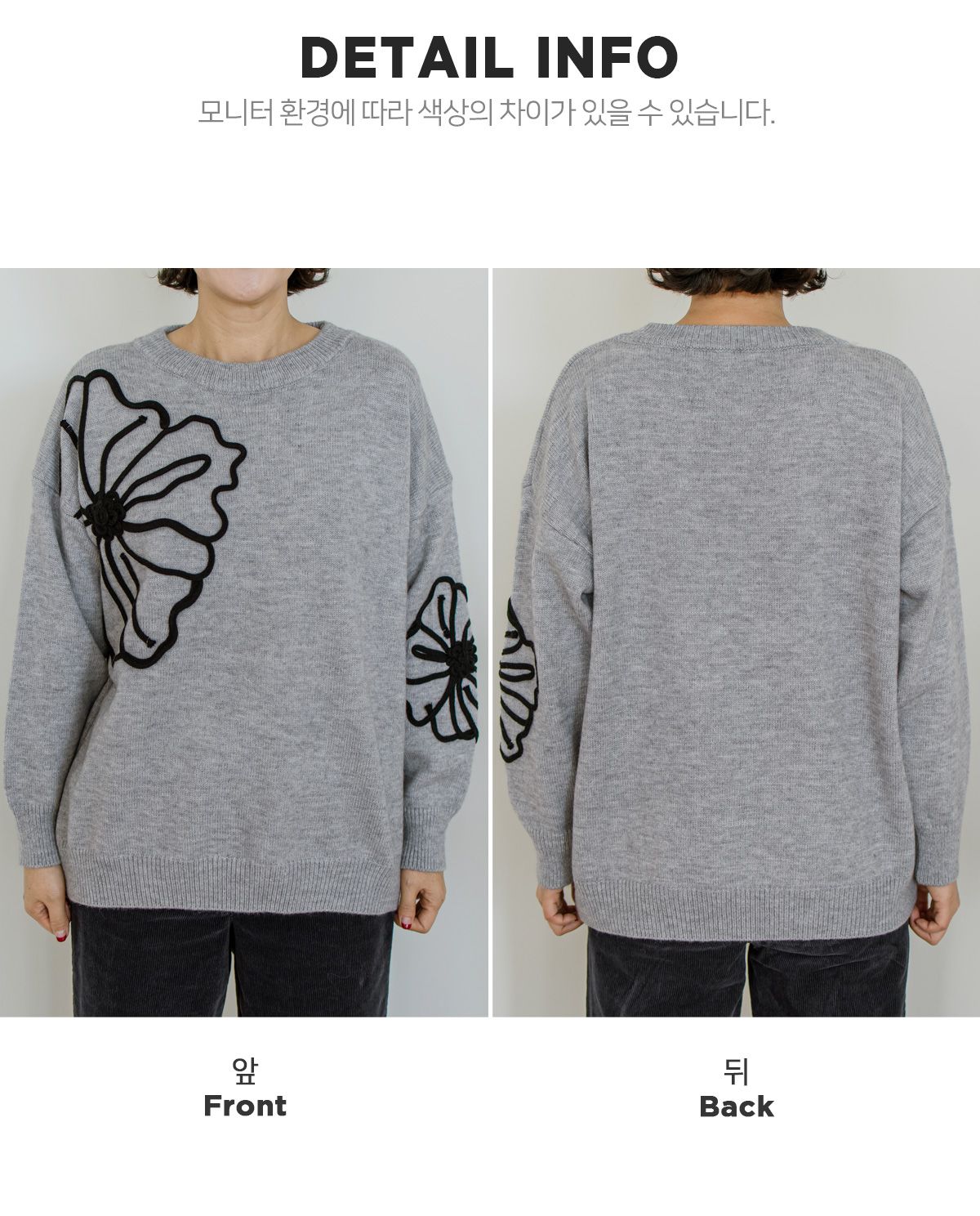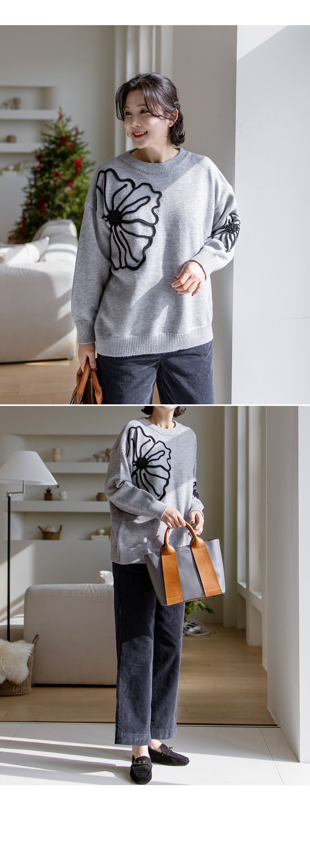 立體花朵印花/毛線雕花/圓領 - 休閒居家花朵印花毛線雕花針織衫針織上衣落肩長袖上衣灰色象牙色黑色