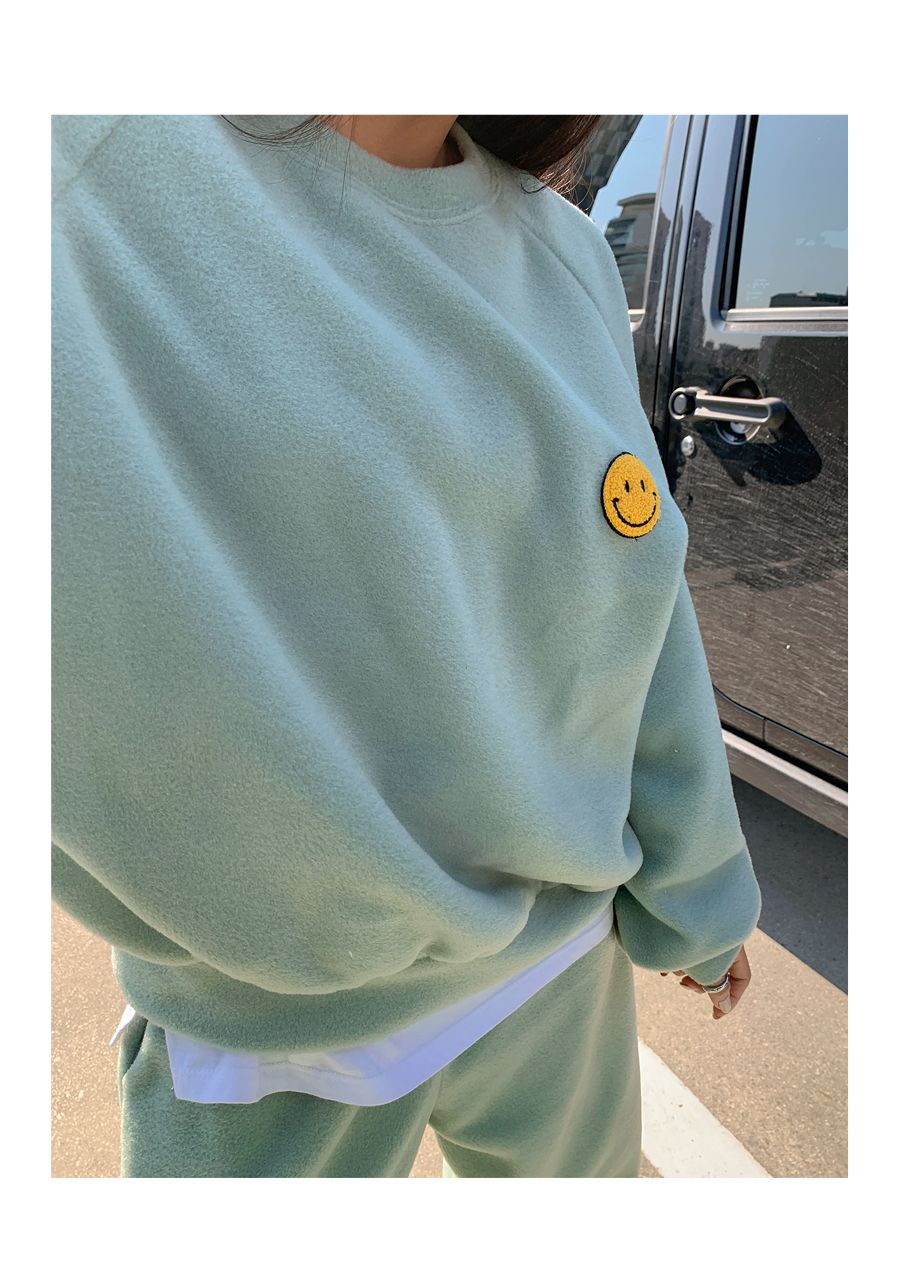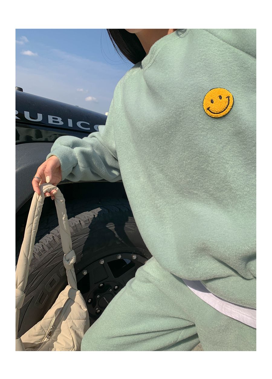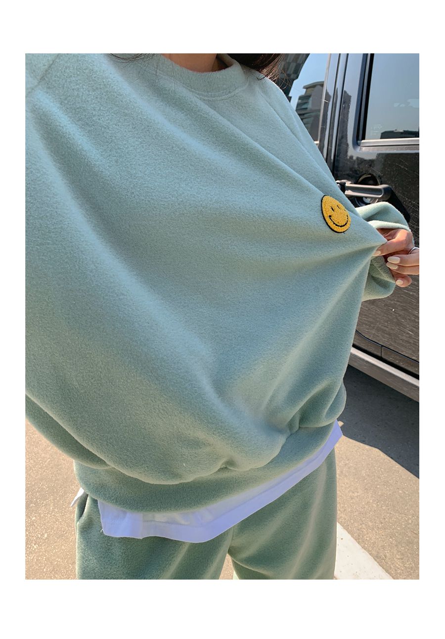 超值兩件組/毛呢面料/絨布面料/微笑布標/圓領/寬鬆長版上衣/全腰鬆緊/雙口袋/束口褲/好氣色 - 休閒居家兩件式套裝運動套裝笑臉印花套裝長袖上衣束