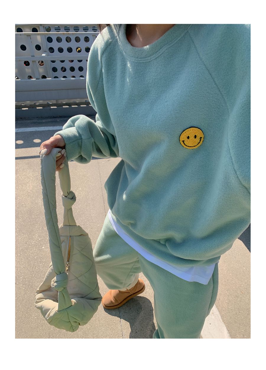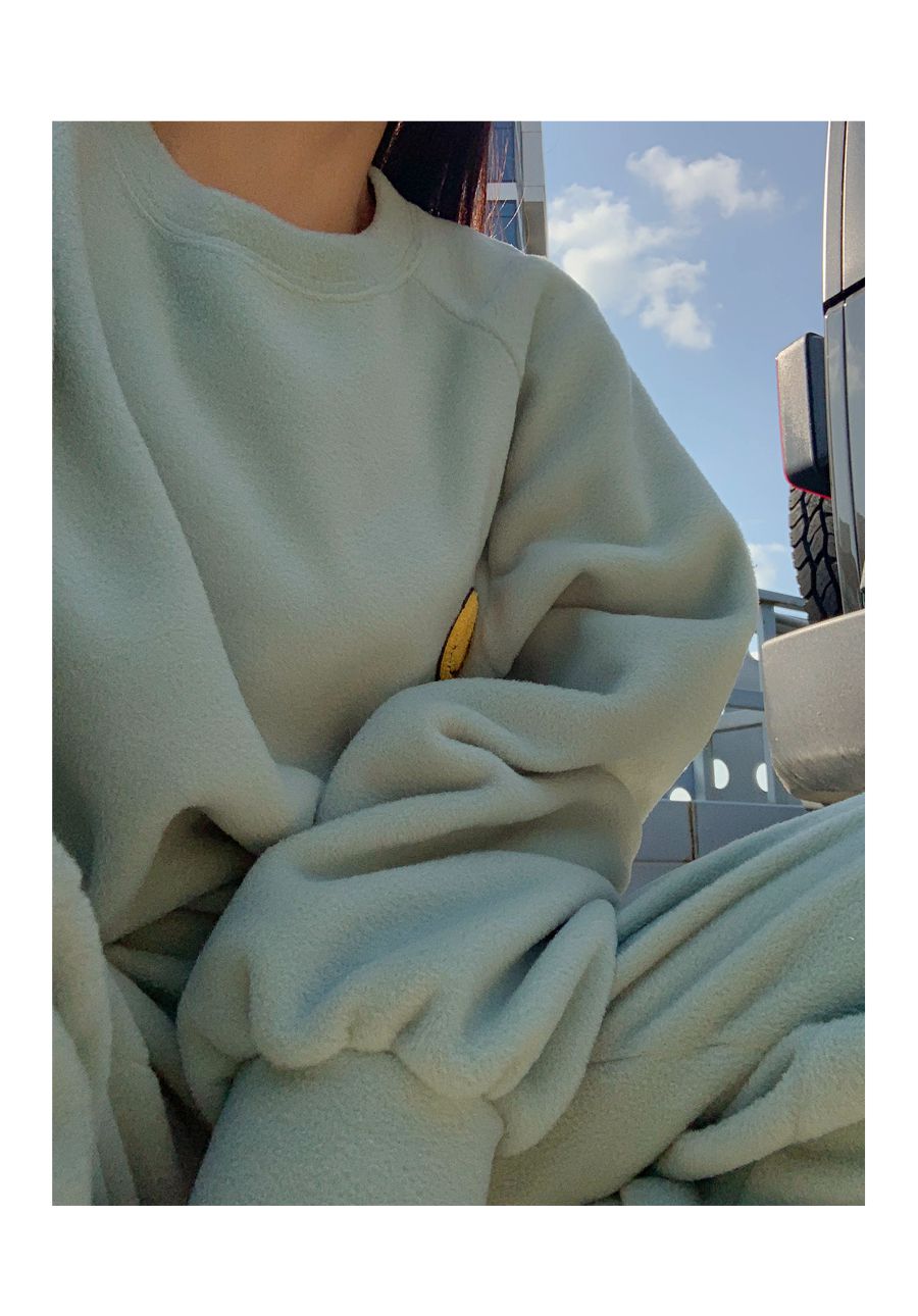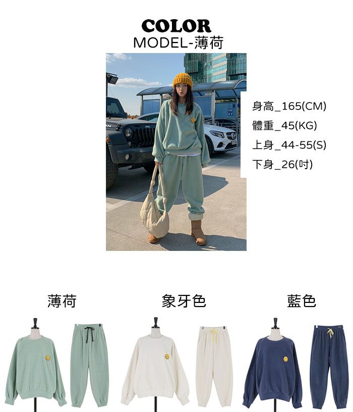 超值兩件組/毛呢面料/絨布面料/微笑布標/圓領/寬鬆長版上衣/全腰鬆緊/雙口袋/束口褲/好氣色 - 休閒居家兩件式套裝運動套裝笑臉印花套裝長袖上衣束
